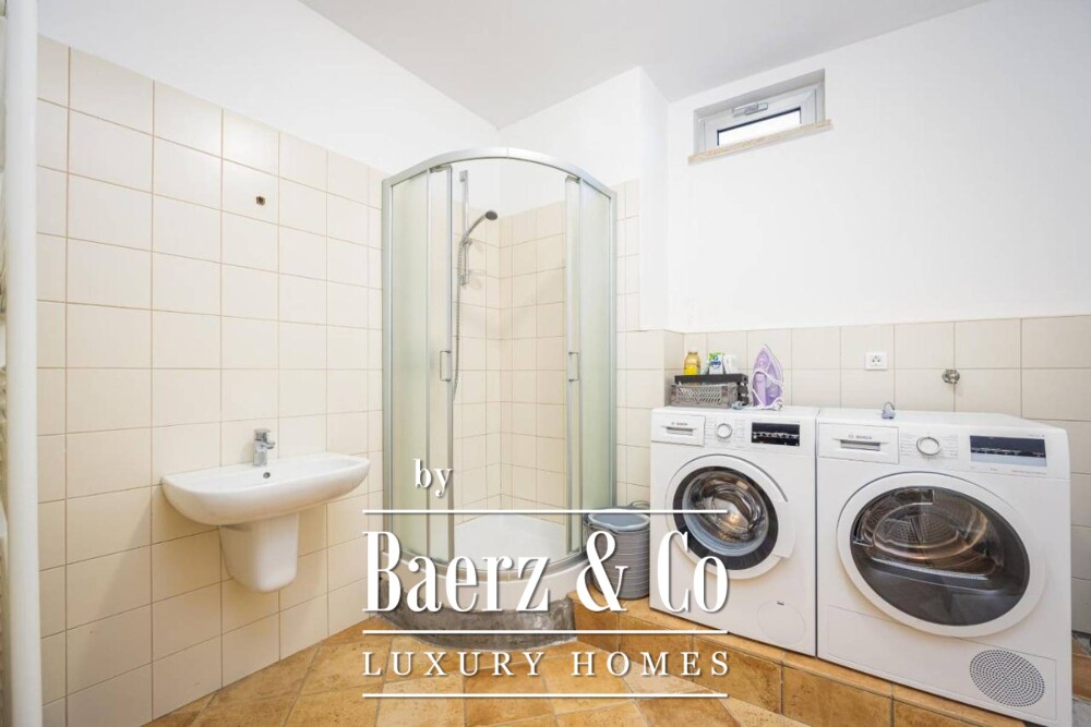 يشمل التخطيط أربع غرف نوم وأربع حمامات، جميعها مزودة بتشطيبات خزفية إيطالية فاخرة موزعة على مستويين منظمين بعناية. يضمن نظام تكييف الهواء والتدفئة المركزية الراحة في جميع الفصول. في الطابق السفلي تتوفر مرافق غسيل مخصصة، حمام إضافي، ومساحة ترفيهية.