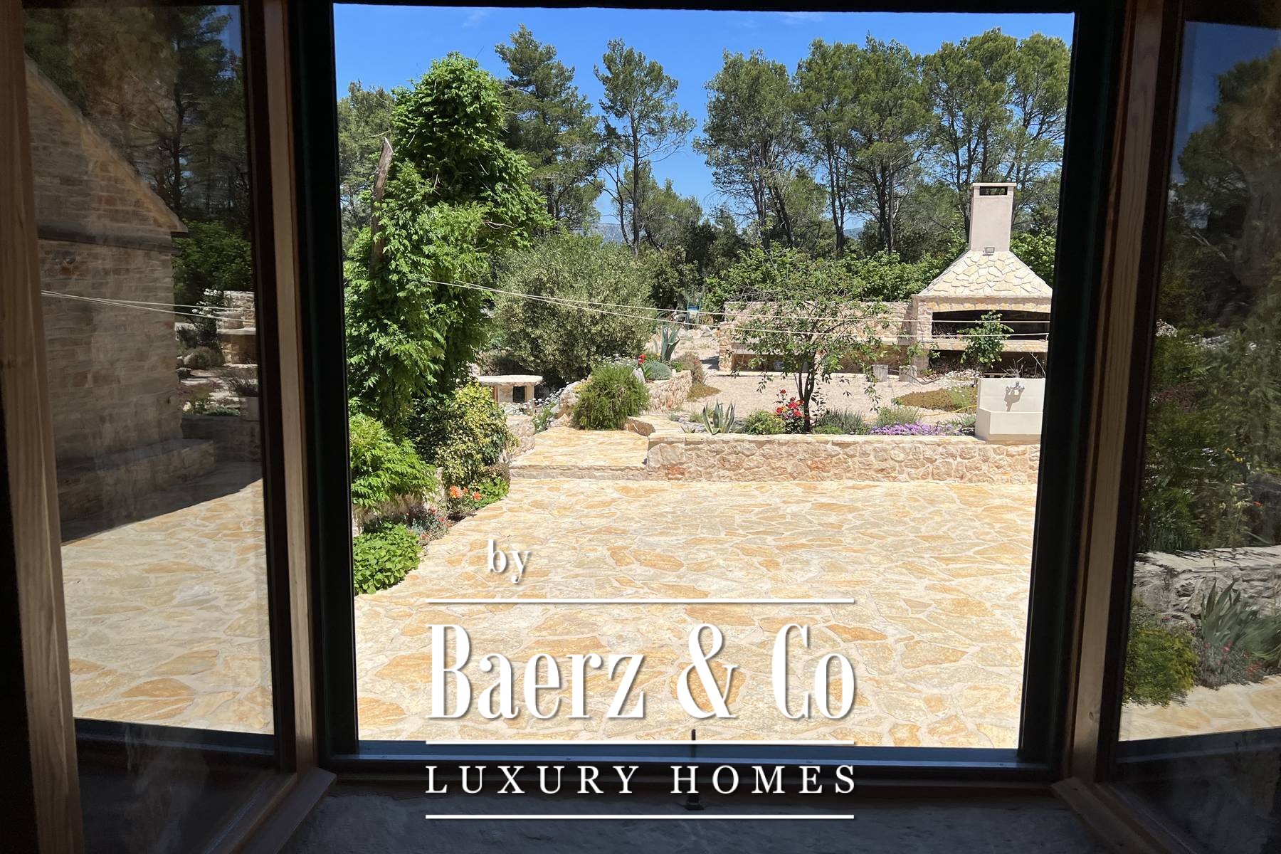 توفر المباني المساعدة الثلاثة مساحات إضافية للترفيه والمعيشة والخدمات؛ إحداها تضم مطبخًا وموقدًا ومنطقة تناول طعام واسعة، والأخرى تستخدم كمغسلة مع حمام إضافي، أما الثالثة فتقدم جناح ضيوف مريح. يكتمل المشهد الخارجي بمسبح كبير وحديقة متوسطية مزدهرة تضم أكثر من مائة شجرة زيتون وخزامى وإكليل الجبل وحمضيات ونبات الخلود.