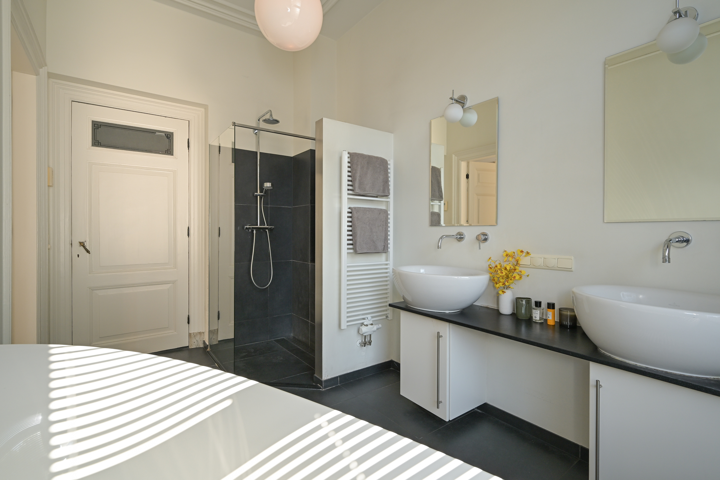 The 2nd floor (surface area ca. 88 m2, ceiling height 2.97 meters) has wooden flooring throughout and a landing that is bathed in sunlight from a large skylight, plus a separate wc. There is an especially bright, good-sized front room with a dormer and high ceiling, as well as a big back bedroom - both with built-in wardrobes. Two smaller rooms, of which one houses the laundry, offer the possibility of creating a second bathroom, see artist impresion (cost circa €16.000 - €18.000; quotation available). The back rooms have partially unobstructed views over the iconic Haganum building.