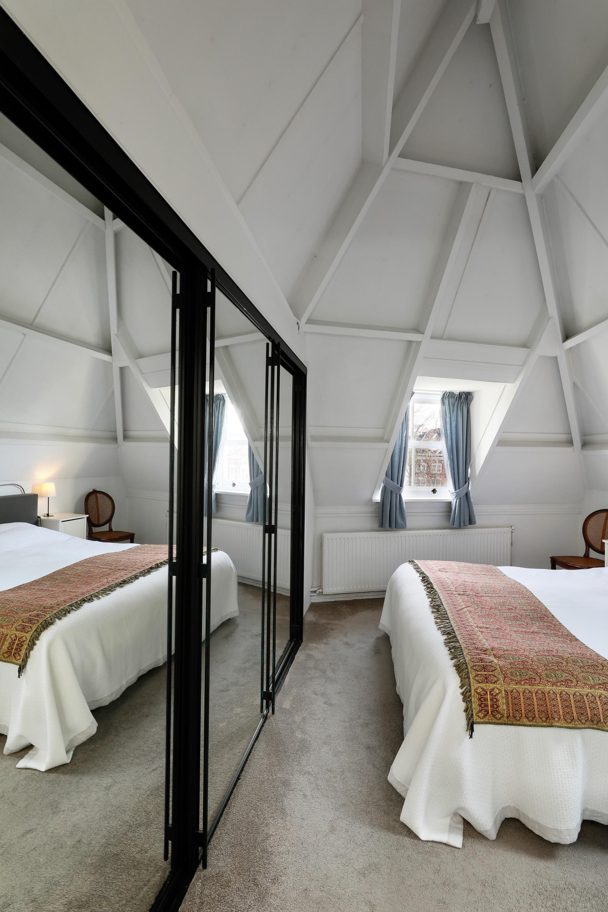 The upper floor features two bedrooms. The main bedroom is located at the front under the roof and has a charming atmosphere thanks to the high ceiling and dormer window. The second bedroom is also spacious and versatile.