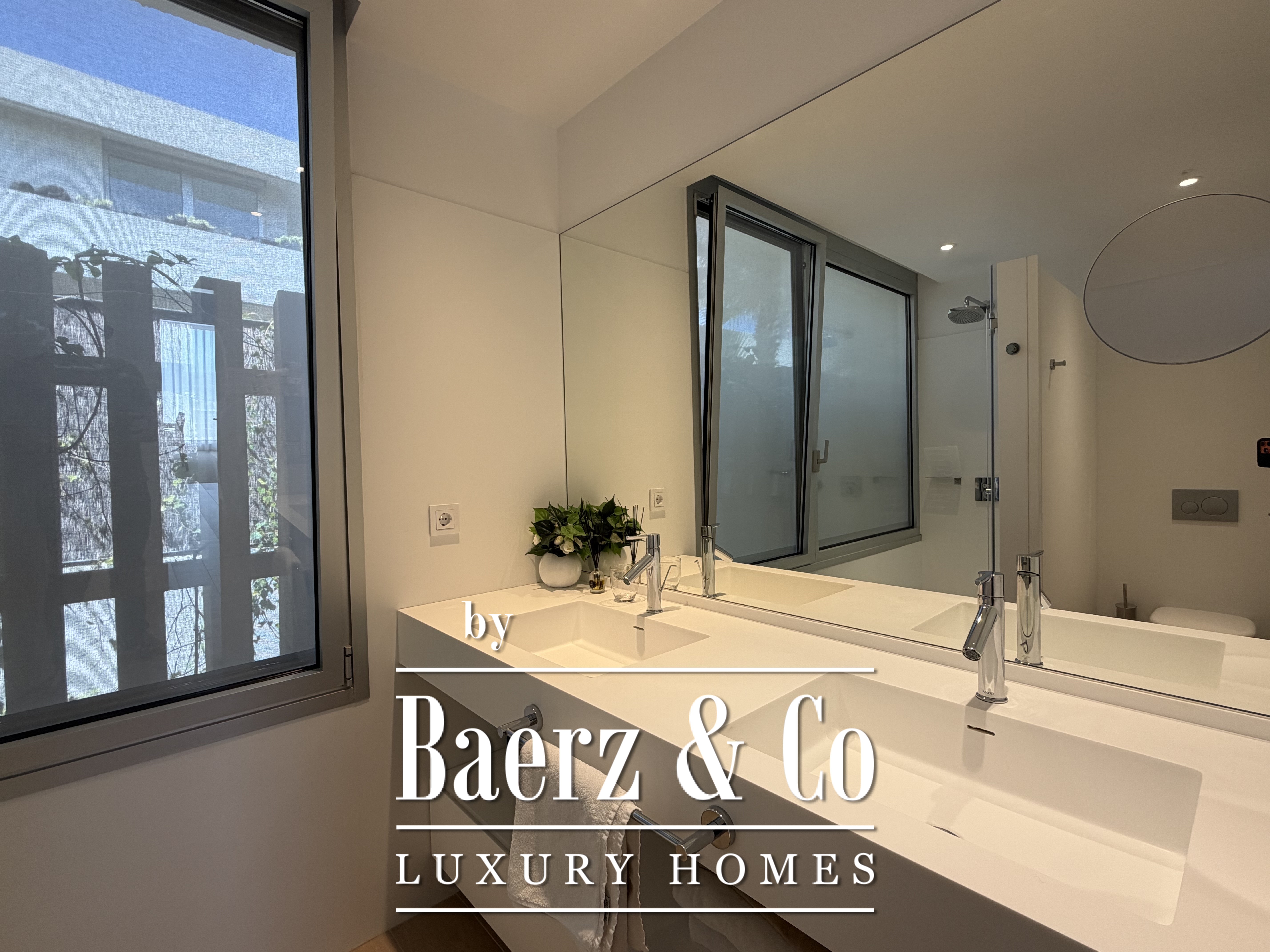 Natural light fills the interiors through expansive windows, framing the horizon and creating seamless access to the terrace and landscaped garden. Three bedrooms offer dressing rooms, while two bathrooms feature modern showers, underscoring the emphasis on refined functionality. The bright living room invites relaxation, whether enjoying a quiet moment or sharing the space with guests.
