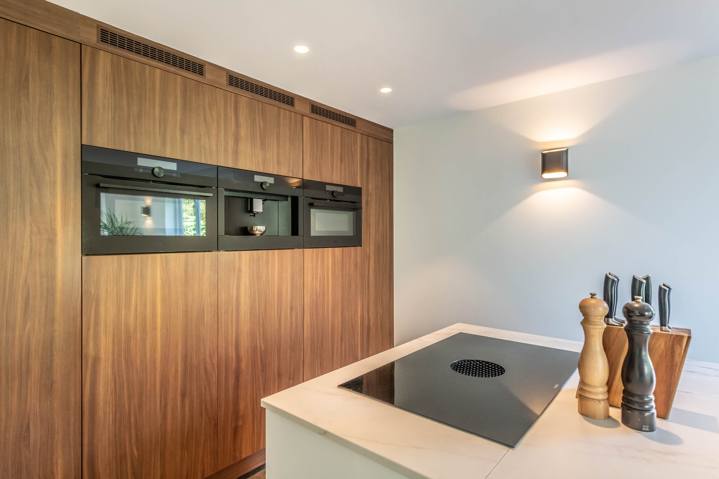 Entrance hall, spacious hallway with toilet and urinal, bright and spacious living room with fireplace, oak flooring and doors to the front terrace. A double door connects to the second living room/TV room with large windows and a view of the back garden. Luxurious, tailor-made kitchen-diner (’t Spant in Heemstede, 2022) featuring underfloor heating, a sink/kitchen island and various built-in appliances: wine climate cabinet, ovens, Quooker with sparkling water feature, coffee machine, Bora electric hob with flex zones and dishwasher. Door to the side garden.