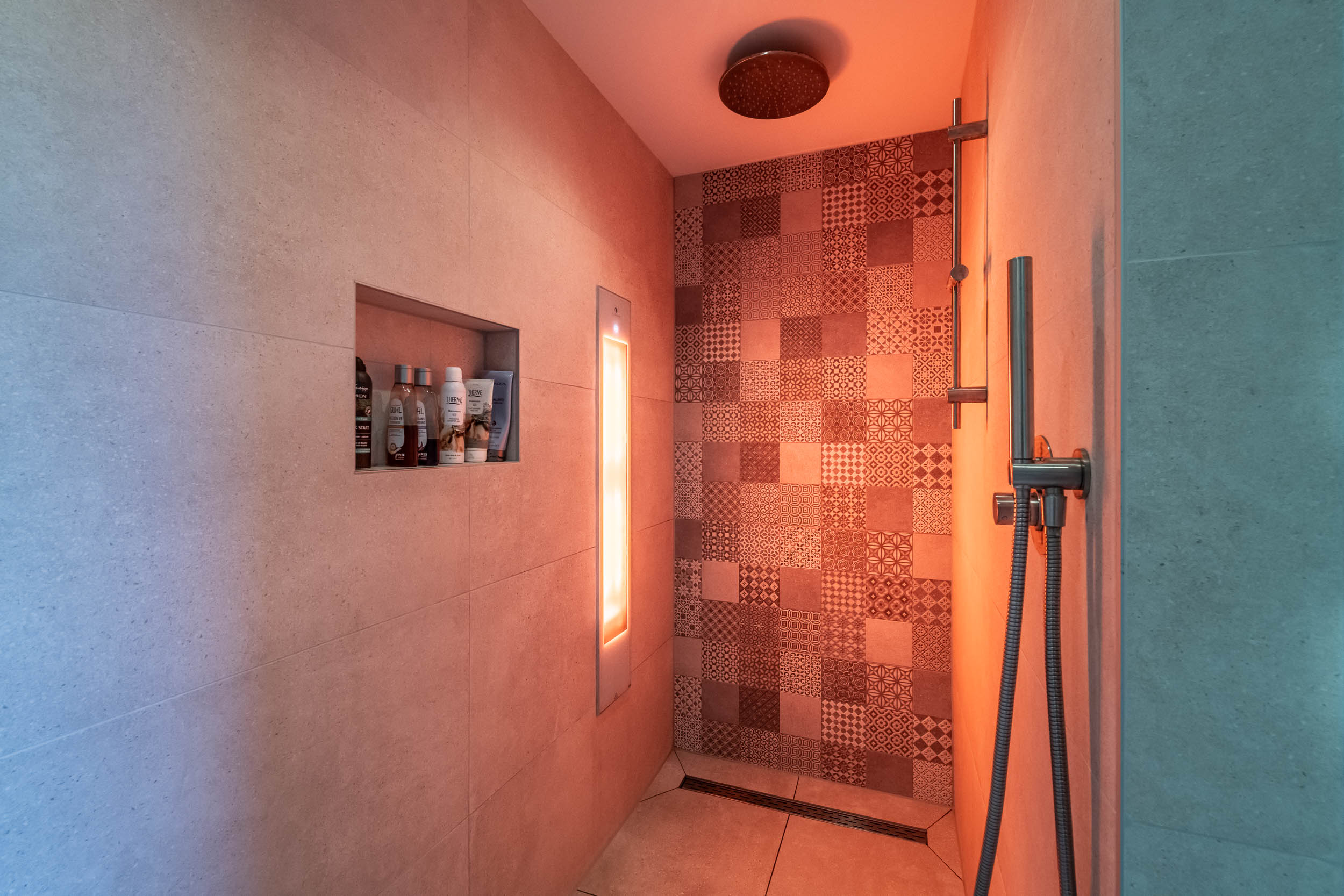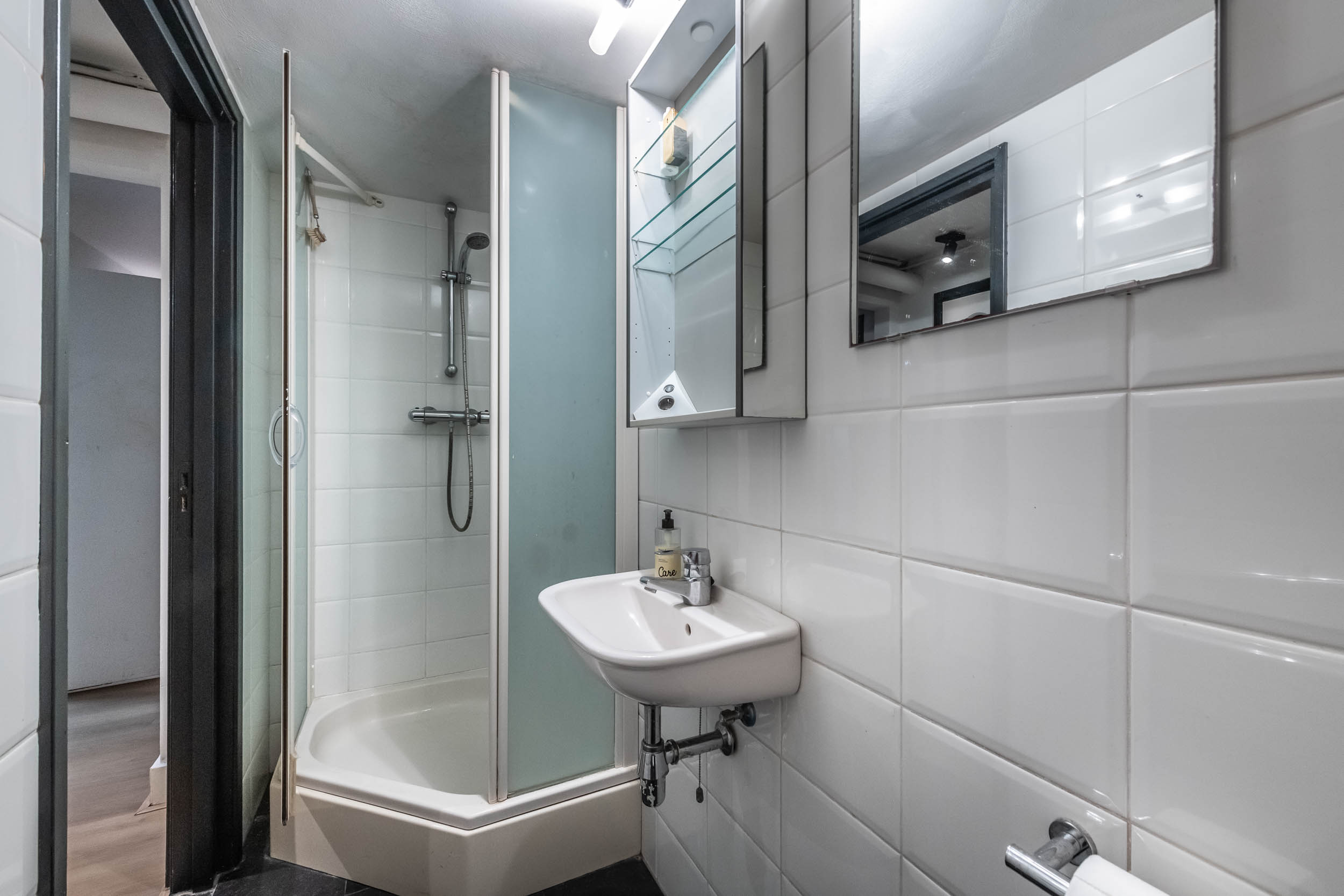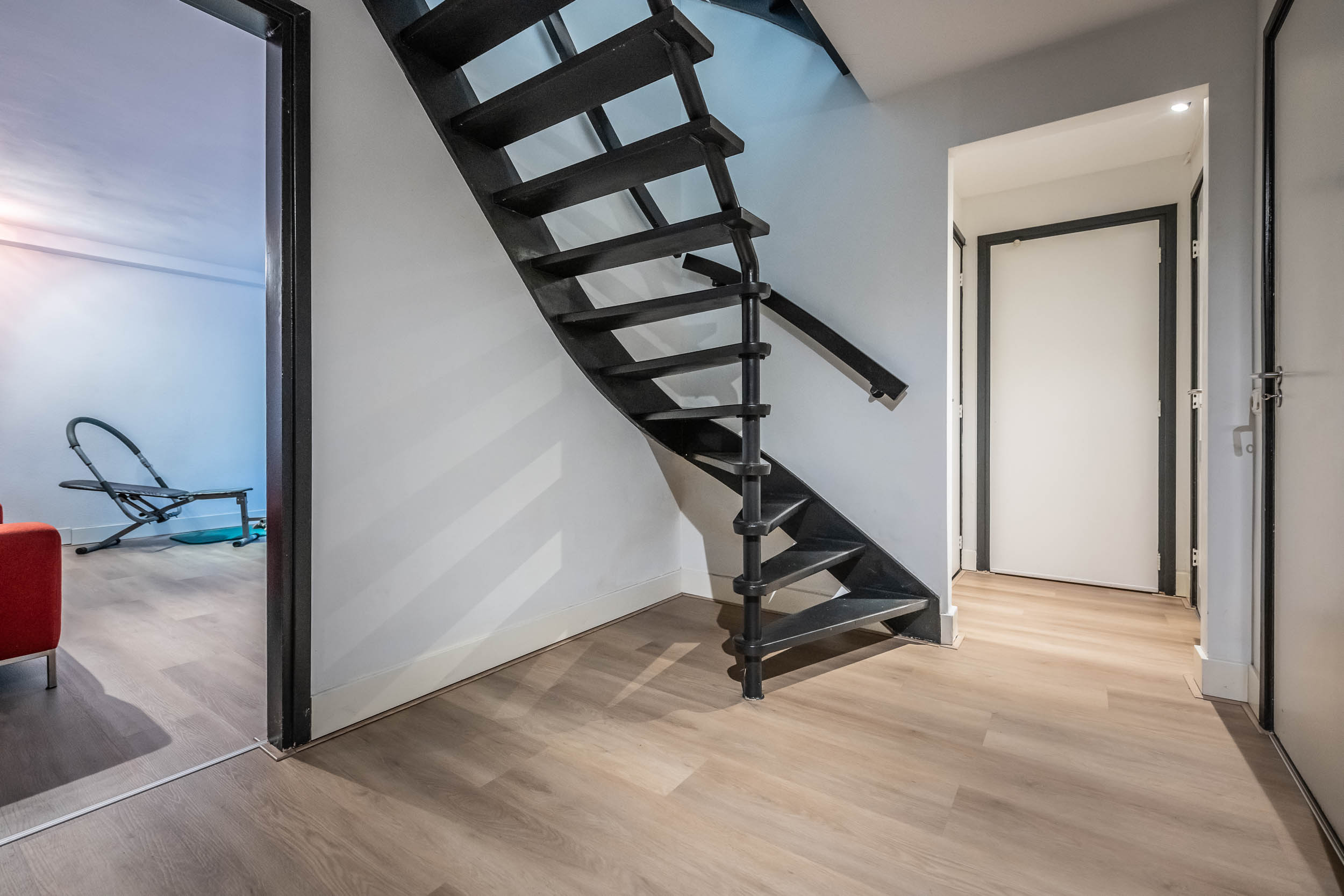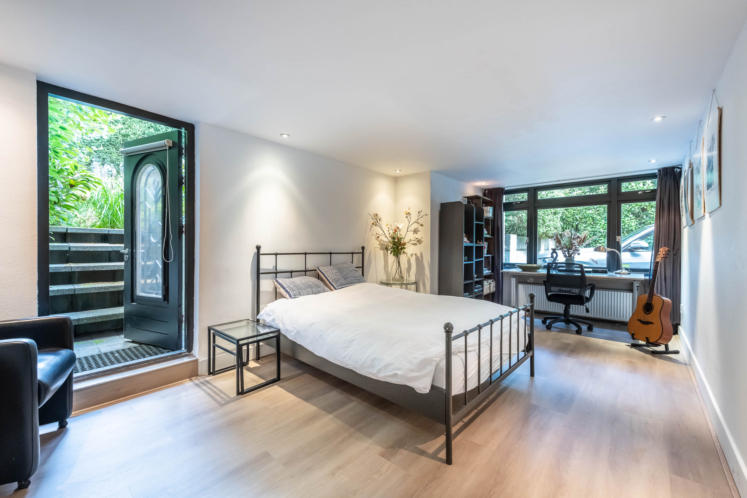Landing, three bedrooms, including the spacious master bedroom (formerly two rooms) with walk-in wardrobes on both sides. Modern, tailor-made bathroom (’t Spant in Heemstede, 2022) with large dormer window, double washbasin unit, toilet, ample cupboard space, underfloor heating, freestanding bathtub, walk-in shower with Sunshower and hand shower.