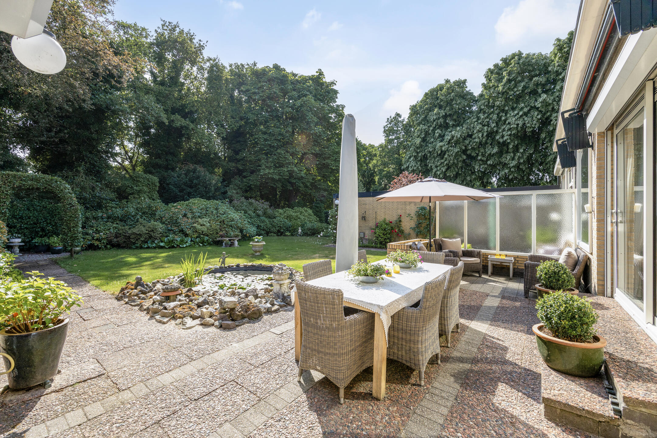 Upon entering a spacious living room with separate dining room, you are immediately embraced by the lightness brought by the numerous windows. The spacious sliding doors in the living room open onto a spacious panorama, where a lushly landscaped garden stretches out. The sun-drenched terrace, with garden lighting and a pond, offers a serene invitation to relax. The surrounding green oasis guarantees total privacy. The garden, with its spring drainage and sprinkler system, is lovingly maintained.
