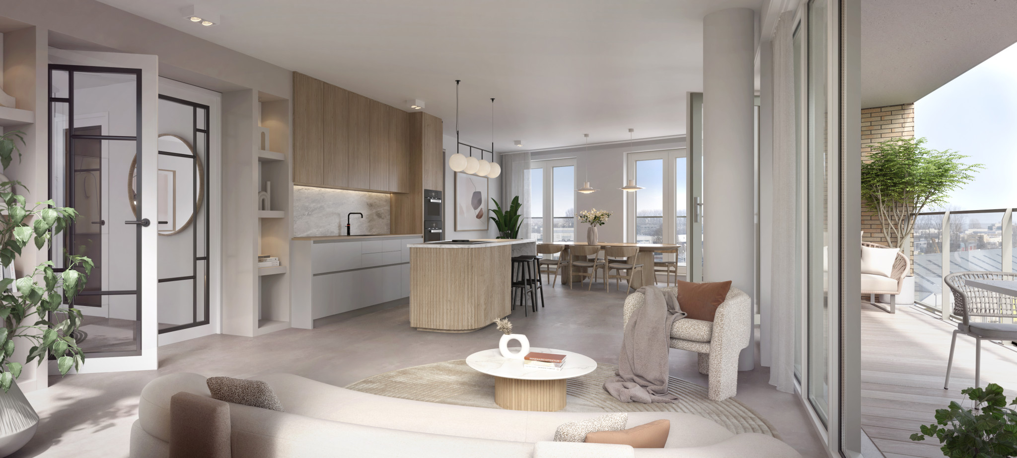 De indrukwekkende woonkamer met mogelijkheid tot open keuken van bijna 94 m² is het hart van het penthouse. Dankzij de grote raampartijen en het doorlopende licht ontstaat een prachtig panoramisch gevoel. Het penthouse wordt zonder keuken opgeleverd, maar biedt volop ruimte voor een kookeiland en hoogwaardige inbouwapparatuur, perfect voor wie van koken en gezelligheid houdt.