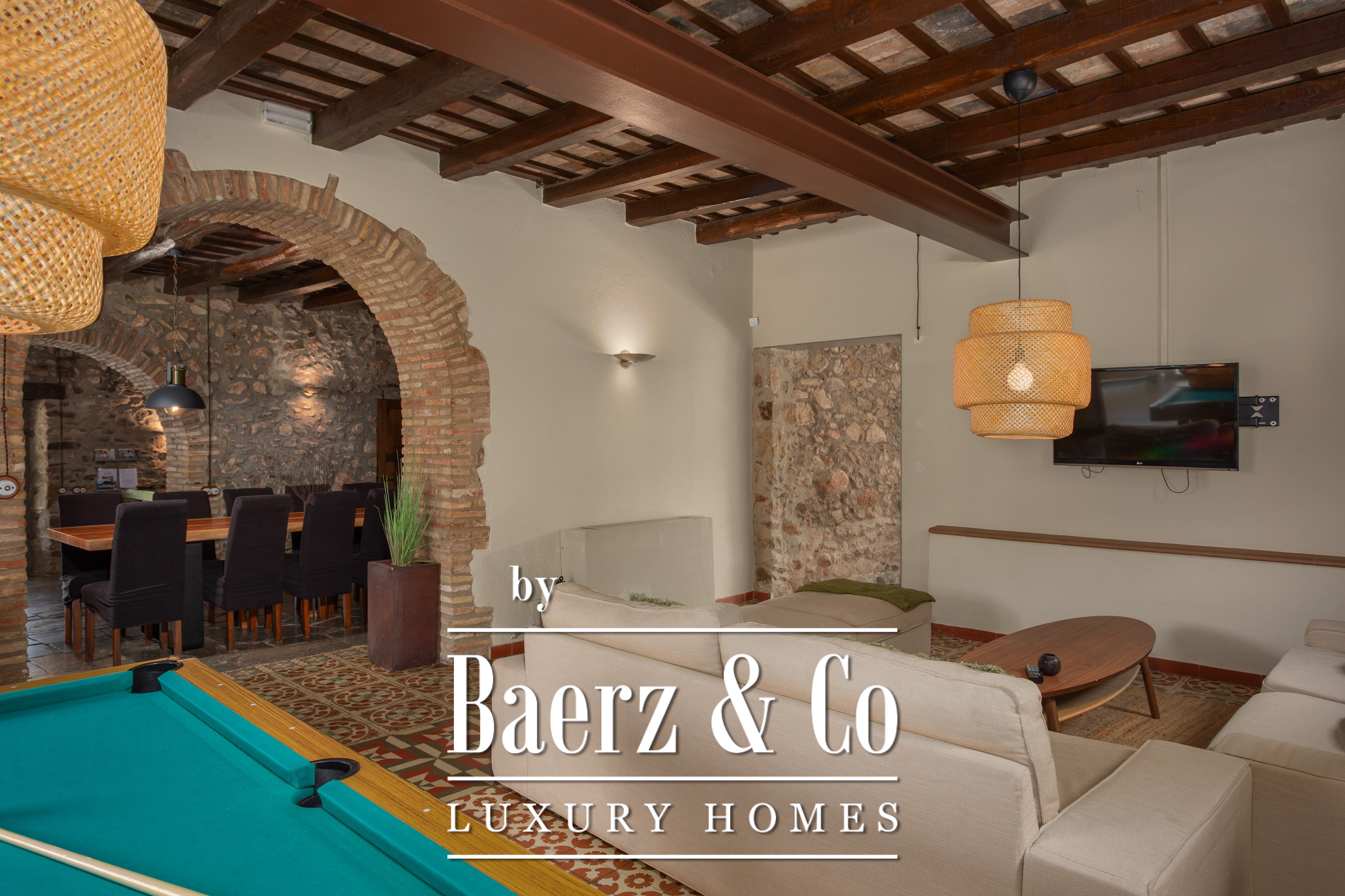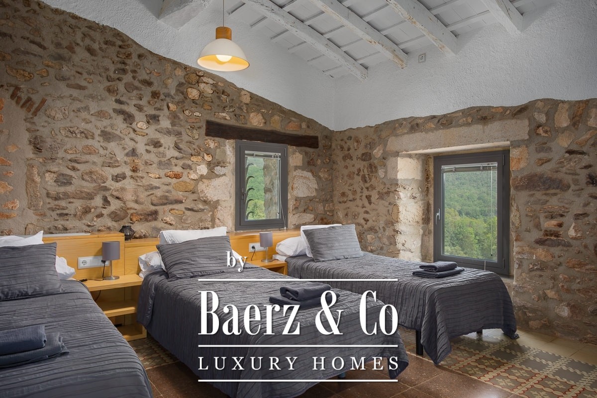 Masia for sale Amer presents a rare opportunity to own an authentic piece of Catalan history. Dating to 1720, this remarkable 645 m² masia has been meticulously restored across a 20,245 m² private estate, elevated above the Amer Valley with uninterrupted views of La Selva and the surrounding mountains. Stone, light, and space define the ambience, while a curated hospitality concept is already established, offering both lifestyle and business continuity. The main residence provides five elegant bedrooms and six bathrooms, refined living spaces, and a professional kitchen. Contemporary comfort coexists with heritage, underscored by air conditioning, heating, and high-speed Wi-Fi throughout. A wellness suite with jacuzzi and dedicated relaxation areas adds a layer of retreat, complemented by terraces and a large illuminated swimming pool tied seamlessly to the manicured gardens.