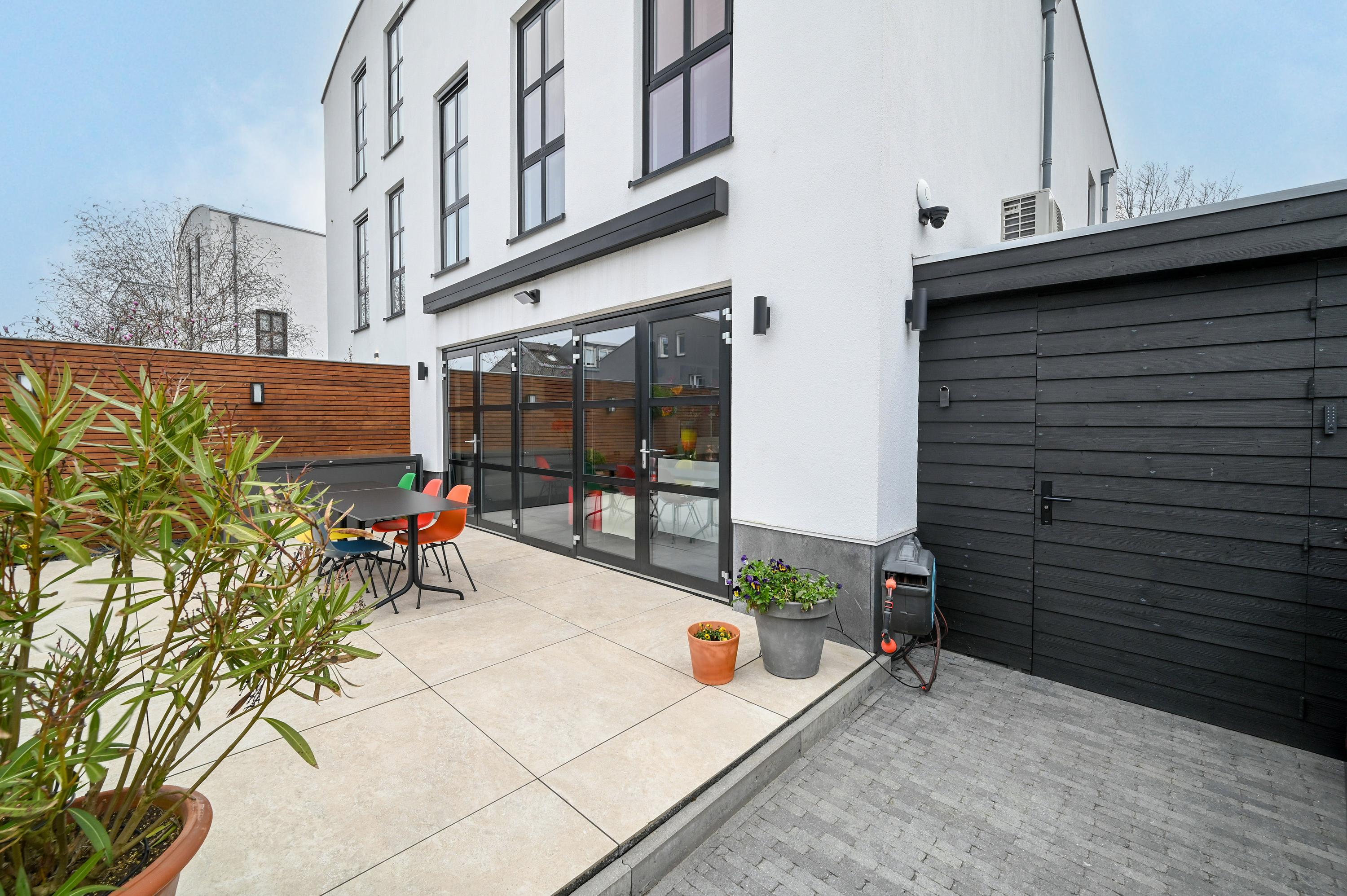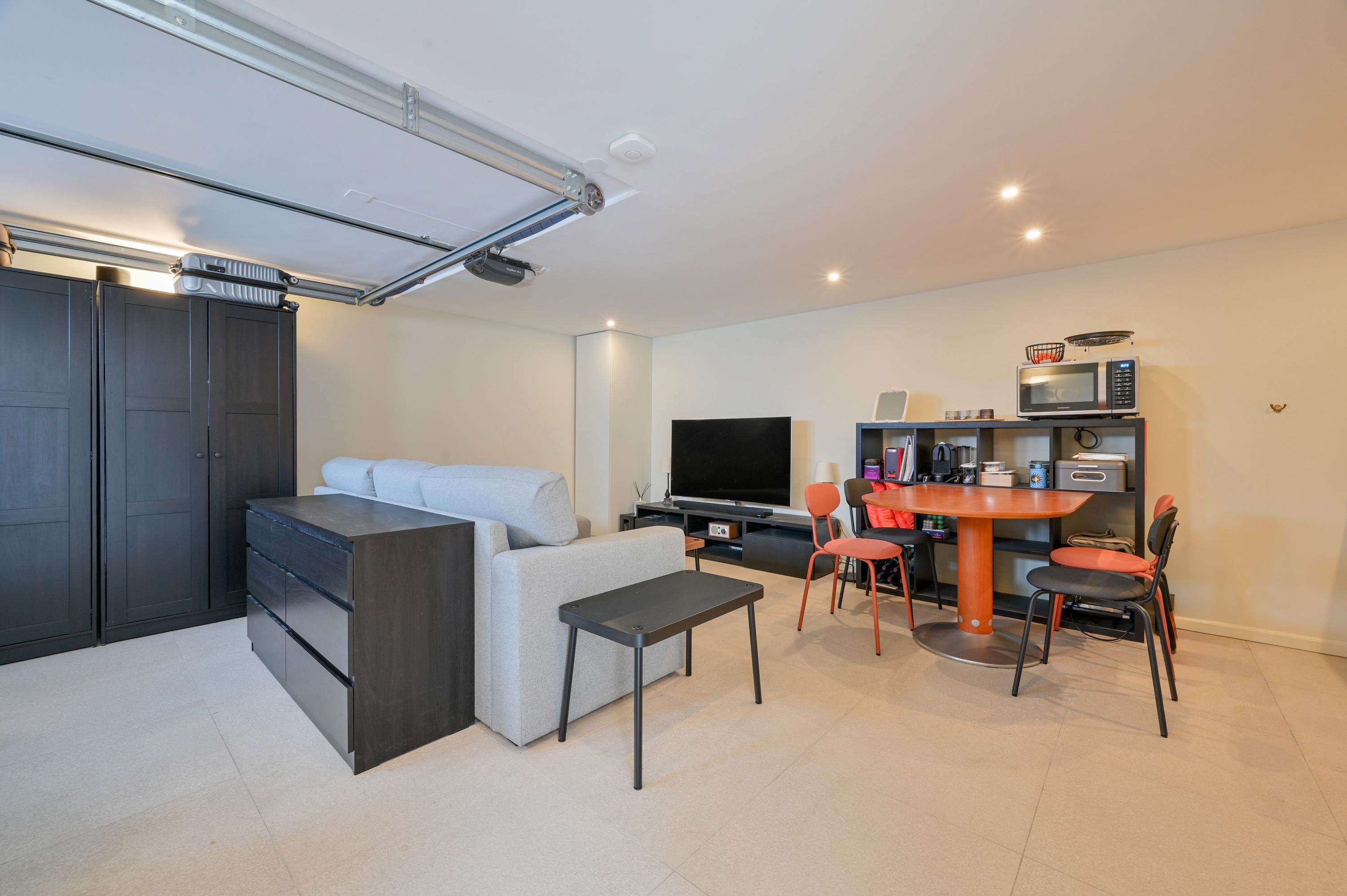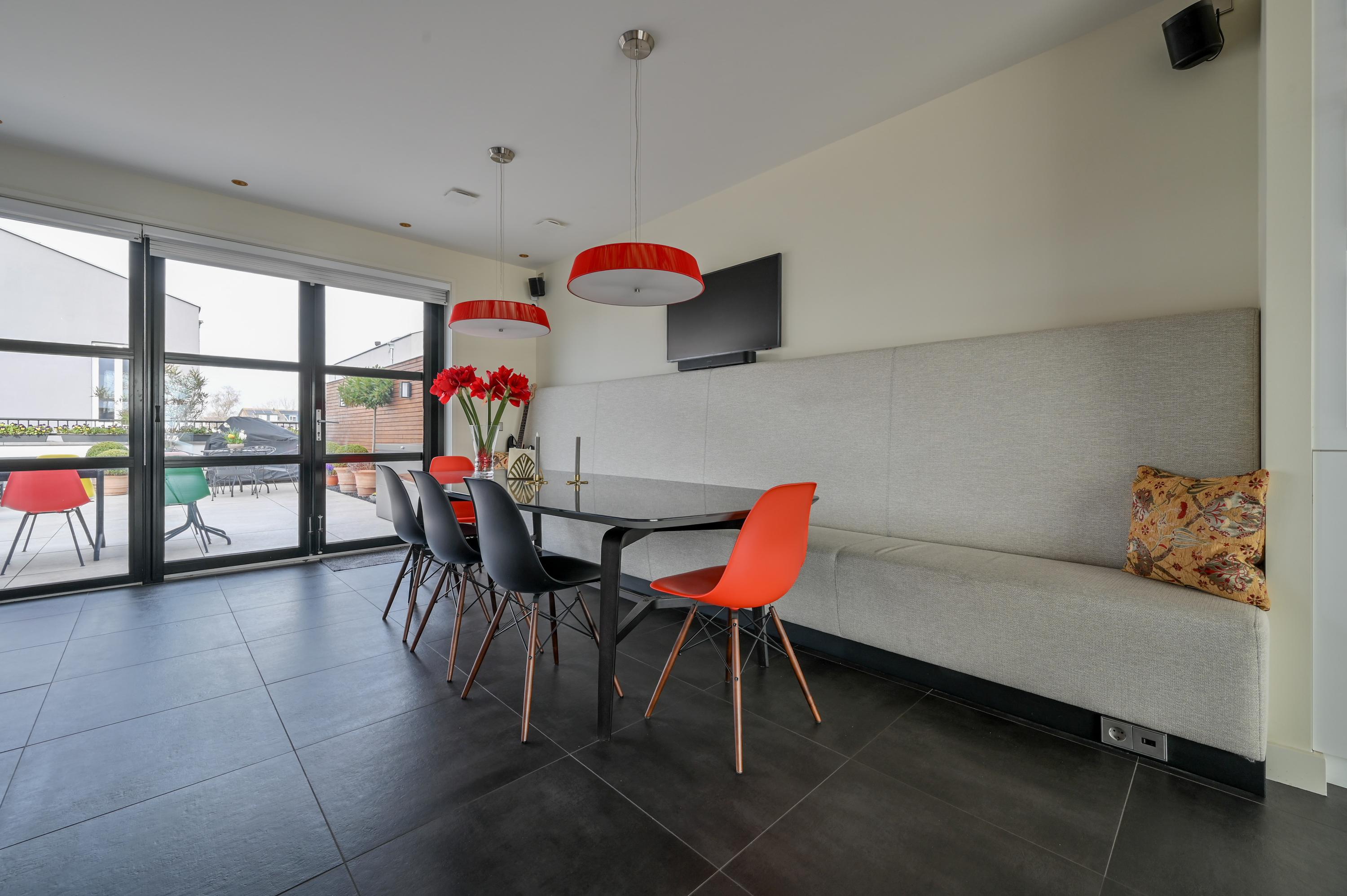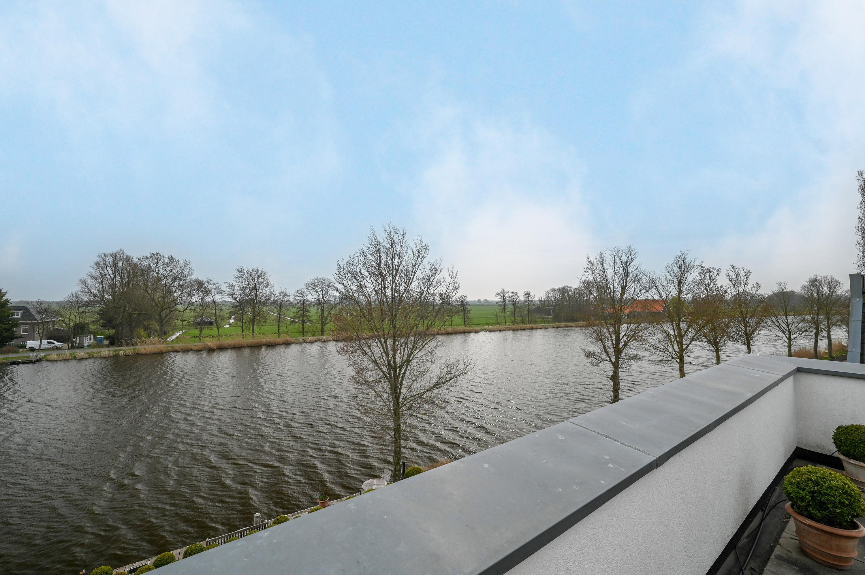 The second floor reveals a rooftop terrace with unobstructed views over the Amstel and polder, enriched by a pergola, integrated lighting, and water connection, creating an inviting setting for quiet reflection or hosting guests. Beneath the house, the garage is configured as a versatile studio, complete with kitchen, toilet, underfloor heating, and air conditioning, accessible via both the terrace and an electric entry.