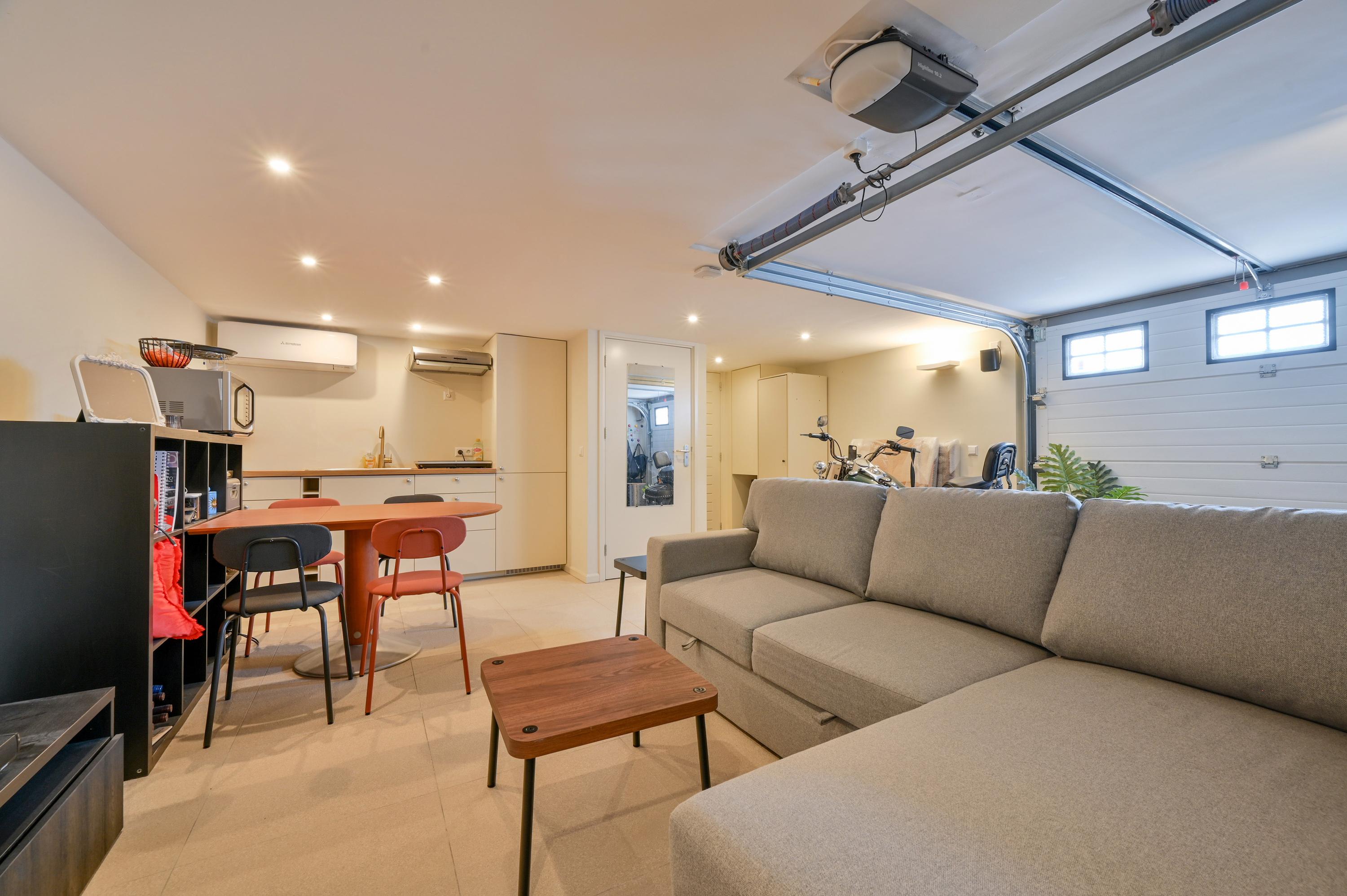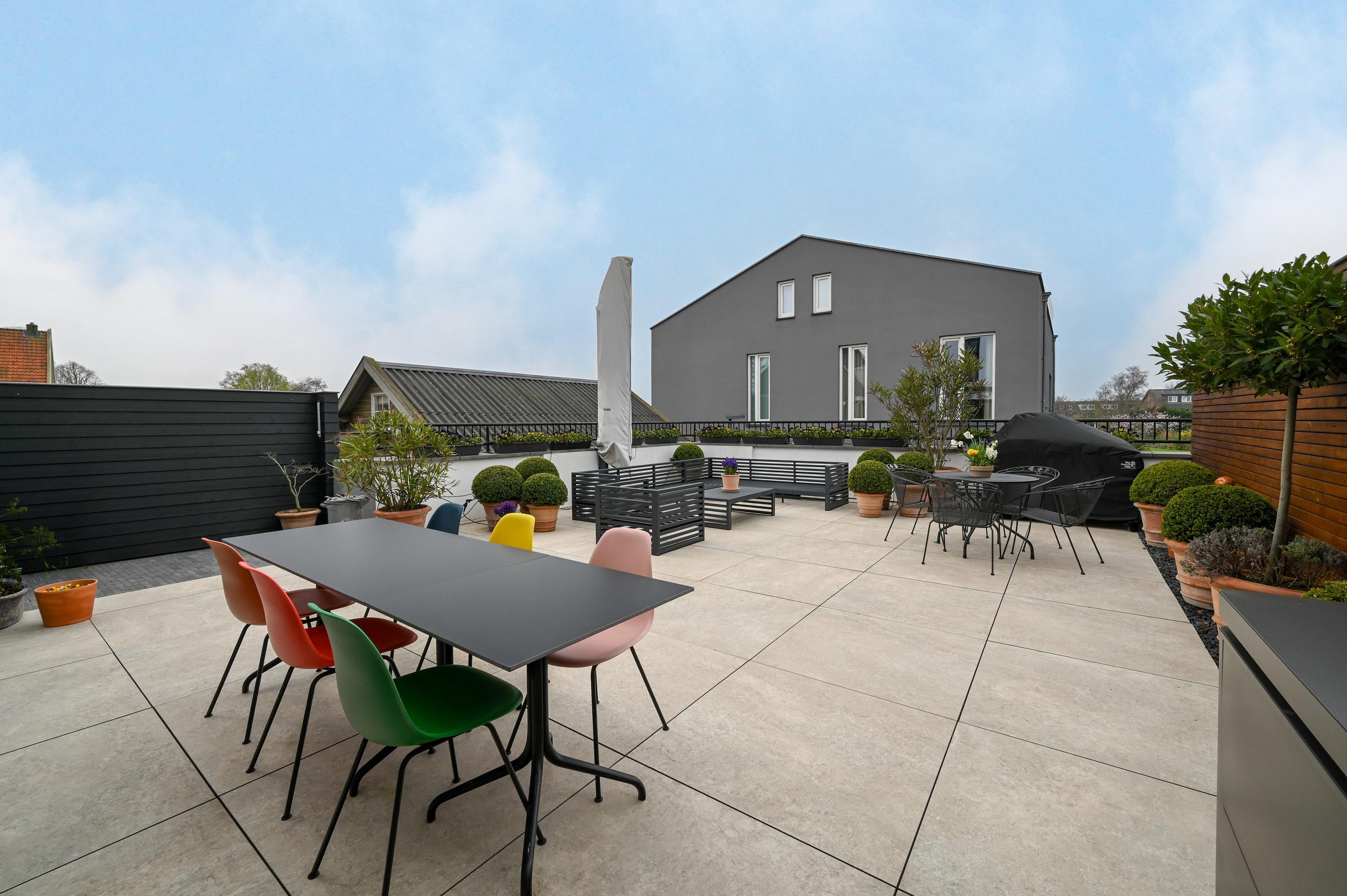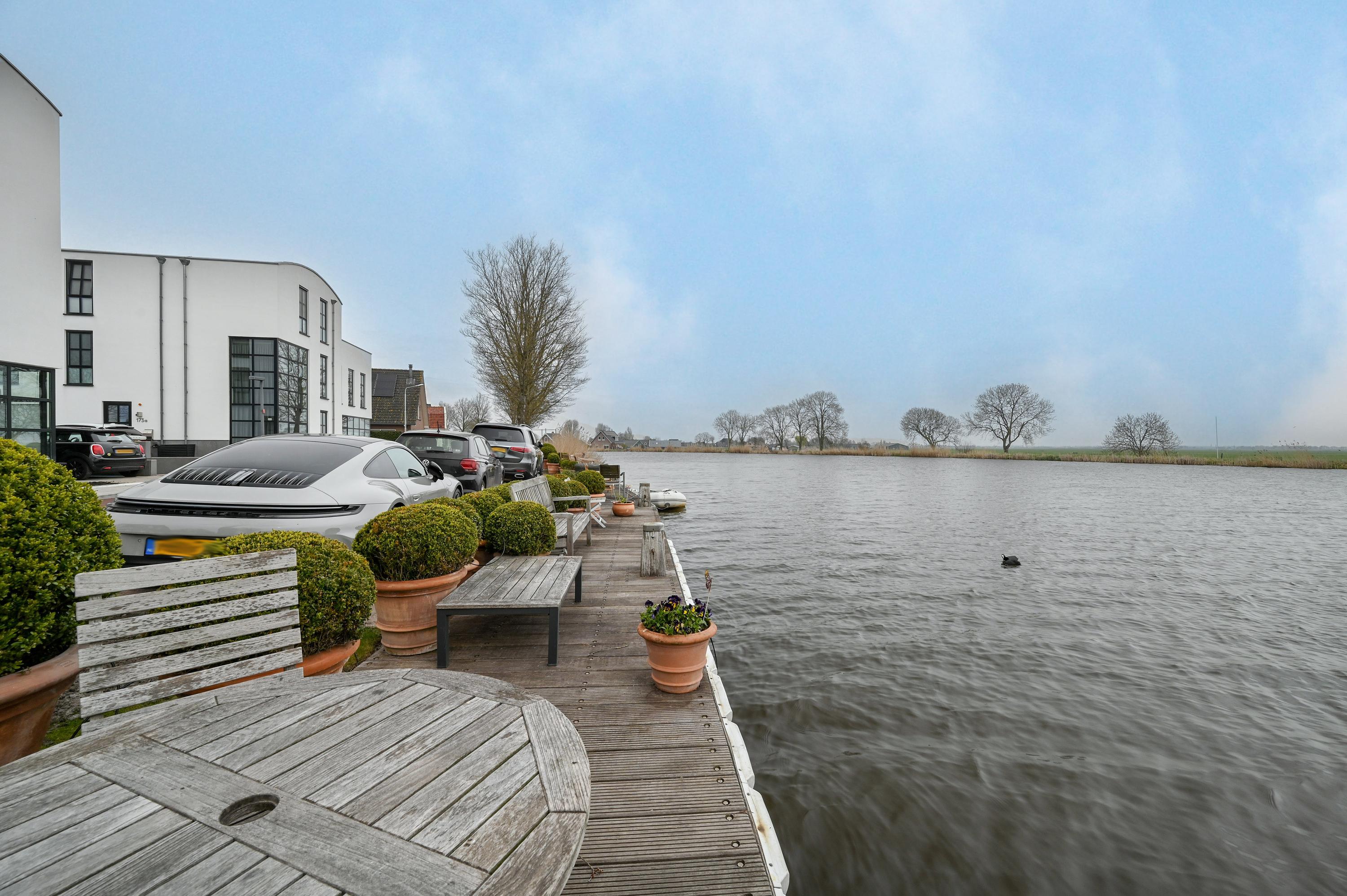 The second floor reveals a rooftop terrace with unobstructed views over the Amstel and polder, enriched by a pergola, integrated lighting, and water connection, creating an inviting setting for quiet reflection or hosting guests. Beneath the house, the garage is configured as a versatile studio, complete with kitchen, toilet, underfloor heating, and air conditioning, accessible via both the terrace and an electric entry.