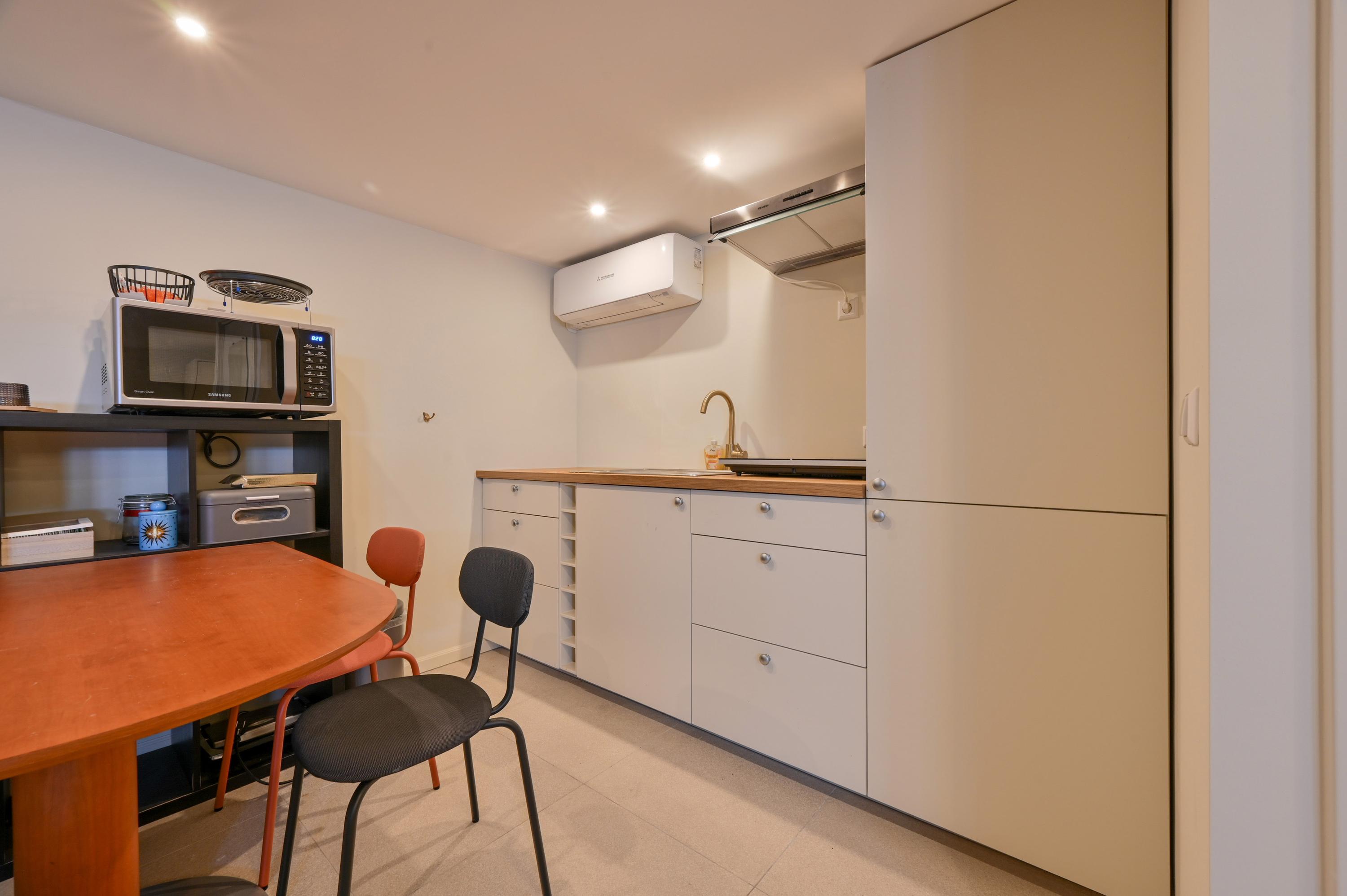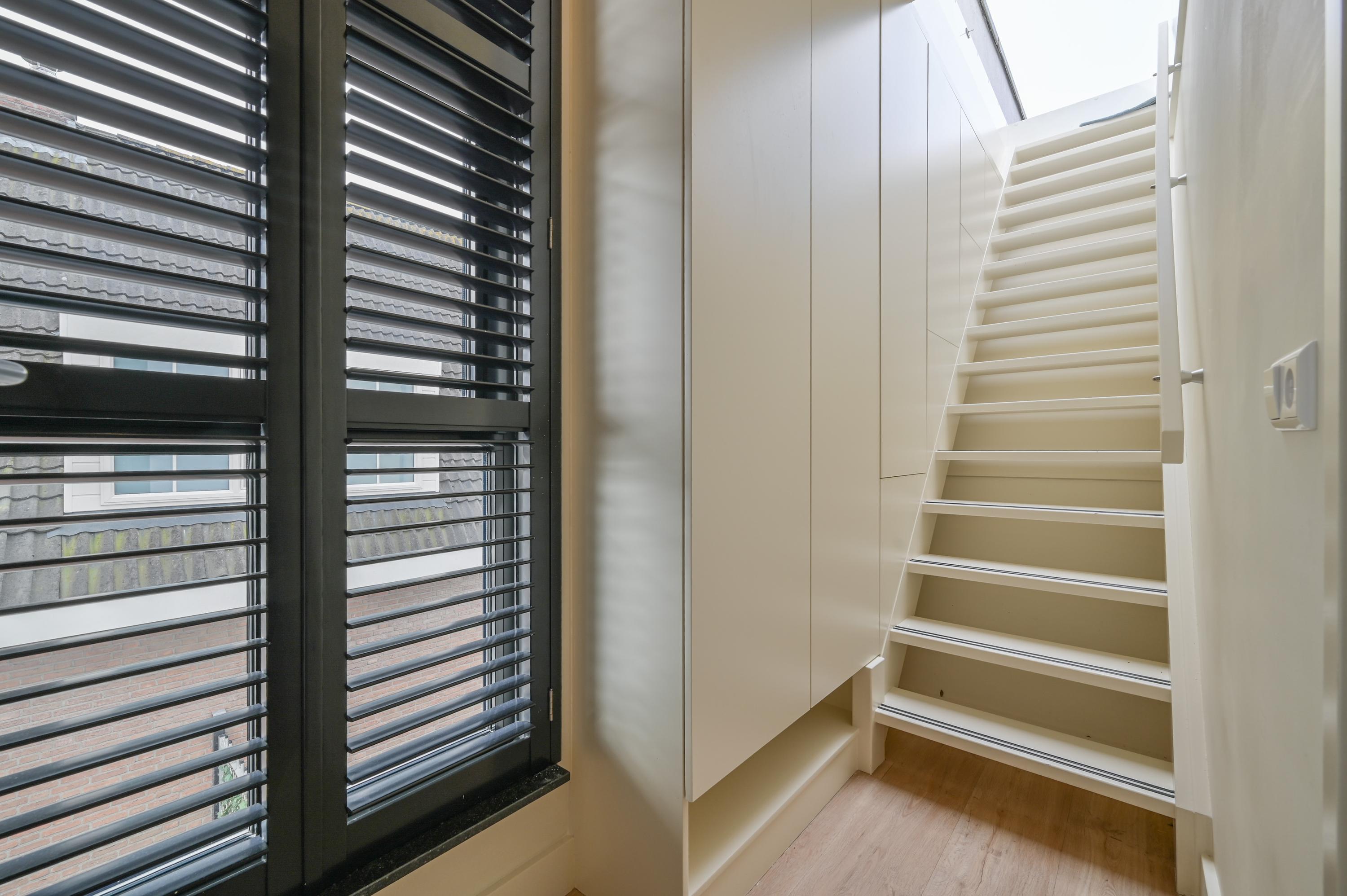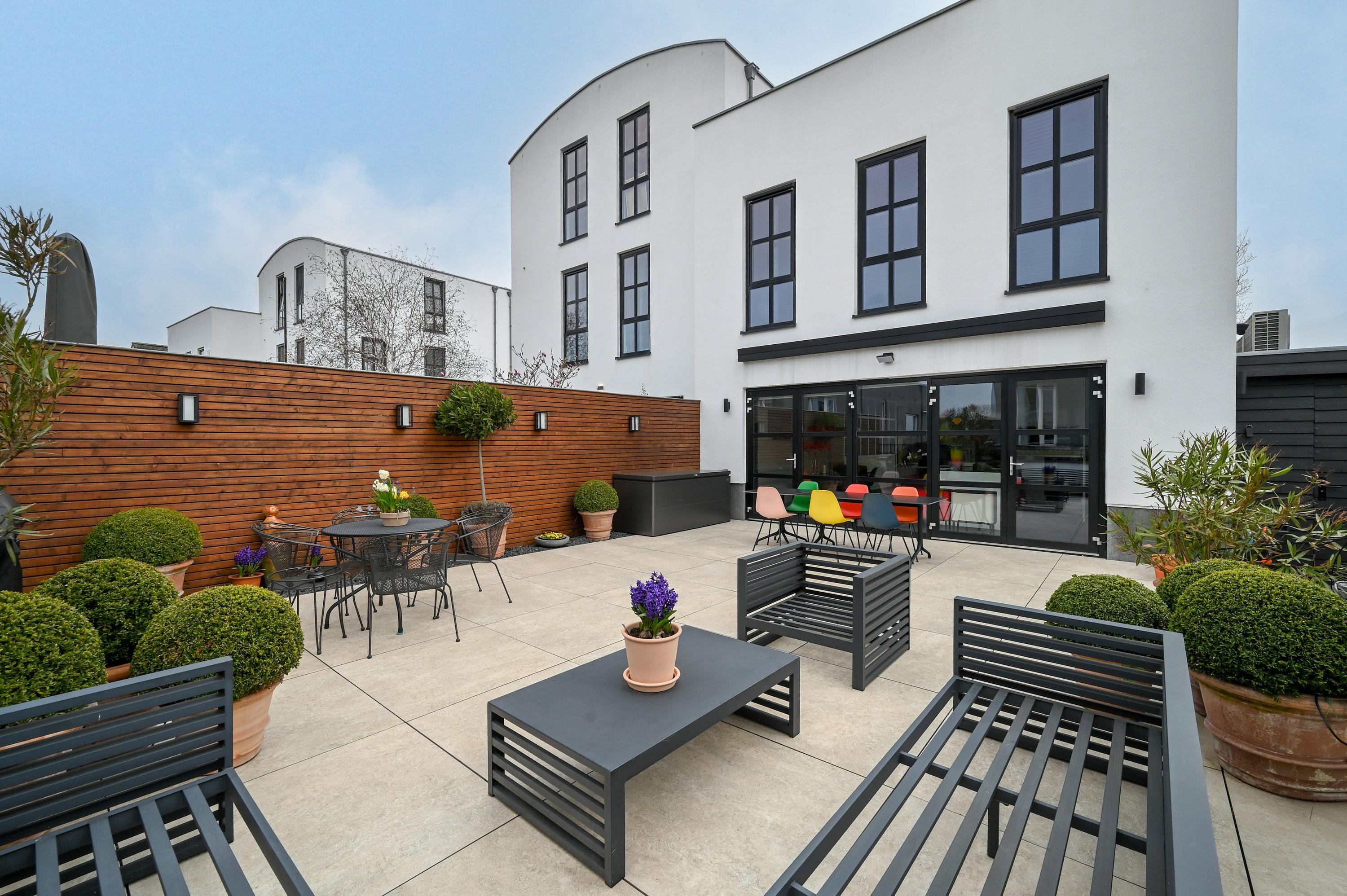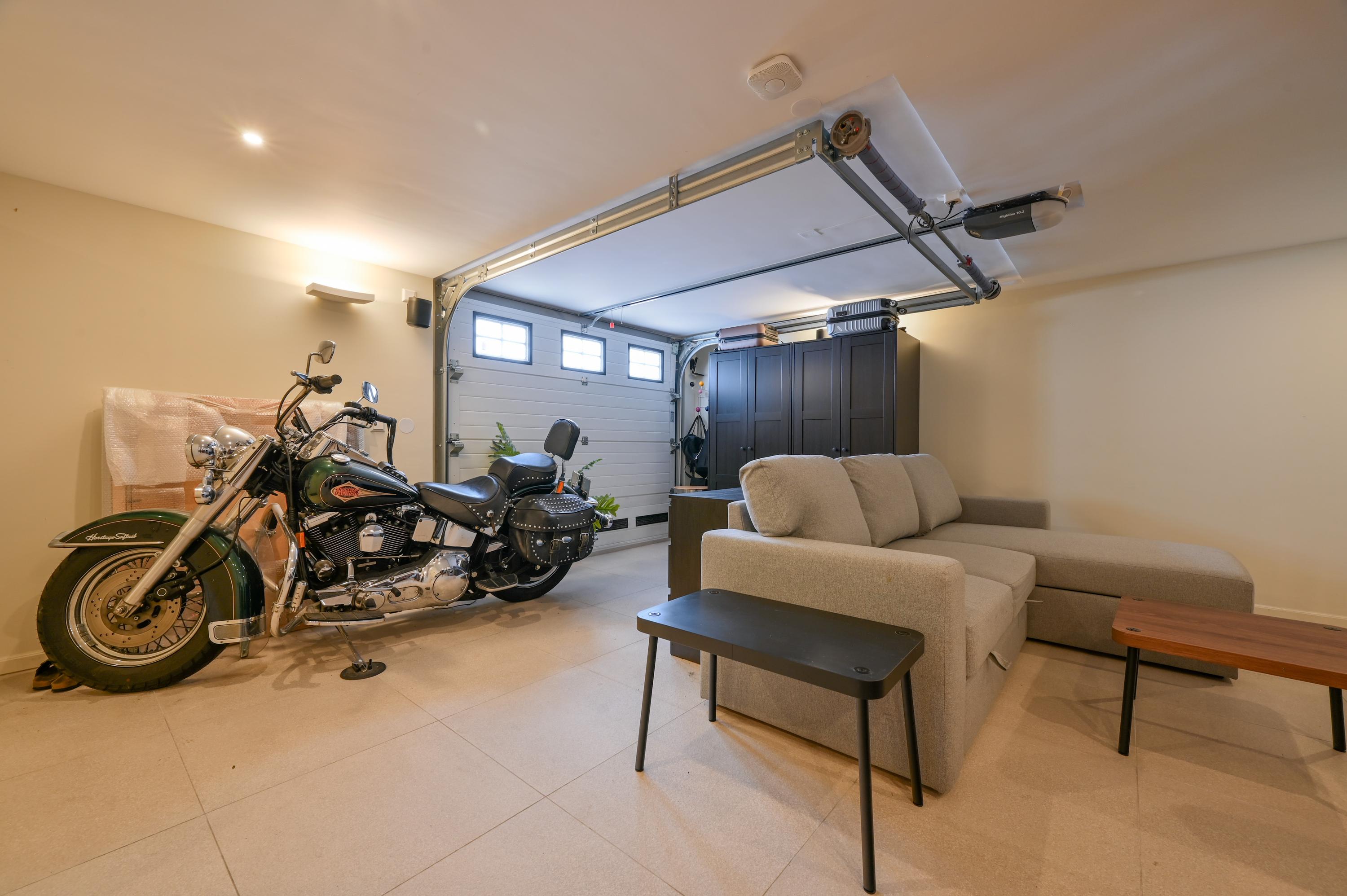The second floor reveals a rooftop terrace with unobstructed views over the Amstel and polder, enriched by a pergola, integrated lighting, and water connection, creating an inviting setting for quiet reflection or hosting guests. Beneath the house, the garage is configured as a versatile studio, complete with kitchen, toilet, underfloor heating, and air conditioning, accessible via both the terrace and an electric entry.