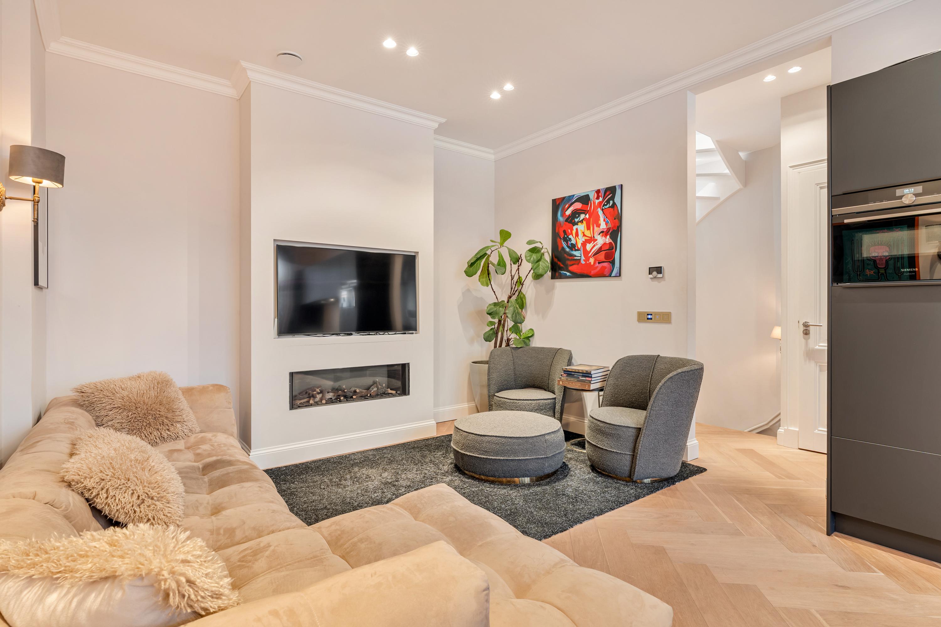 Entrance to the apartment is via the landing, which provides access to two storage cupboards and a separate toilet fitted with a wall-mounted WC and washbasin. The landing connects to all rooms. At the rear, you will find the spacious and bright living room, featuring a gas fireplace and a luxurious open-plan kitchen equipped with various built-in Siemens appliances. French doors open onto the charming balcony. The bedroom at the rear also provides access to the balcony. At the front of the apartment is the master bedroom with a bay window, as well as the third bedroom. Both rooms enjoy lovely views over the Amstel. The centrally located, high-end bathroom is fitted with a bathtub, walk-in shower, and a double vanity unit. An internal staircase leads to the elegant rooftop terrace, fully equipped with LED lighting, a sunshade, greenery, a complete outdoor kitchen, and an outdoor bath. From here, you can enjoy sunshine throughout the day and unobstructed views over the Amstel.
