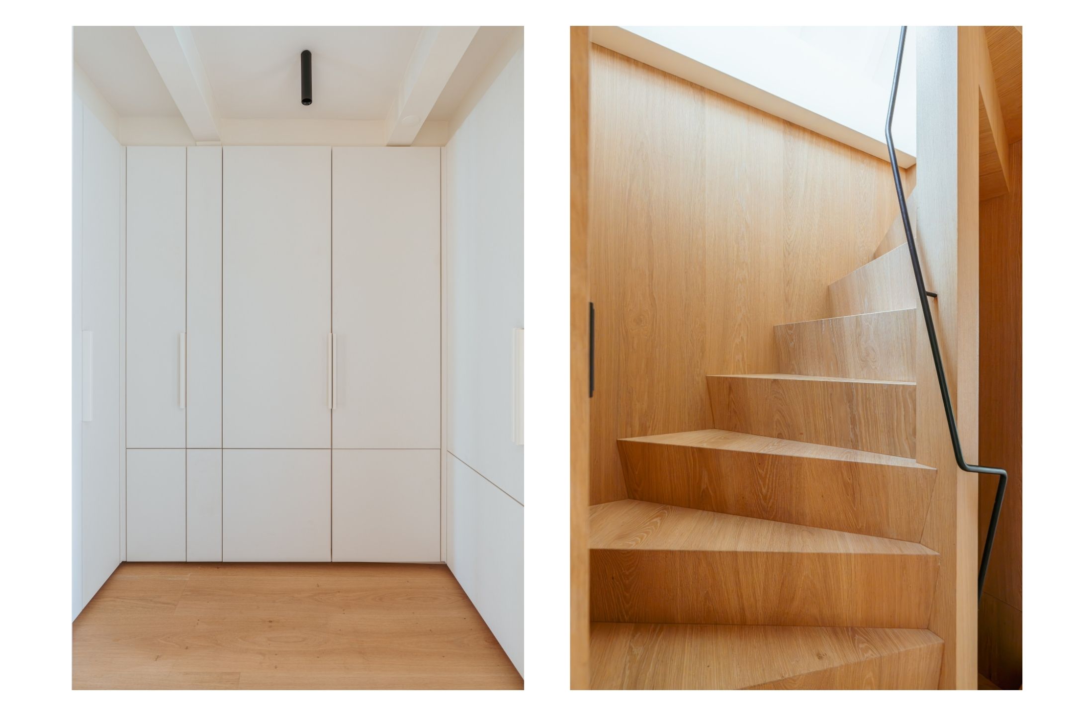 A tidy landing with built-in storage leads to two bedrooms. This floor features a beautiful wooden floor and premium finishes. At the front is a spacious bedroom with a custom-made built-in wardrobe that seamlessly integrates into the design. Large windows flood the space with natural light and offer a stunning view of the canal and historic facades. The second bedroom at the rear also includes built-in wardrobes. Centrally located on this floor is the modern bathroom, complete with a walk-in shower, sleek vanity, and stylish toilet — all finished to a high and timeless standard. Elegant steel-framed doors close off the bedrooms, combining functionality and design in harmony with the home’s aesthetic.