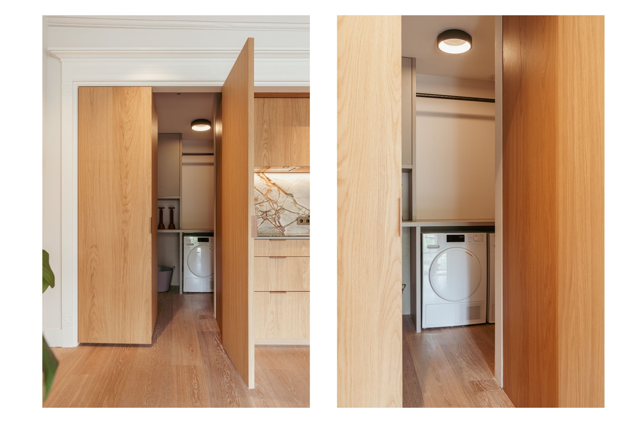 Aangrenzend ligt de moderne keuken, volledig uitgerust met hoogwaardige inbouwapparatuur waaronder een inductiekookplaat, afzuigkap, een combi-oven, vaatwasser, spoelbak, quooker en een afsluitbare inbouwkast die perfect dienst doet als koffiecorner. Een speels en praktisch element is de “verborgen” deur, weggewerkt in de kastenwand, die toegang biedt tot een royale pantry/washok.