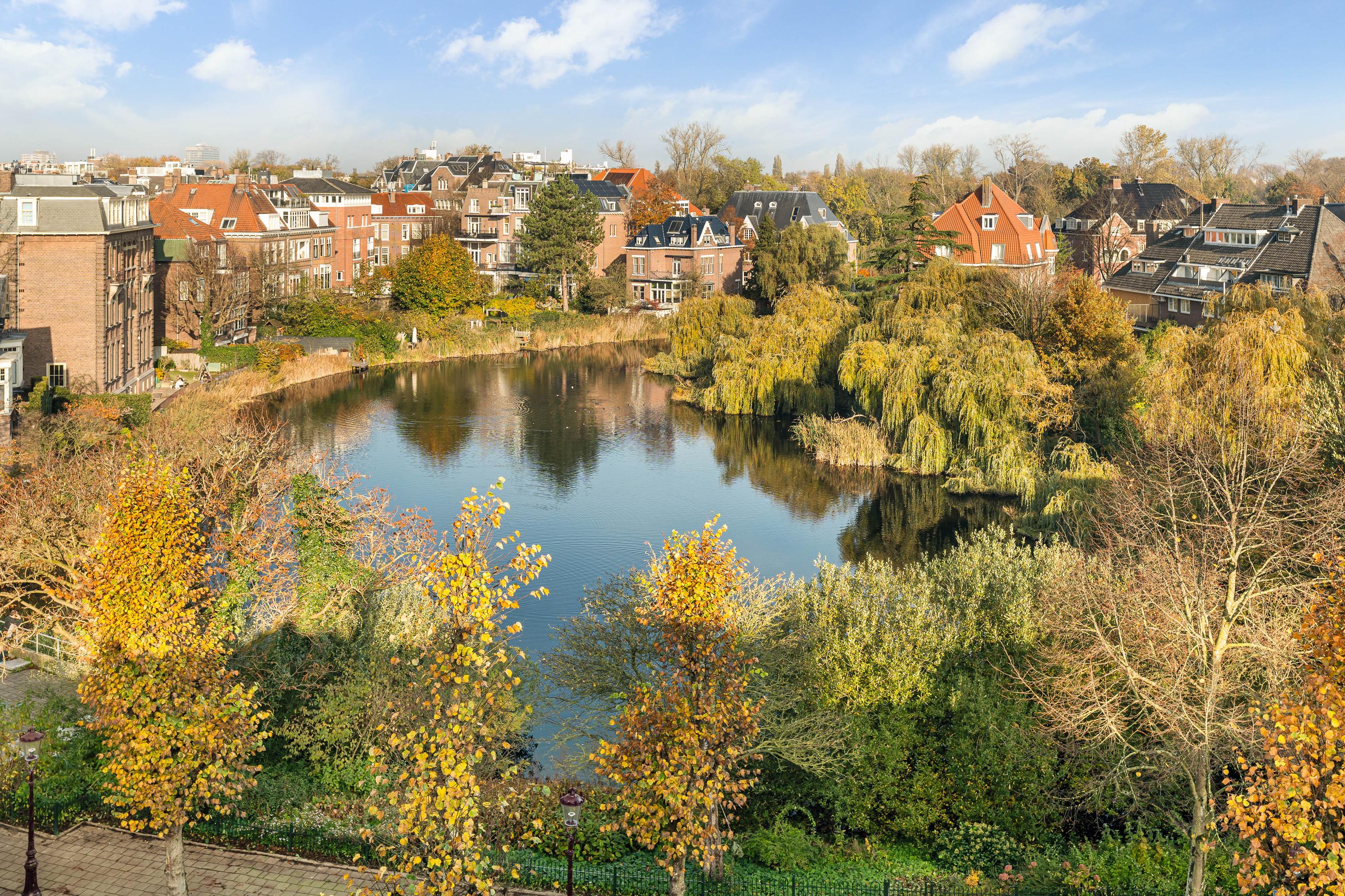 What immediately catches the eye is the unique view over the large pond on the Sophialaan, bordering the Vondelpark. This view can be enjoyed throughout the entire space, even from the kitchen. French doors open onto the deep balcony, which offers a panoramic view over the pond and brings an abundance of natural light into the apartment.