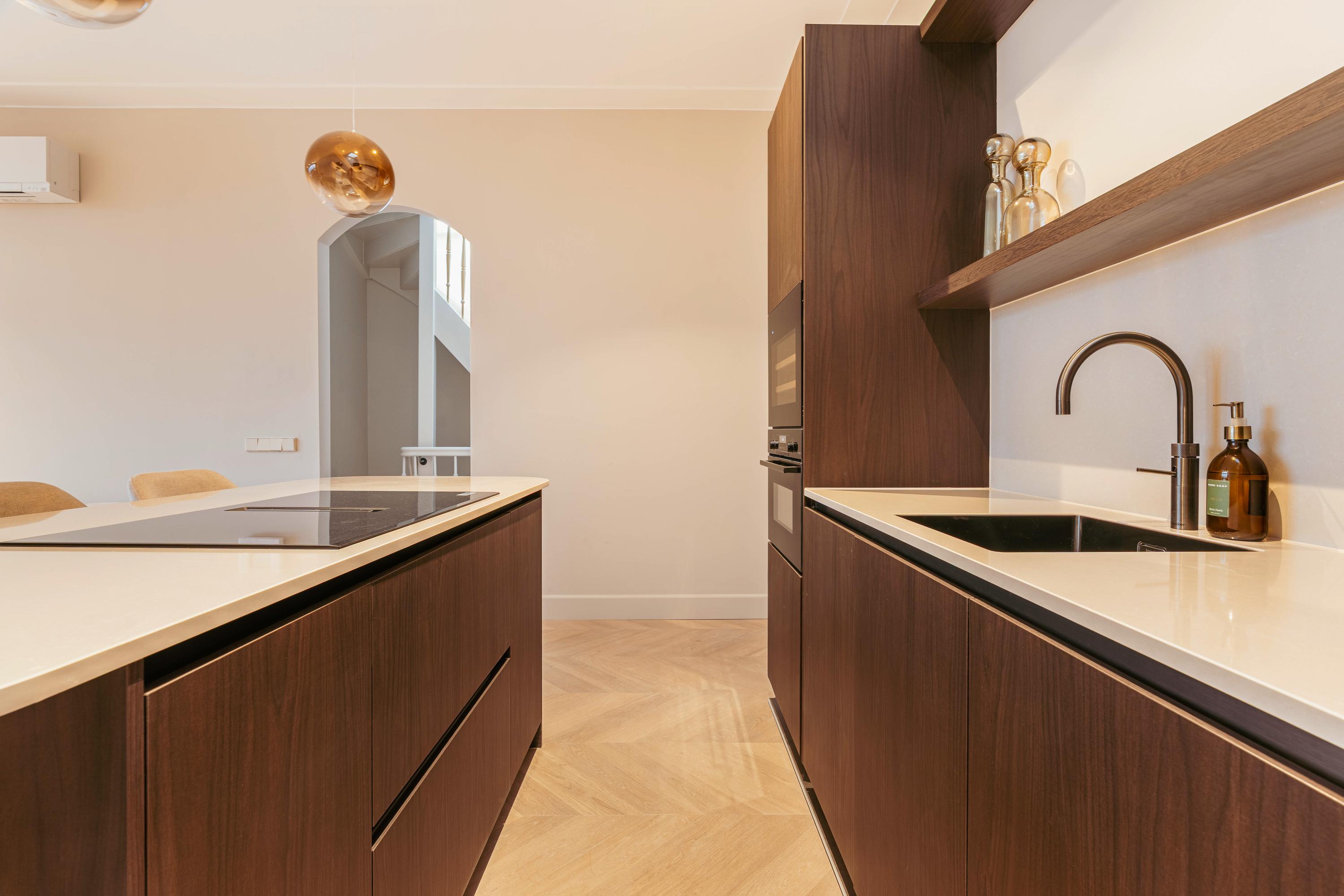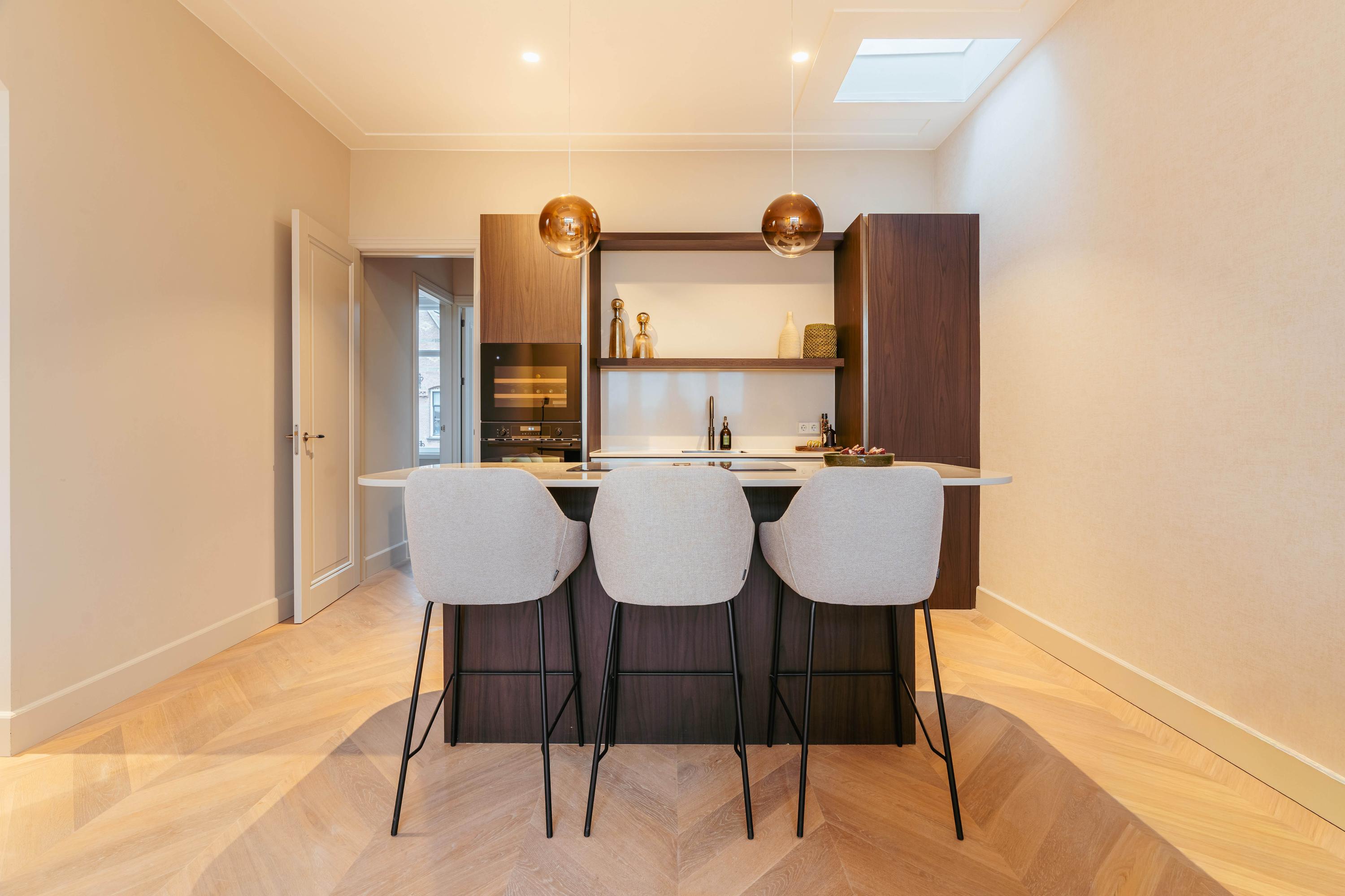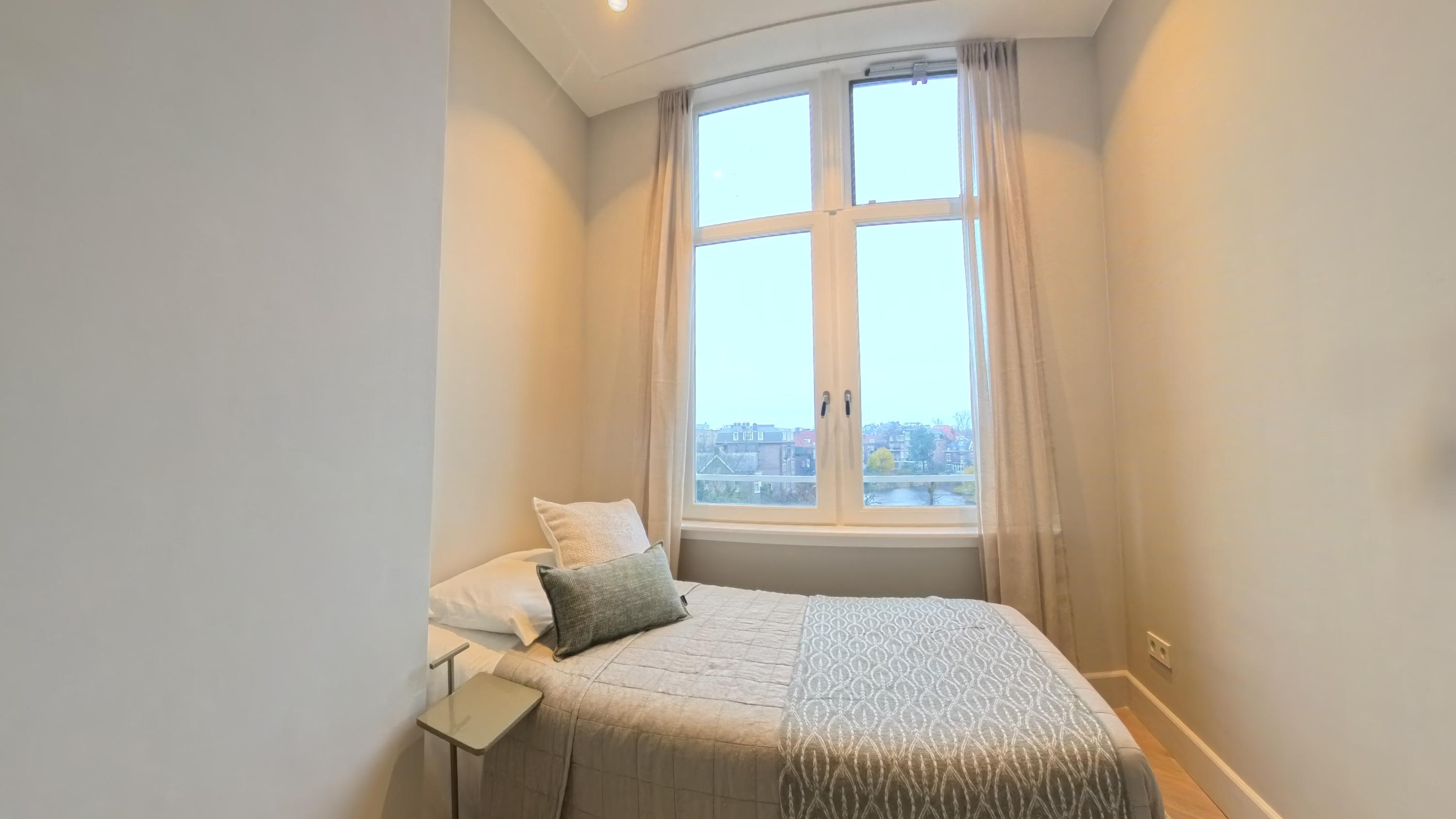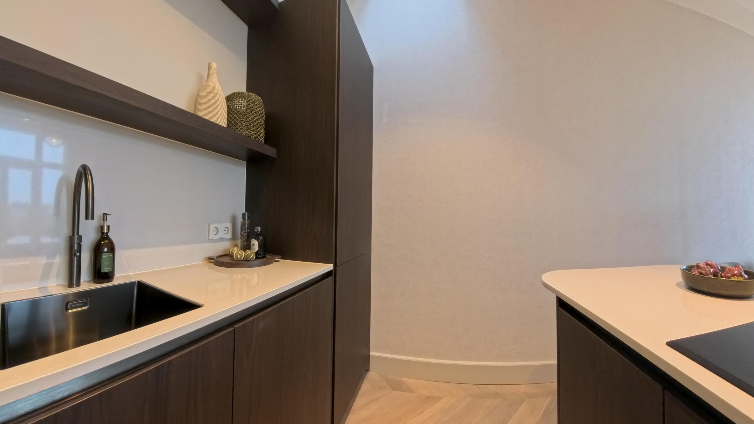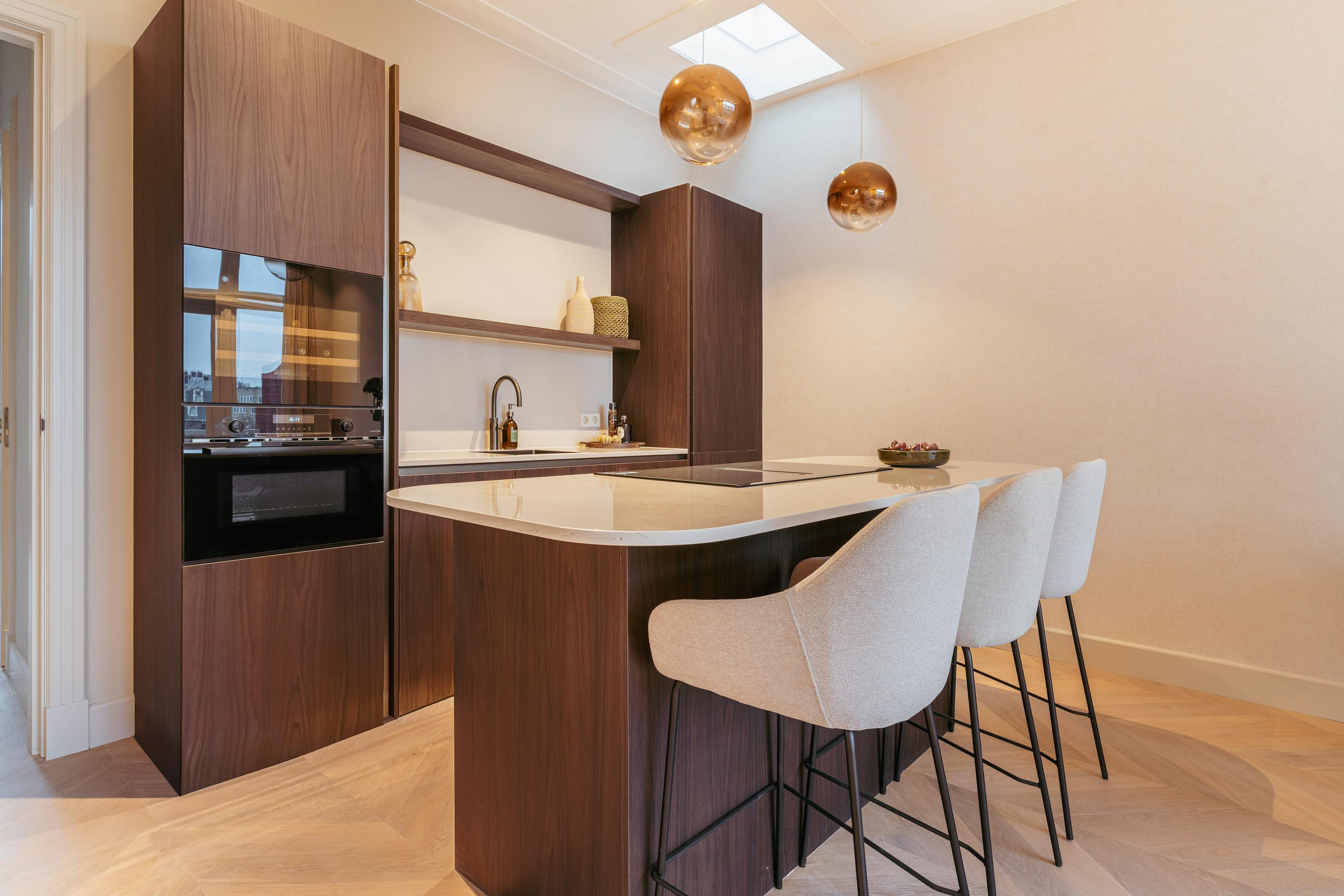 The open-plan kitchen with cooking island and bar forms an elegant whole with the living area and is equipped with all modern conveniences, including a combination oven, dishwasher, fridge-freezer, Quooker and an induction hob with integrated extraction. The island offers space for four to five bar stools, allowing you to cook with pleasure while enjoying views over the greenery and the water. A rare outlook in the city.