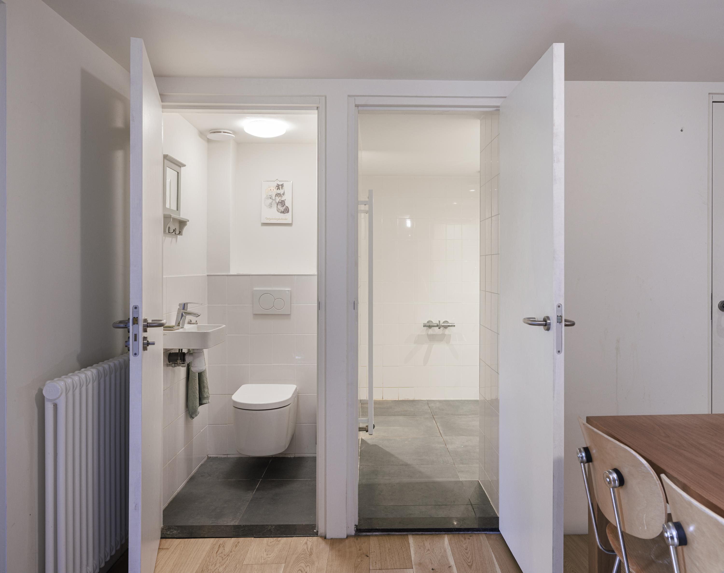 The interior is just as impressive. The new-build and renovation combine old and modern materials in an exciting and harmonious way. Think robust wooden structural beams, raw concrete, oak flooring, classic column radiators, and a striking steel spiral staircase. The finish is of high quality and executed with great attention to detail.
