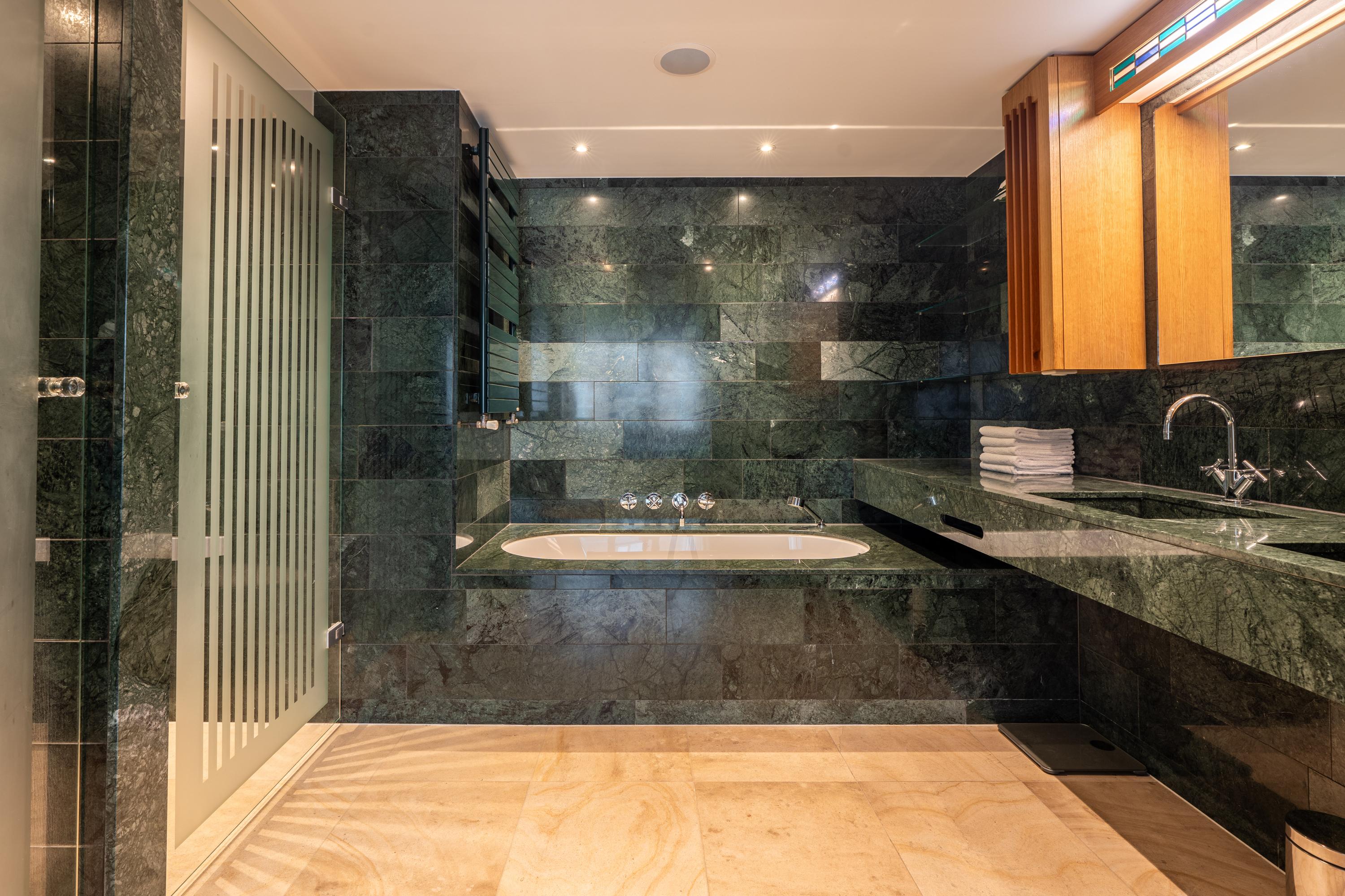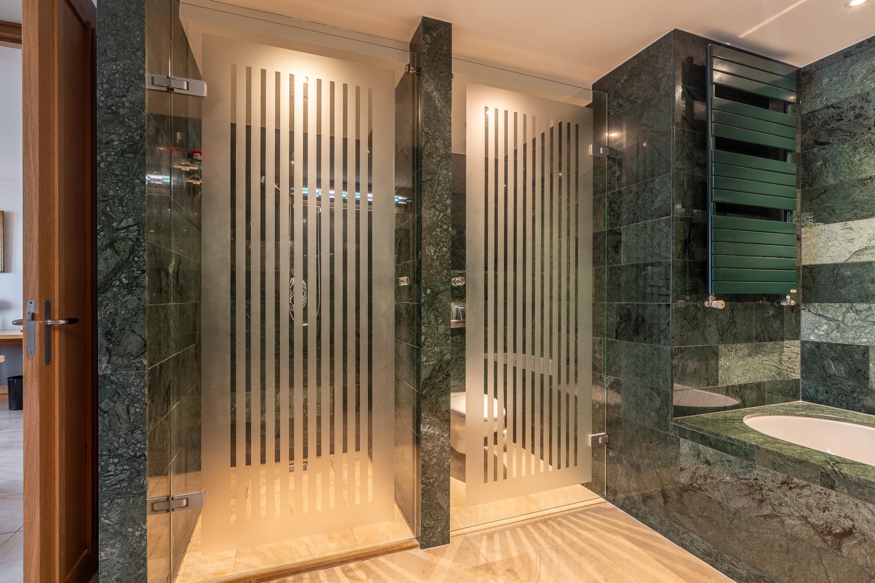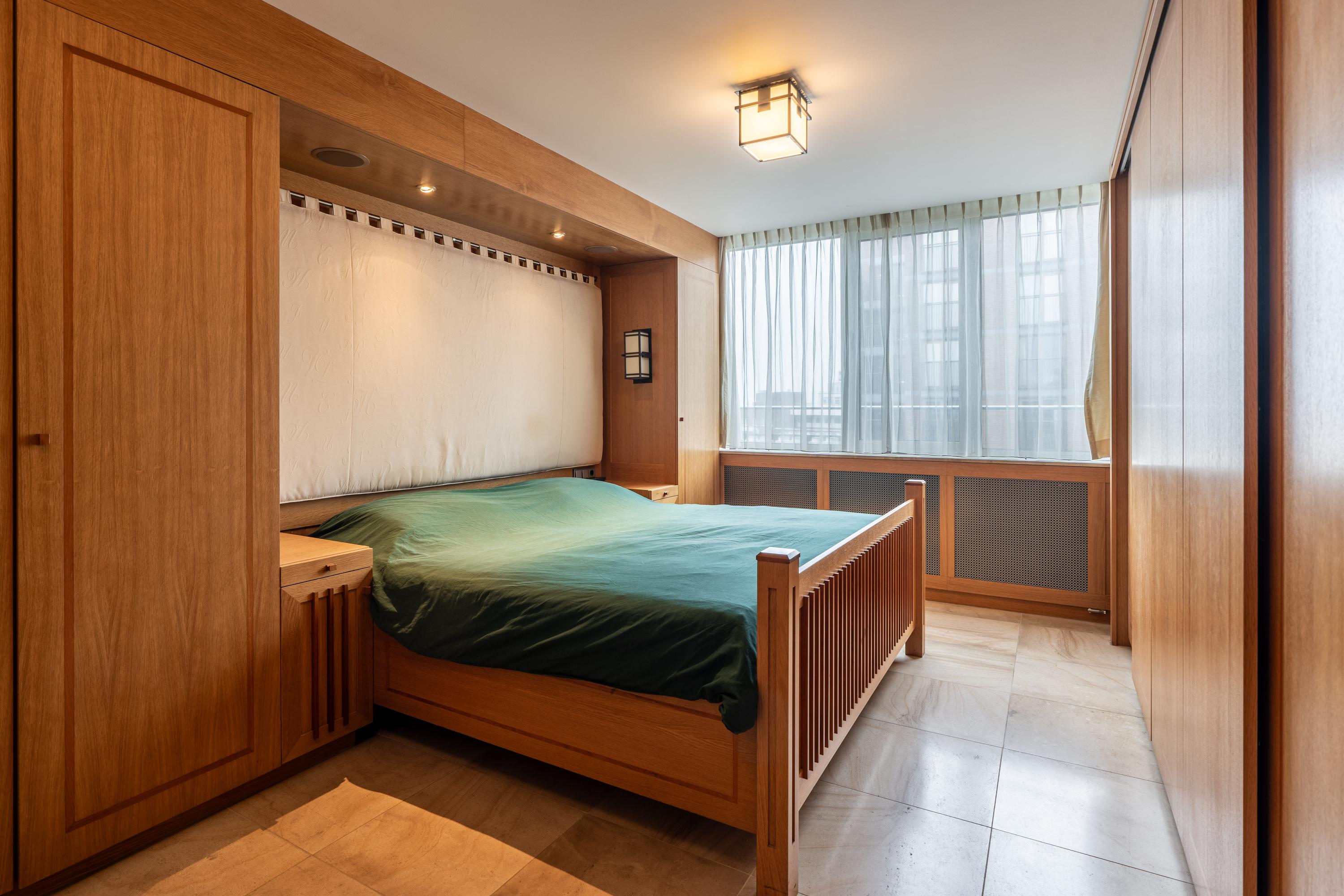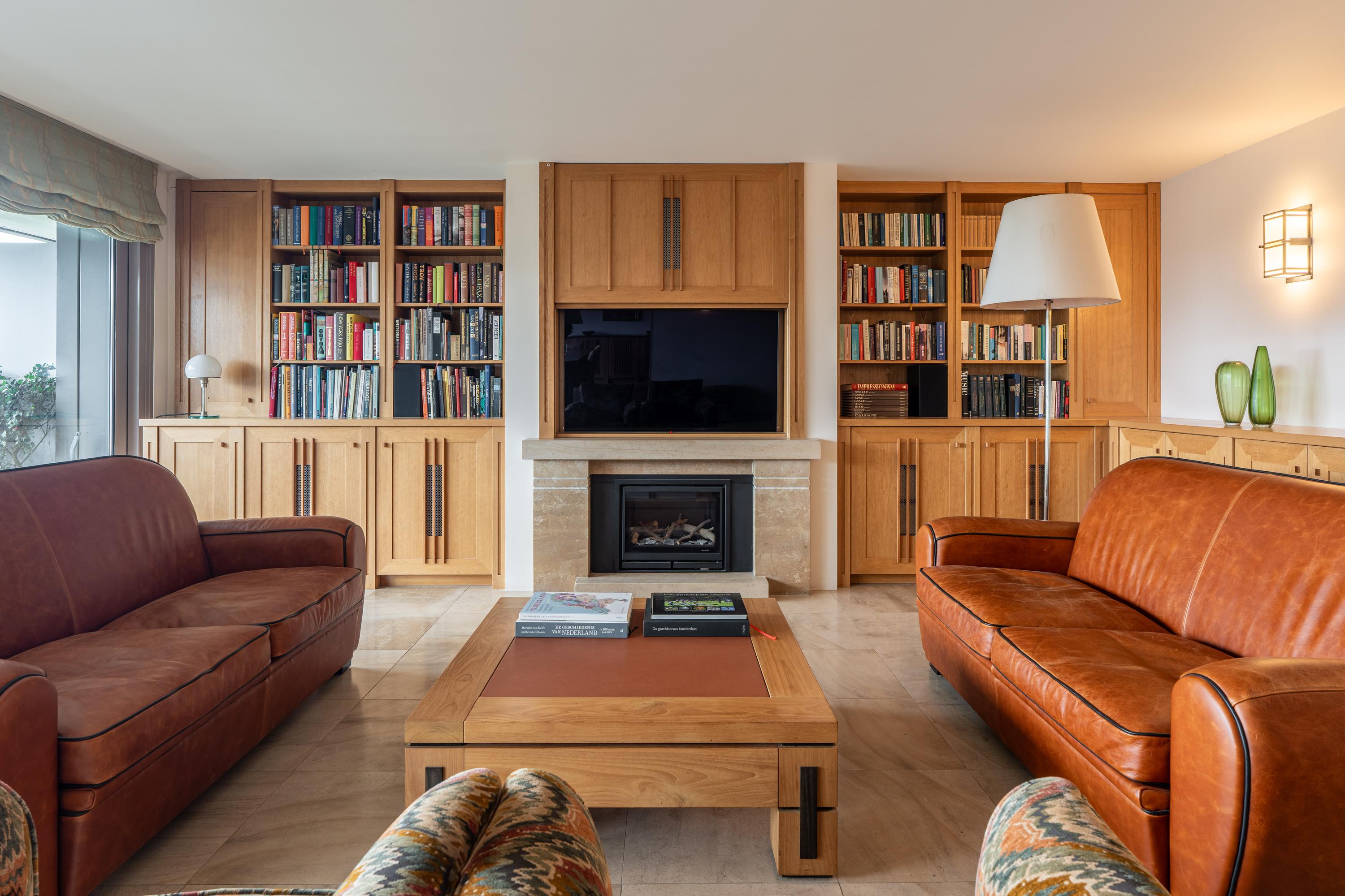 Step inside the penthouse and a wide entrance hall leads to open-plan living, punctuated by floor-to-ceiling glass doors that connect seamlessly to a 25 m² balcony running the entire width of the residence. Vondelpark unfolds below, visible from both the living space and kitchen, inviting a rare calm into the city setting. The kitchen is fully appointed, integrating a central cooking island, six-burner induction hob, and generous storage. The living room, anchored by a gas fireplace and crafted cabinetry, flows into a comfortable workspace. Three bedrooms offer built-in wardrobes, bespoke desks, and air conditioning, with the primary suite featuring a green marble bathroom and double vanity. Throughout, underfloor heating and energy-efficient systems ensure year-round comfort, complemented by double glazing and mechanical ventilation.