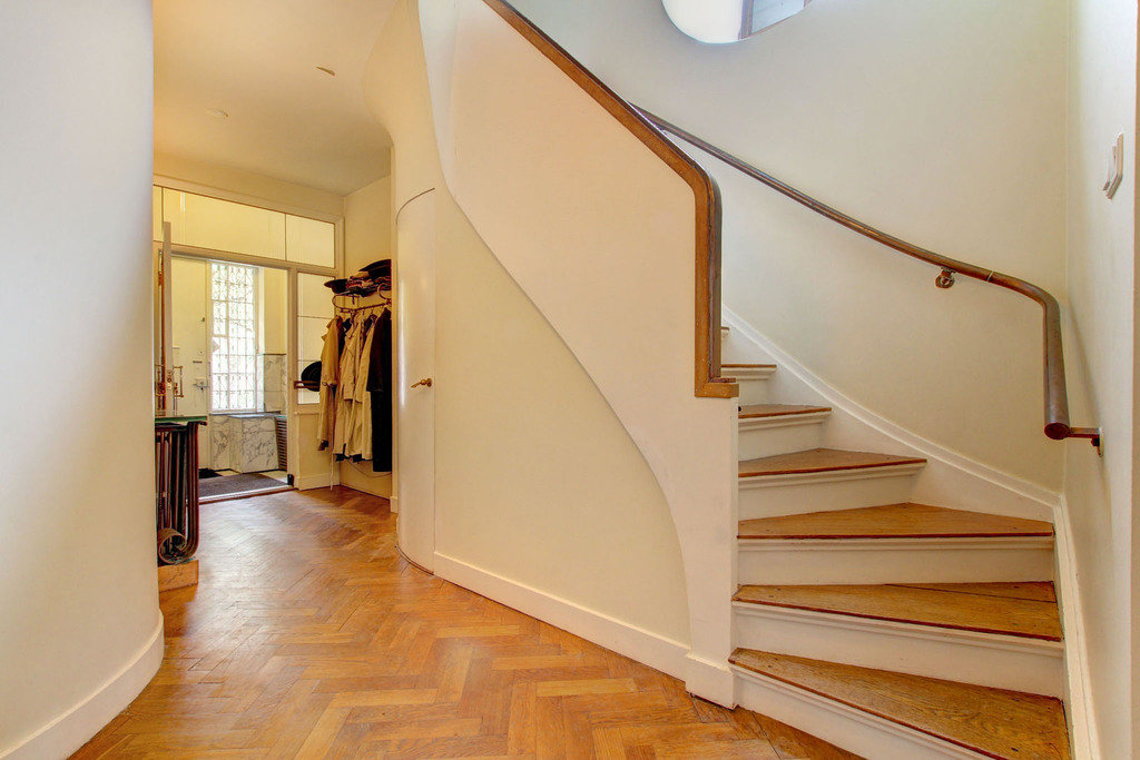 The property is largely fitted with oak parquet flooring on the ground and first floors and features original ironmongery and authentic details throughout. The stairwell is in its original condition and is beautifully lit by two round windows and a skylight, contributing to the unique atmosphere of the home.