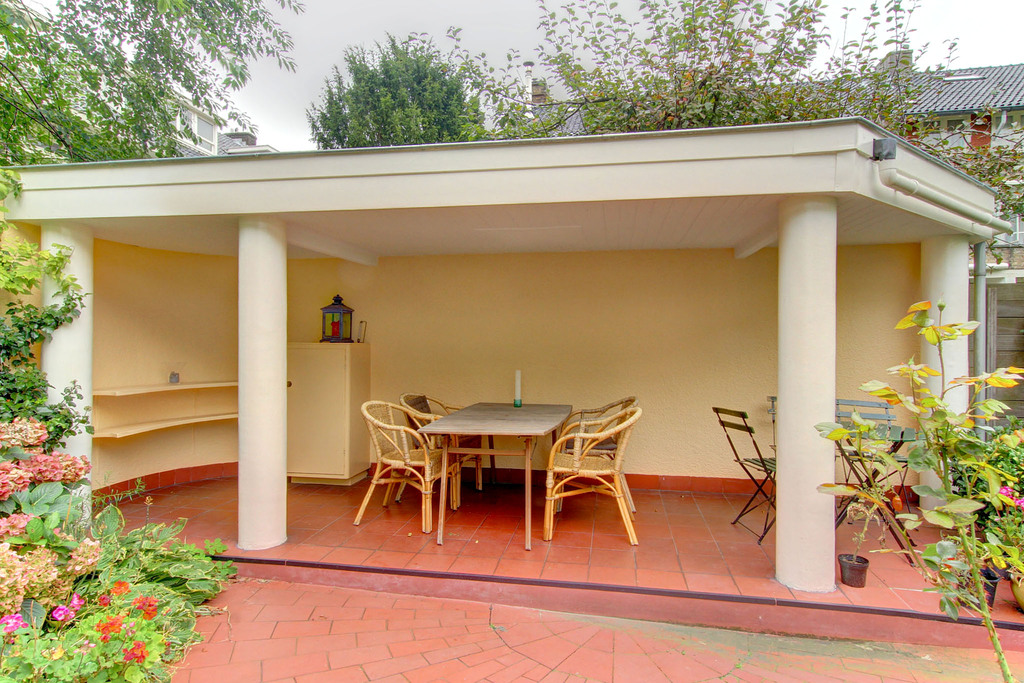The generous garden of approximately 77 m² features a pergola and, despite its northerly aspect, receives a surprisingly good amount of sunshine.