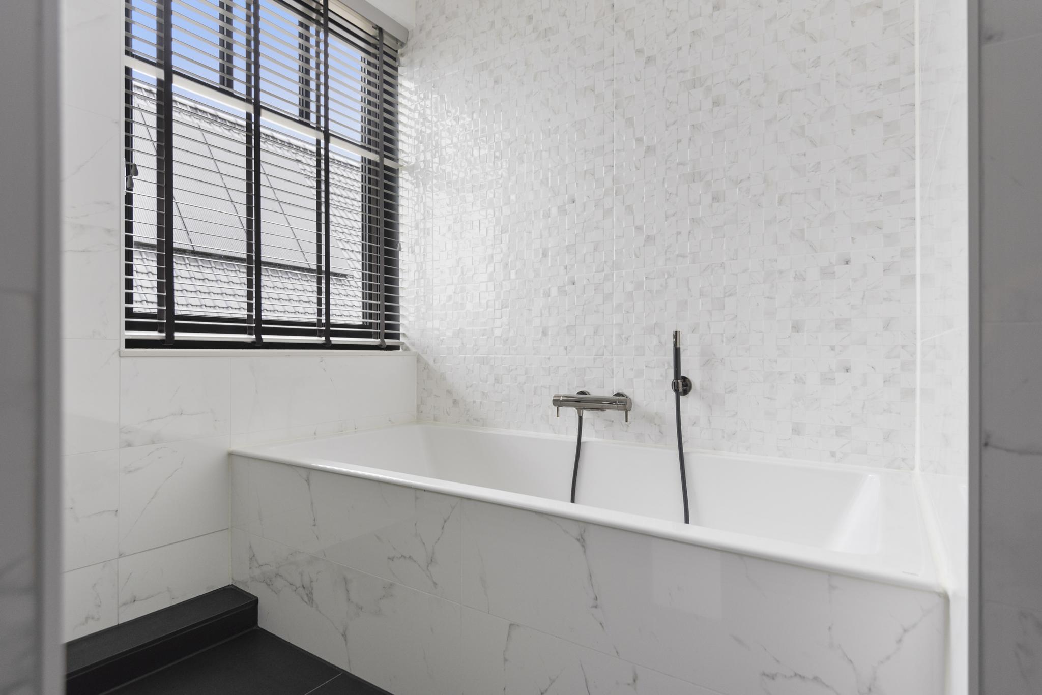 Upon entering, you are welcomed into a spacious hallway with a cloakroom area, a stylish staircase with leather-covered steps and a modern toilet. The ground floor features a sleek PVC floor with underfloor heating and cooling. From the hallway, you have a direct view of the large backyard, which immediately gives a sense of openness.