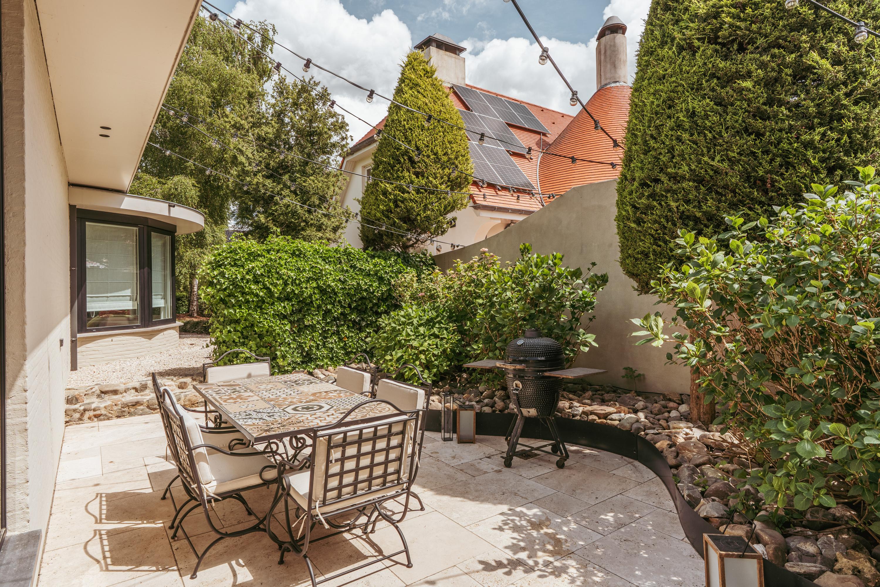 The elegant front garden leads to the impressive hallway, which provides access to all rooms on the ground floor. Immediately to the right is the spacious internal storage room housing the central heating system, laundry chute, water softener, and the home automation controls. Opposite, you will find a built-in cupboard and adjacent to it, the garage—currently set up as a fitness room. To the left of the hallway is a large guest WC with washbasin.