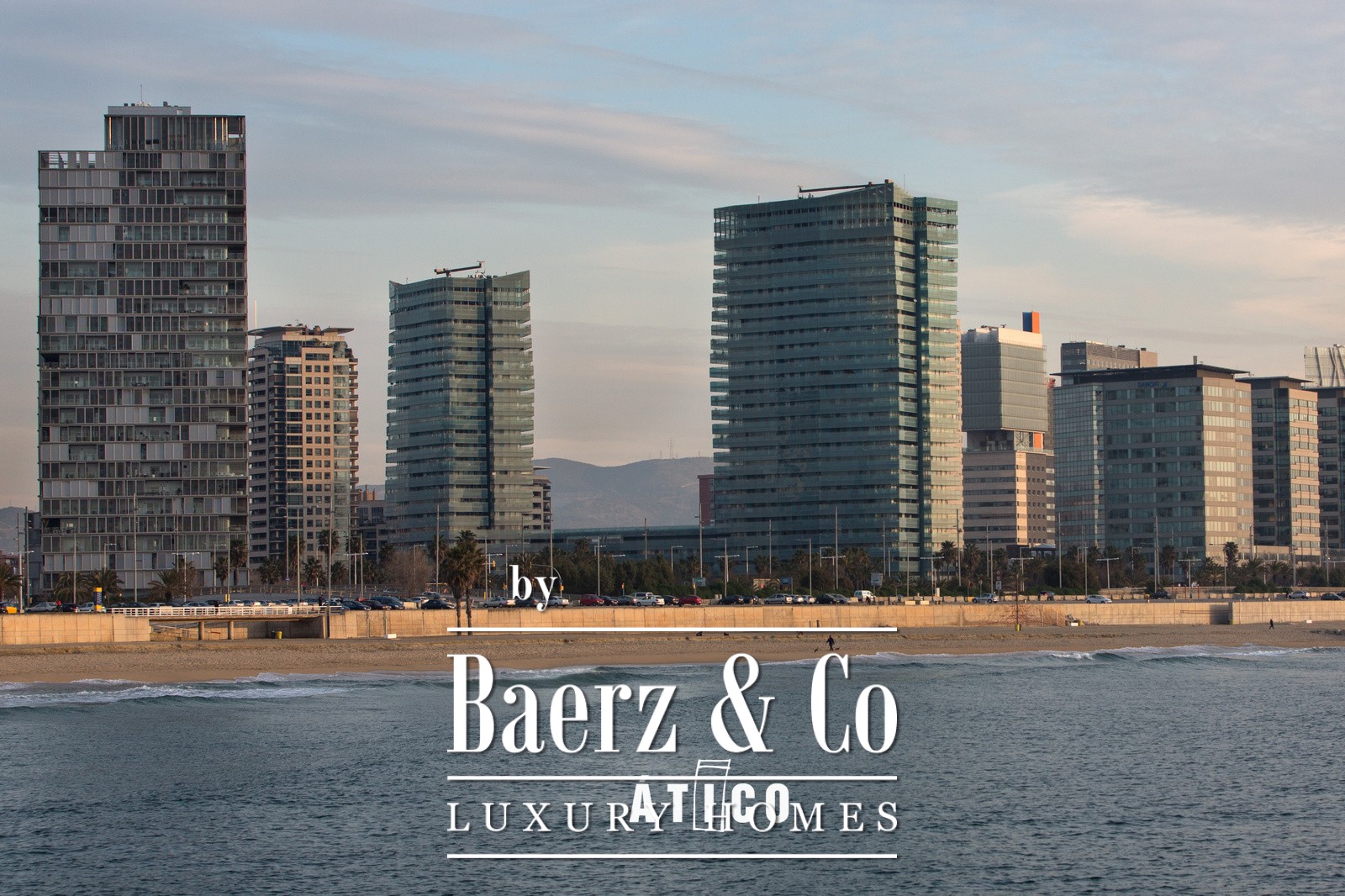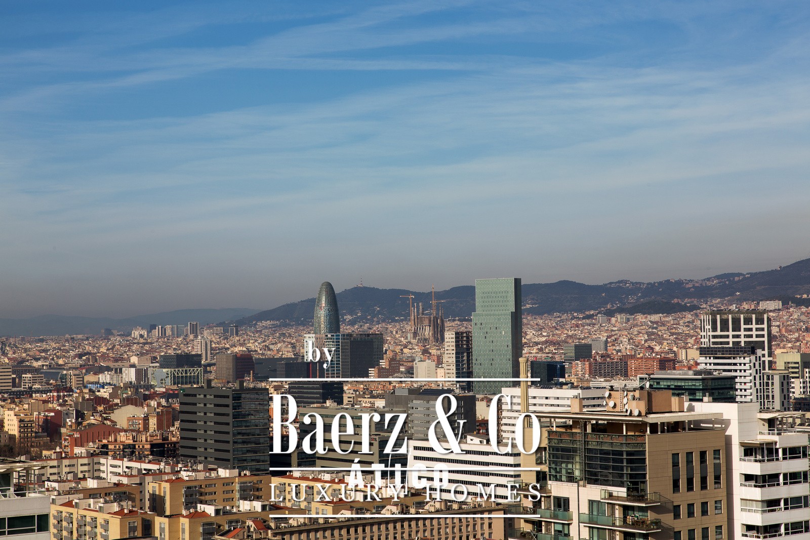 Upon entering, you will be greeted by a bright, open-plan space that maximises the views of the sea and the park with its surrounding waterfalls. The modern and sophisticated design, together with high-quality materials, creates a welcoming and elegant atmosphere. The spacious living room, bathed in natural light thanks to its large windows, offers stunning panoramic views of the vibrant city of Barcelona, ​​as well as access to a terrace that surrounds the entire apartment and features a private pool.