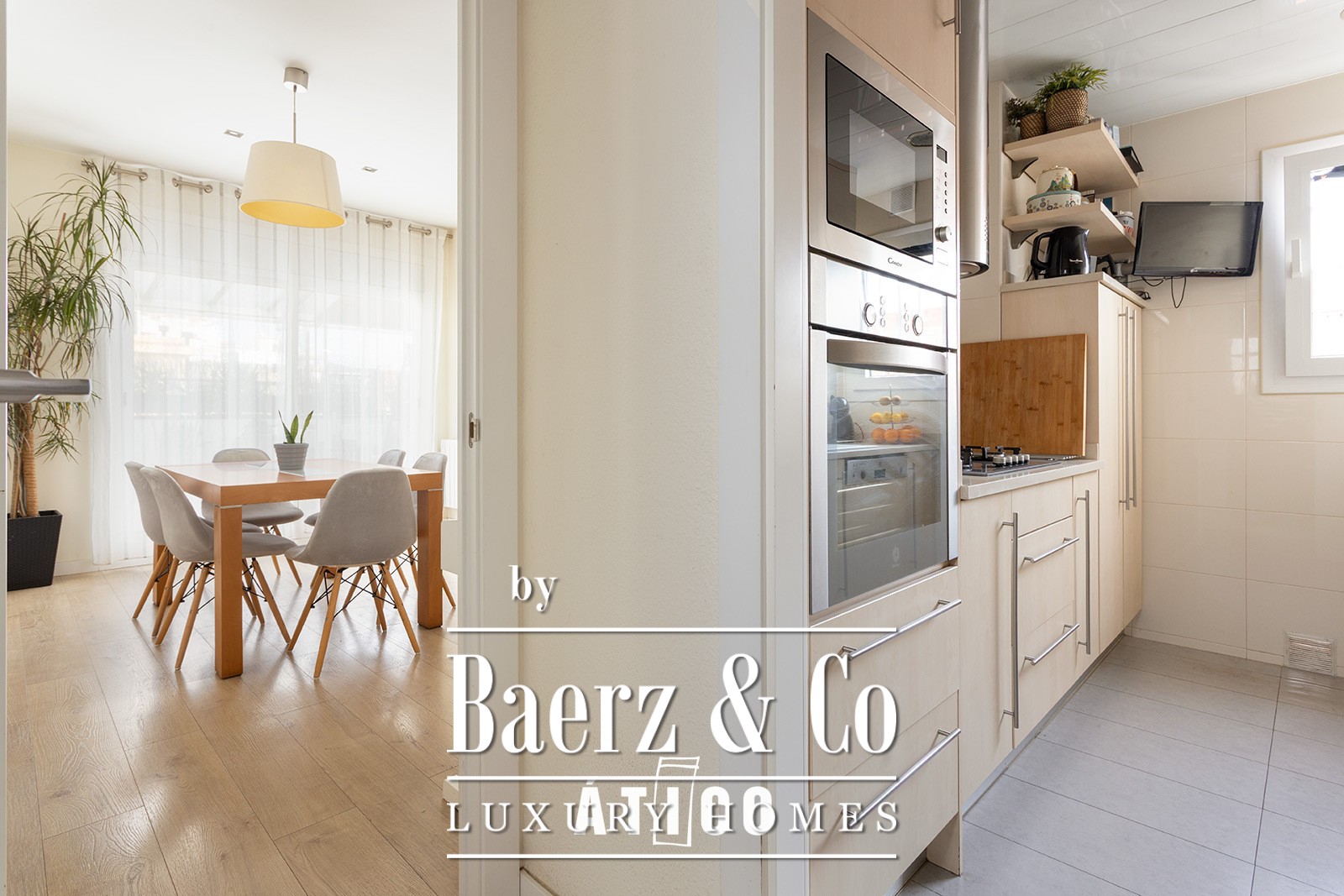 Within, three generously sized bedrooms include one with a walk-in wardrobe, offering both privacy and daily practicality. The large living and dining area flows onto the terrace, amplifying space through natural light and seamless indoor outdoor rhythm. Each room faces outward, ensuring distinguished ventilation and an atmosphere attuned to Barcelona’s gentle climate.
