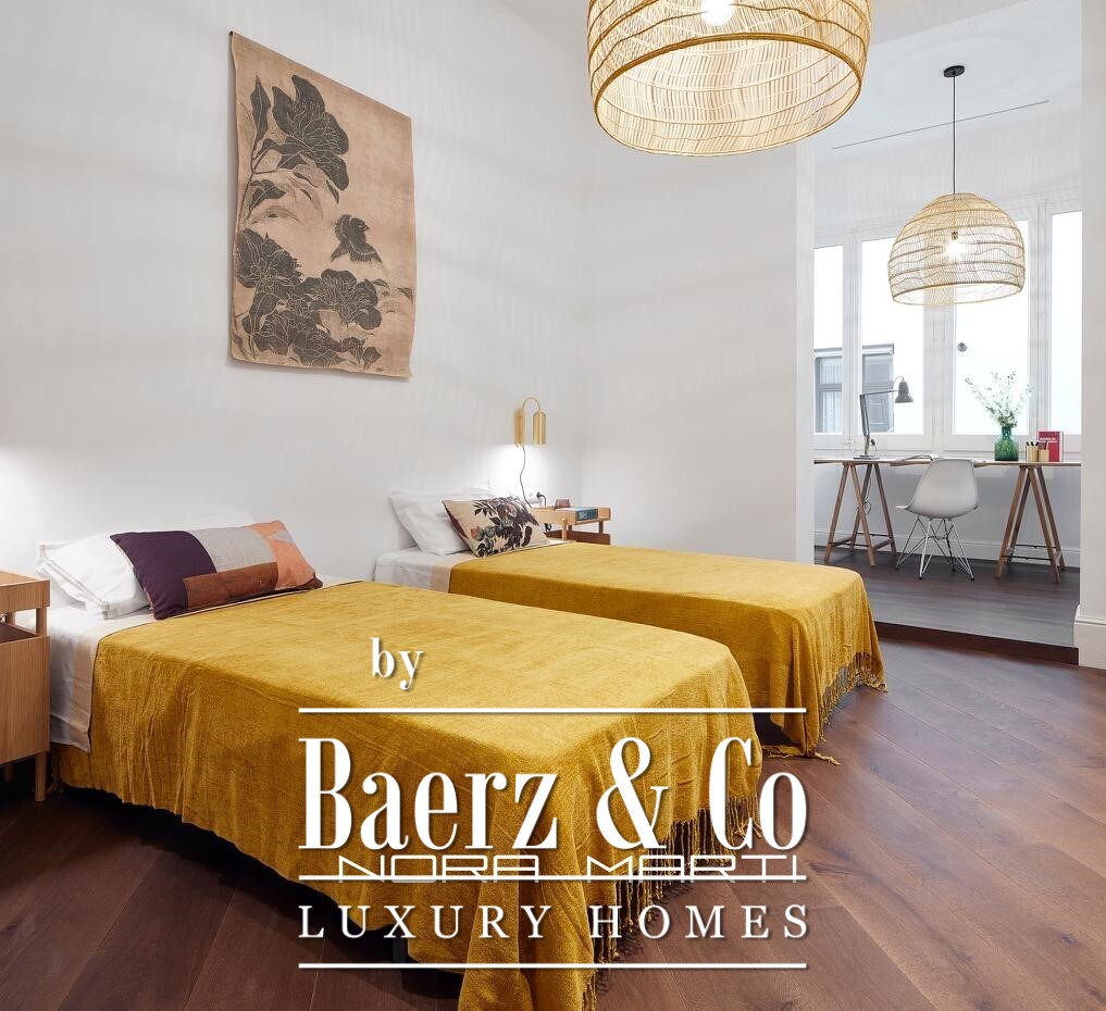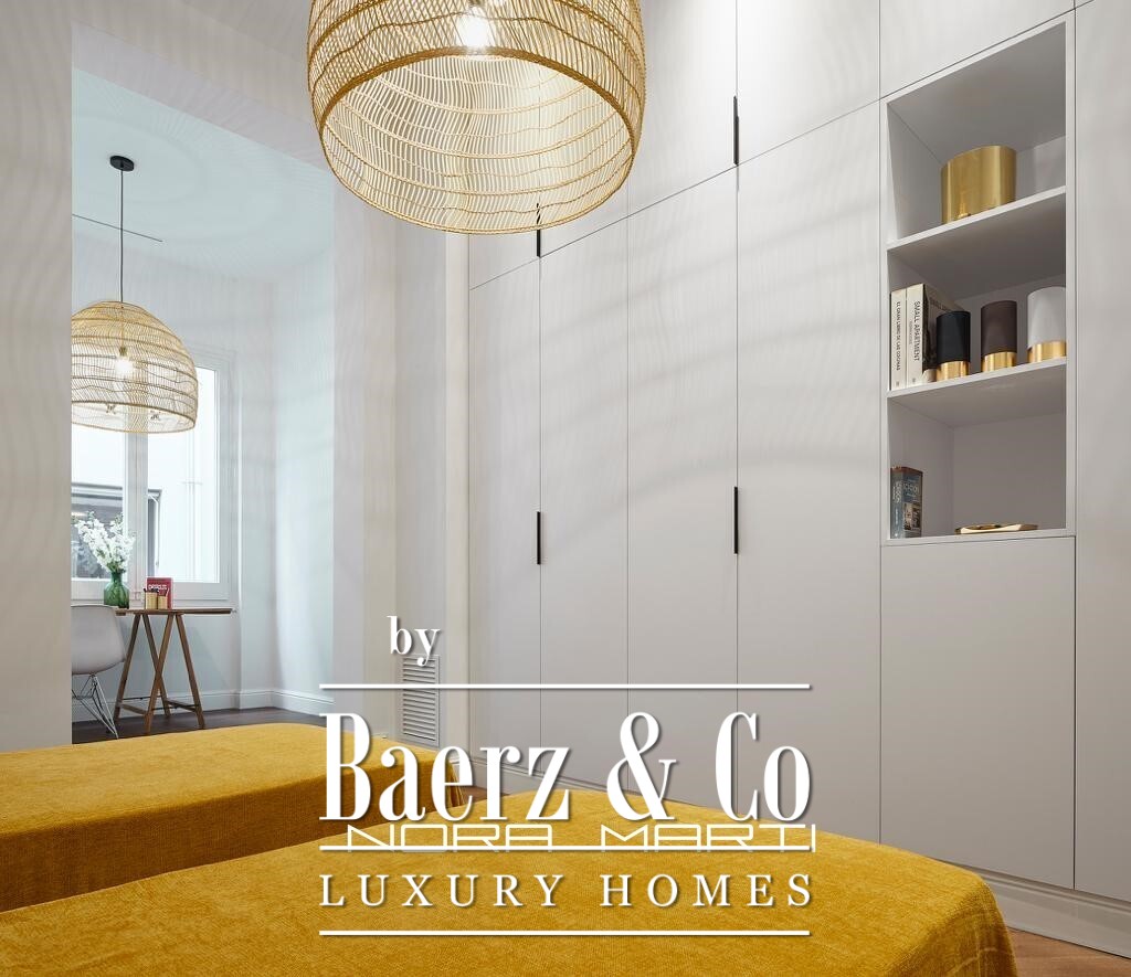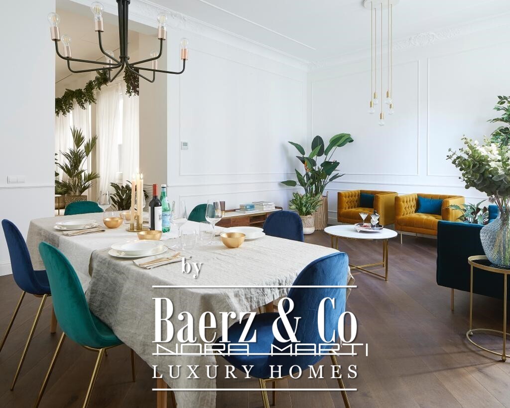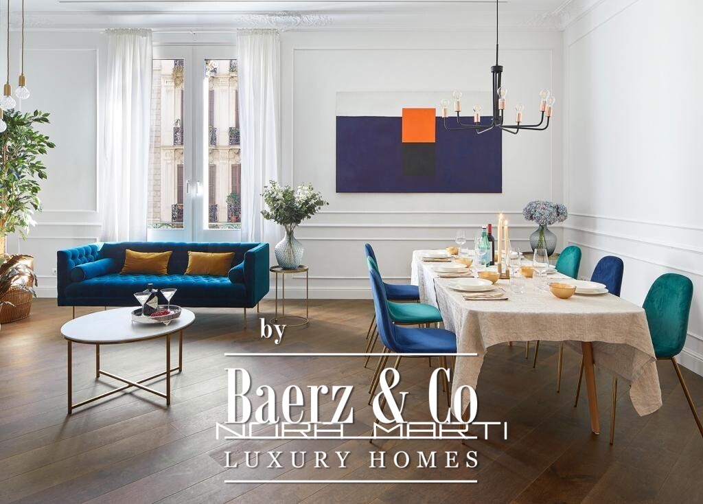 The heart of the apartment is a generous living and dining area, distinguished by high ceilings and original moldings. Carefully curated furnishings and vibrant accents echo Barcelona’s artistic heritage while the use of fine materials imparts both warmth and refinement. The fully equipped kitchen, together with quality-finished bathrooms, reflects a commitment to daily comfort and quiet luxury.