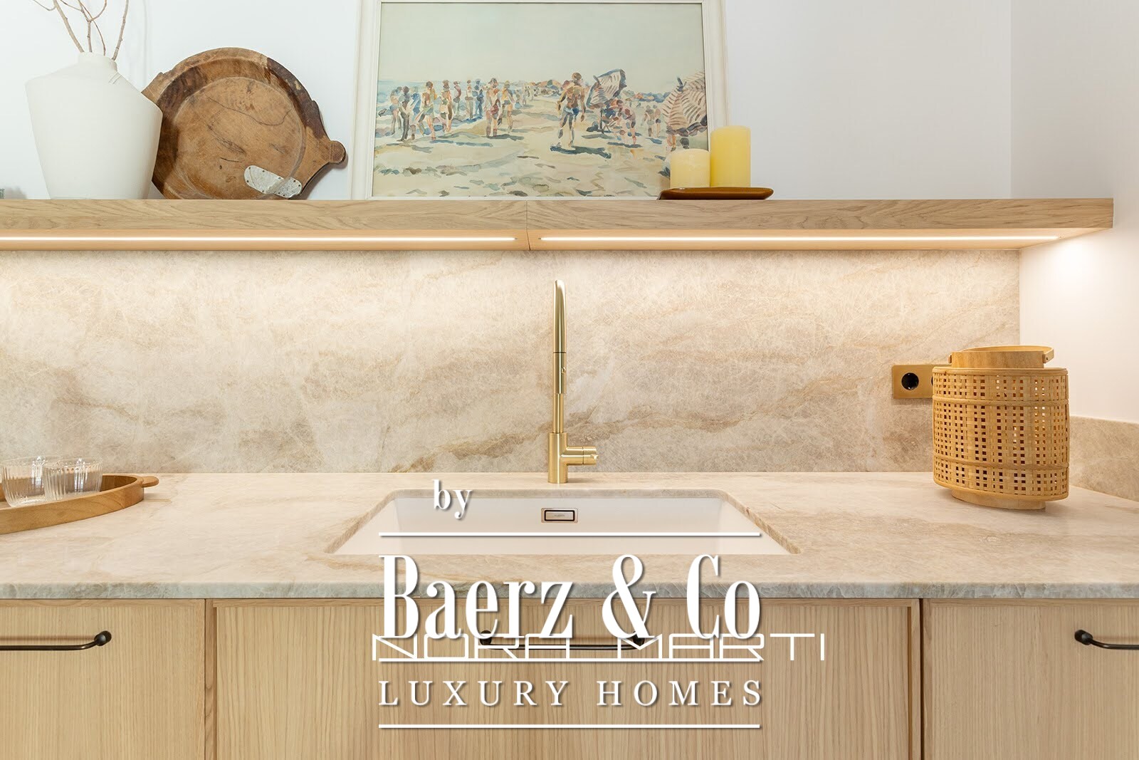 The luxurious renovation focuses on quality and detail while preserving the building's original features and charm. A Catalan vaulted ceiling is visible throughout the apartment, enhancing the feeling of spaciousness and light. The ceiling transforms the living room into a truly exceptional space, featuring handcrafted local tiles and floor-to-ceiling windows that open onto a tranquil terrace; this room is unique and the heart of the living area.