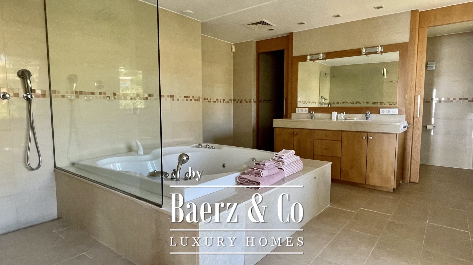 The principal suite measures nearly 70 m², featuring sea views, private terrace access, a fitted dressing room, and a bathroom with Jacuzzi, walk-in shower, and dual toilets. Two further en-suite bedrooms offer direct access to lush gardens, while a private study with solid wood shelving and the sound of a fountain cultivates tranquillity. Each room connects intuitively to the outdoors, maintaining the villa’s strong relationship with its Mediterranean setting.