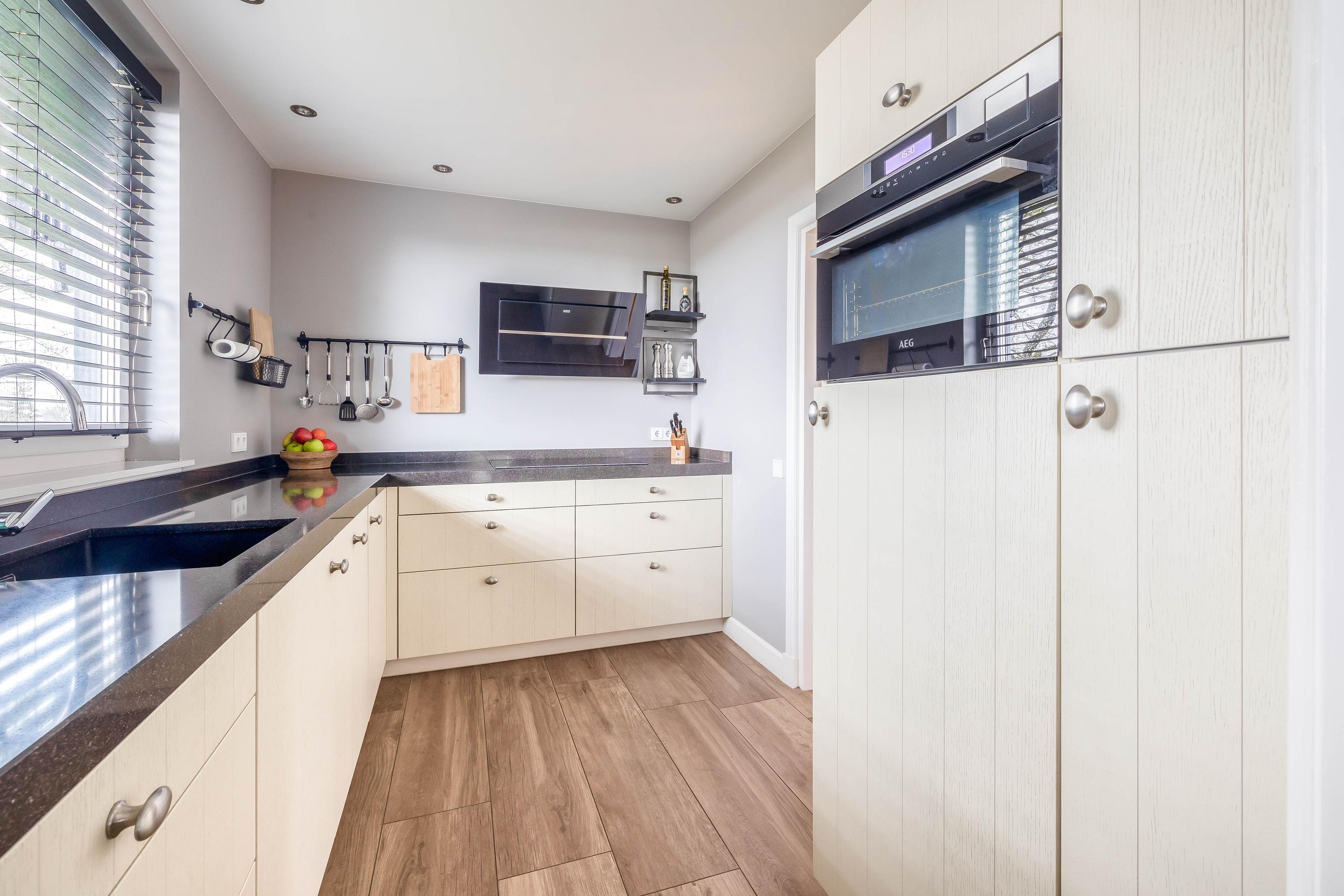 From the stunning, high L-shaped living room (approx. 72 m²), there is a fantastic view of the River Maas. The high ceiling, numerous windows, and double sets of garden doors ensure beautiful natural light. The solid kitchen (approx. 7 m²) is equipped with an induction hob, extractor hood, dishwasher, refrigerator, and a combination steam oven. From here as well, there is a lovely view of the Maas. The kitchen is finished with a composite worktop.