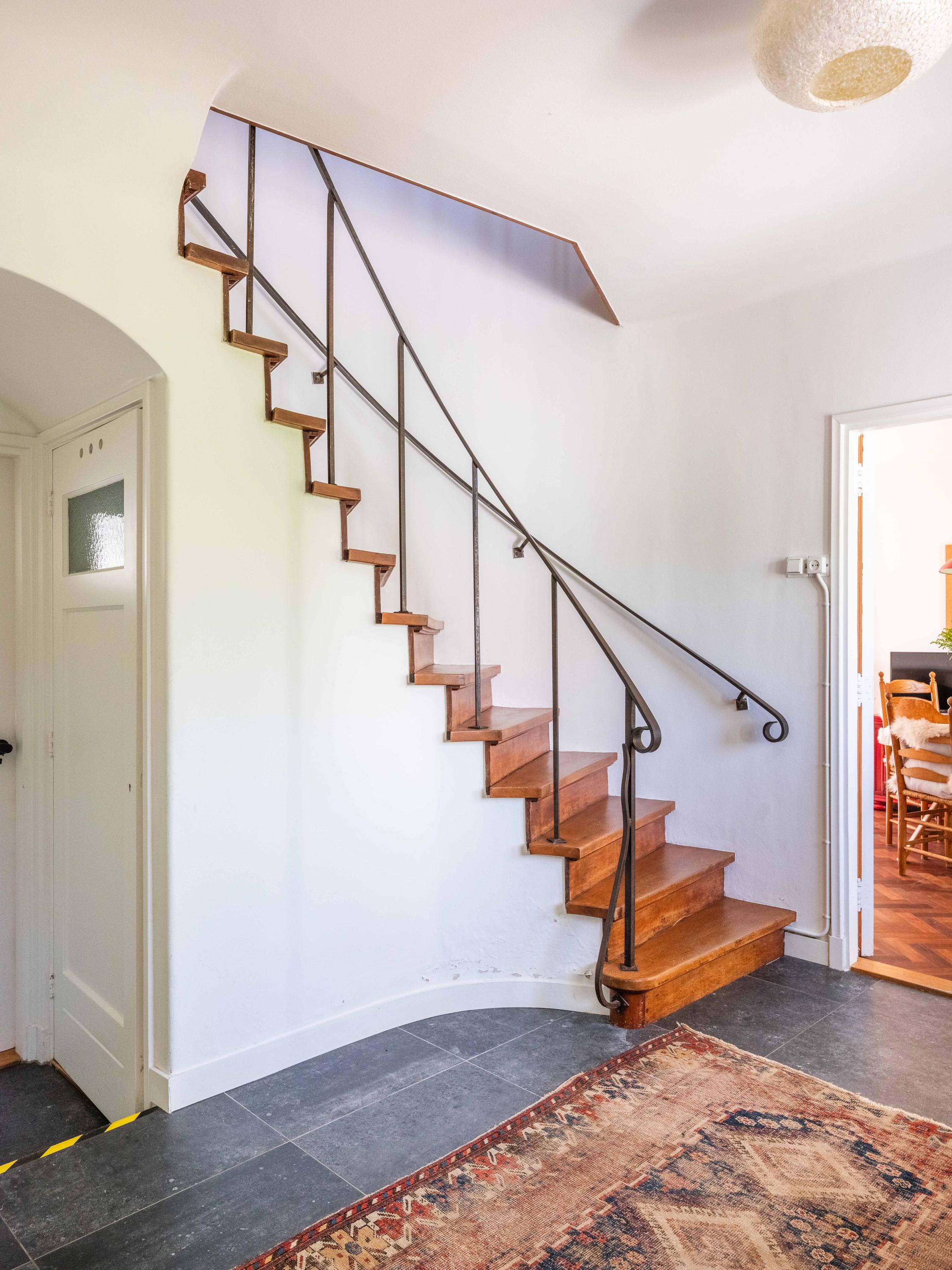 Let us take you inside. Upon entering, you will immediately notice the beautiful entrance hall with a stylish staircase with wrought iron railing, a modern toilet, and a handy basement closet. The living room is bright and cozy with original wooden parquet flooring, a wood-burning stove, and French doors opening onto the green garden. Built-in custom wooden cabinets add extra charm and storage space.