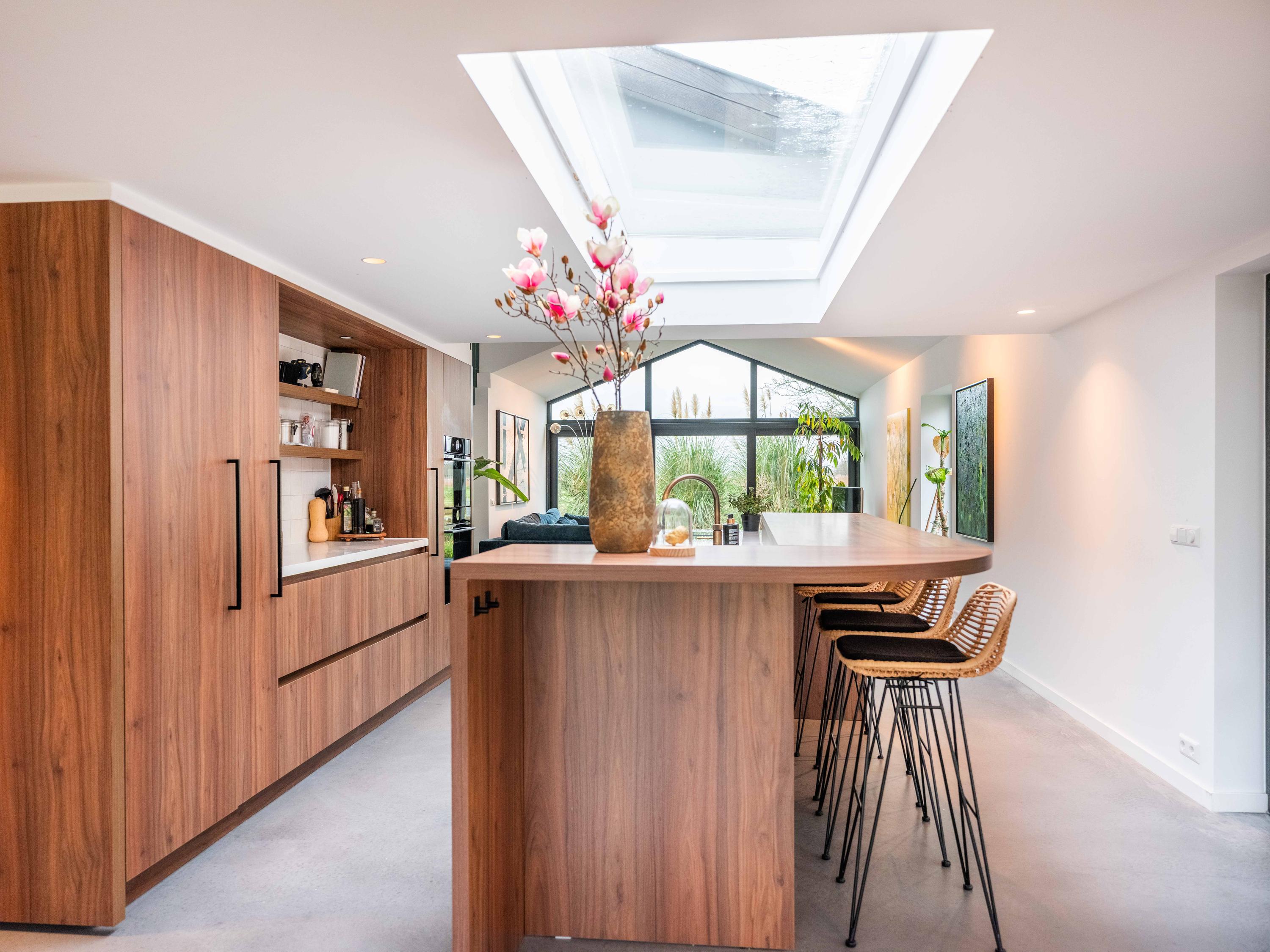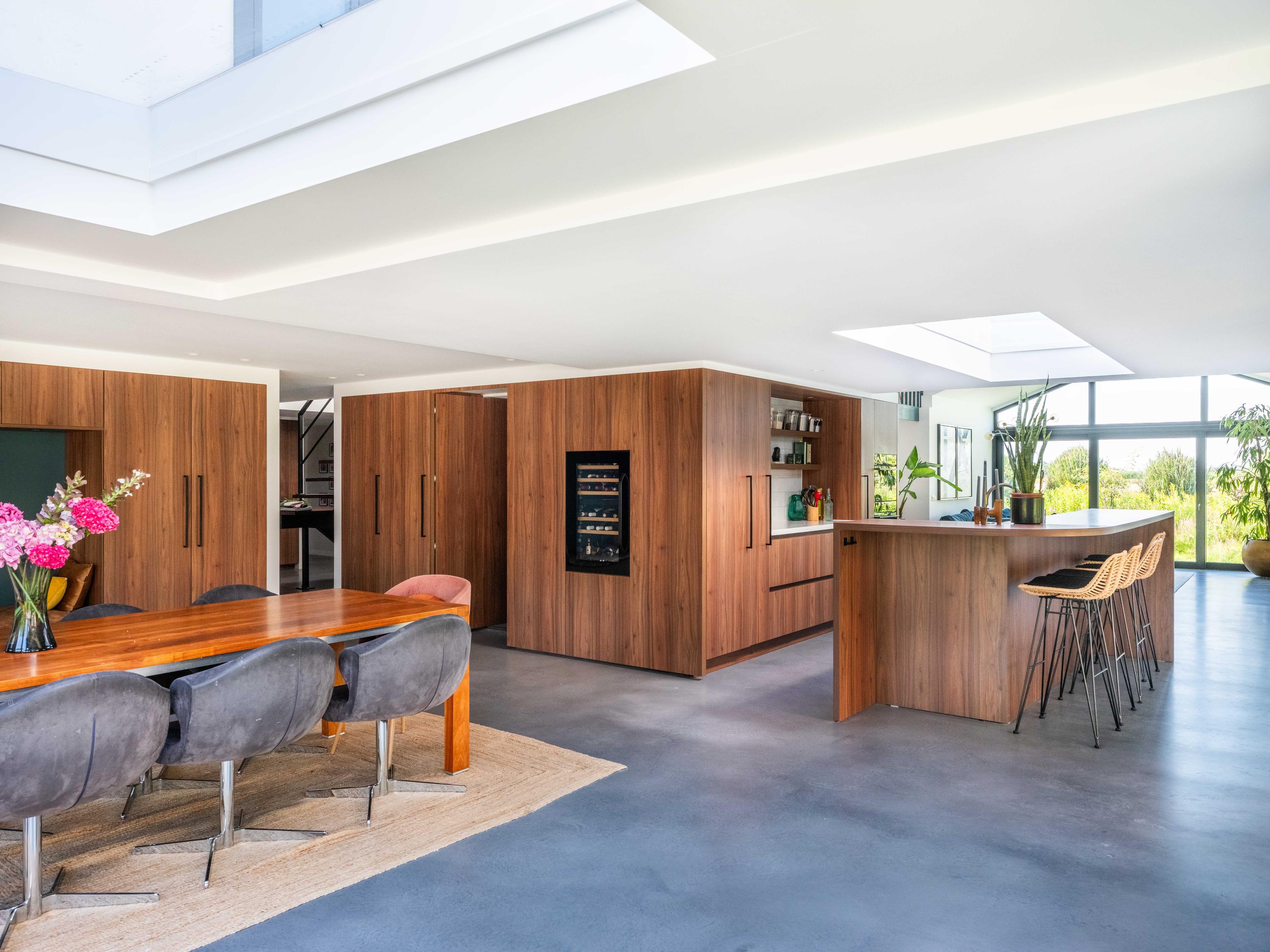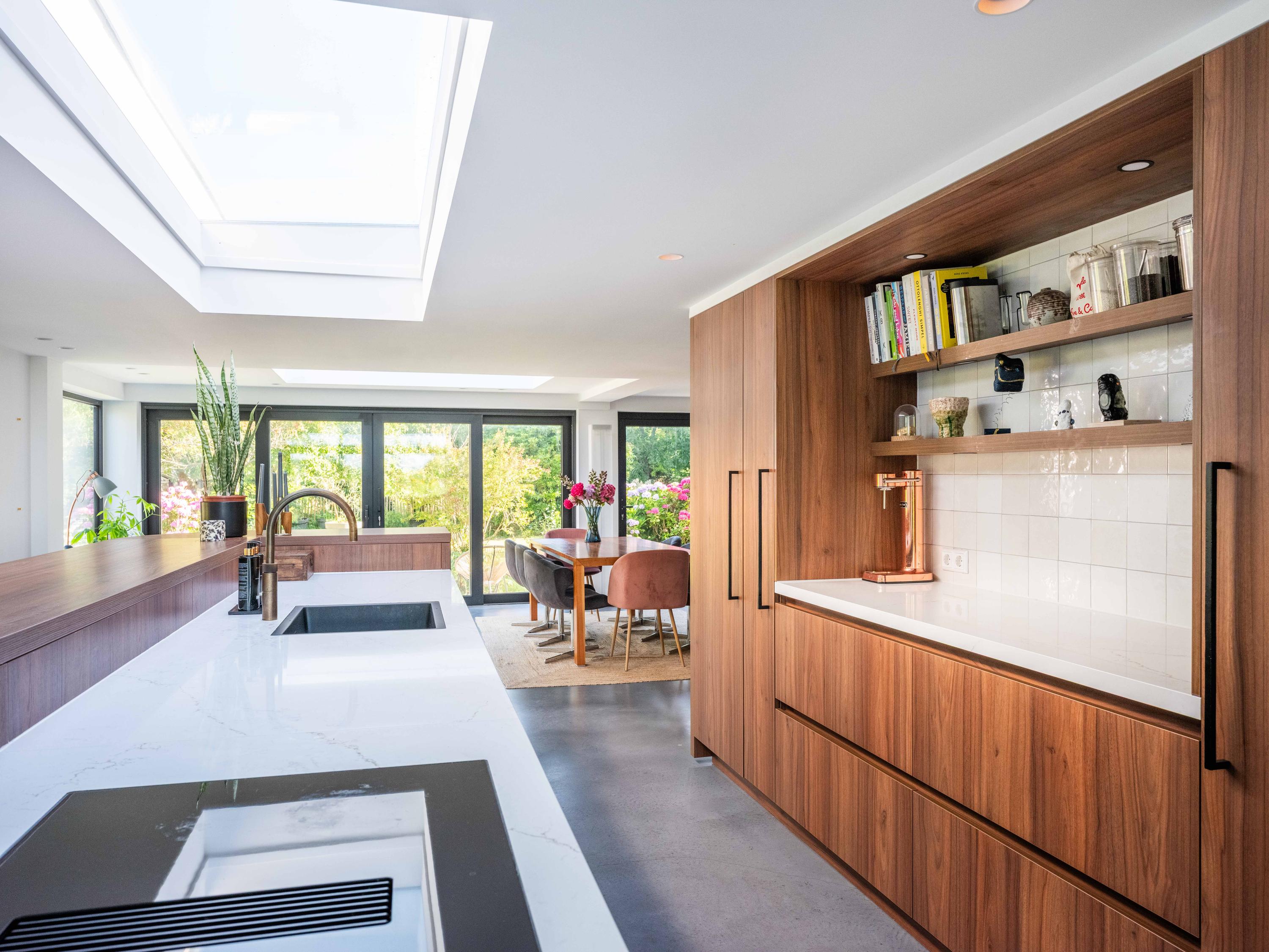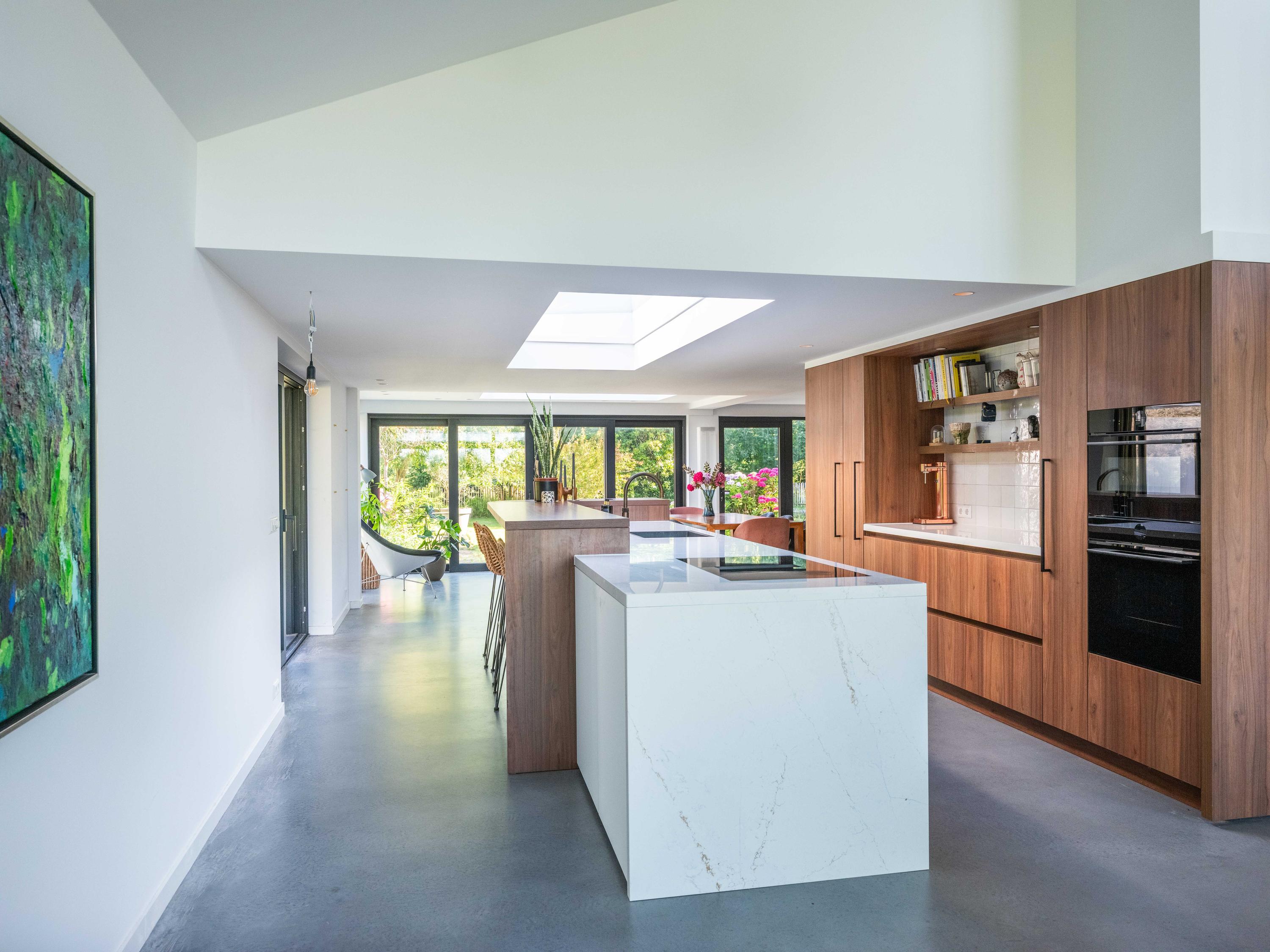 The custom-made kitchen in rich walnut is a dream for any cooking enthusiast. Fully equipped with high-end appliances, including a luxury wine climate cabinet, it also features an architectural highlight: a walnut wall with a hidden door, revealing a spacious utility room behind it. The front-facing living room offers a cozy reading or play corner with panoramic views of the polder, while the rear-facing dining area is bright and airy with large skylights, custom cabinets, and French doors opening onto the garden.