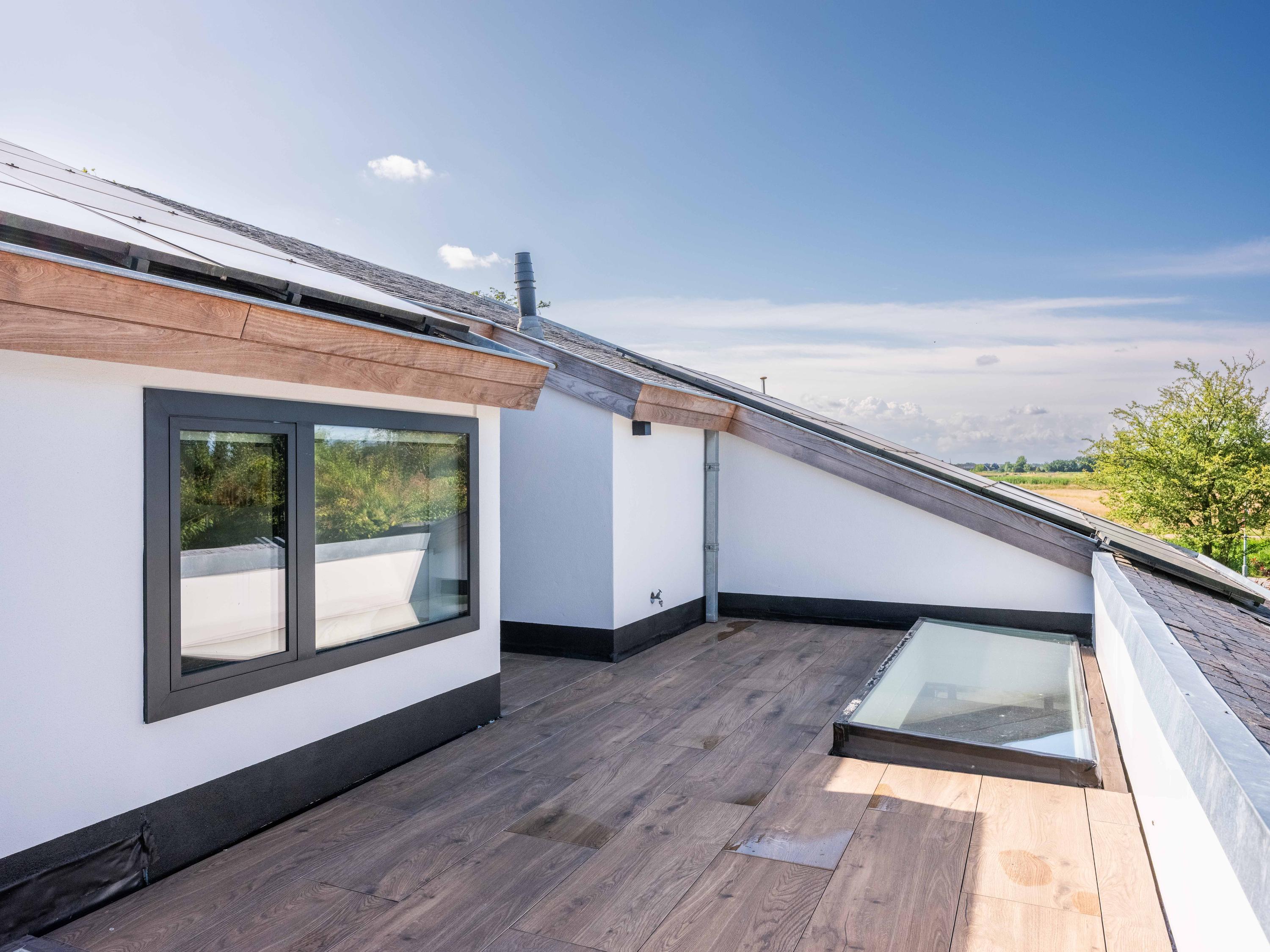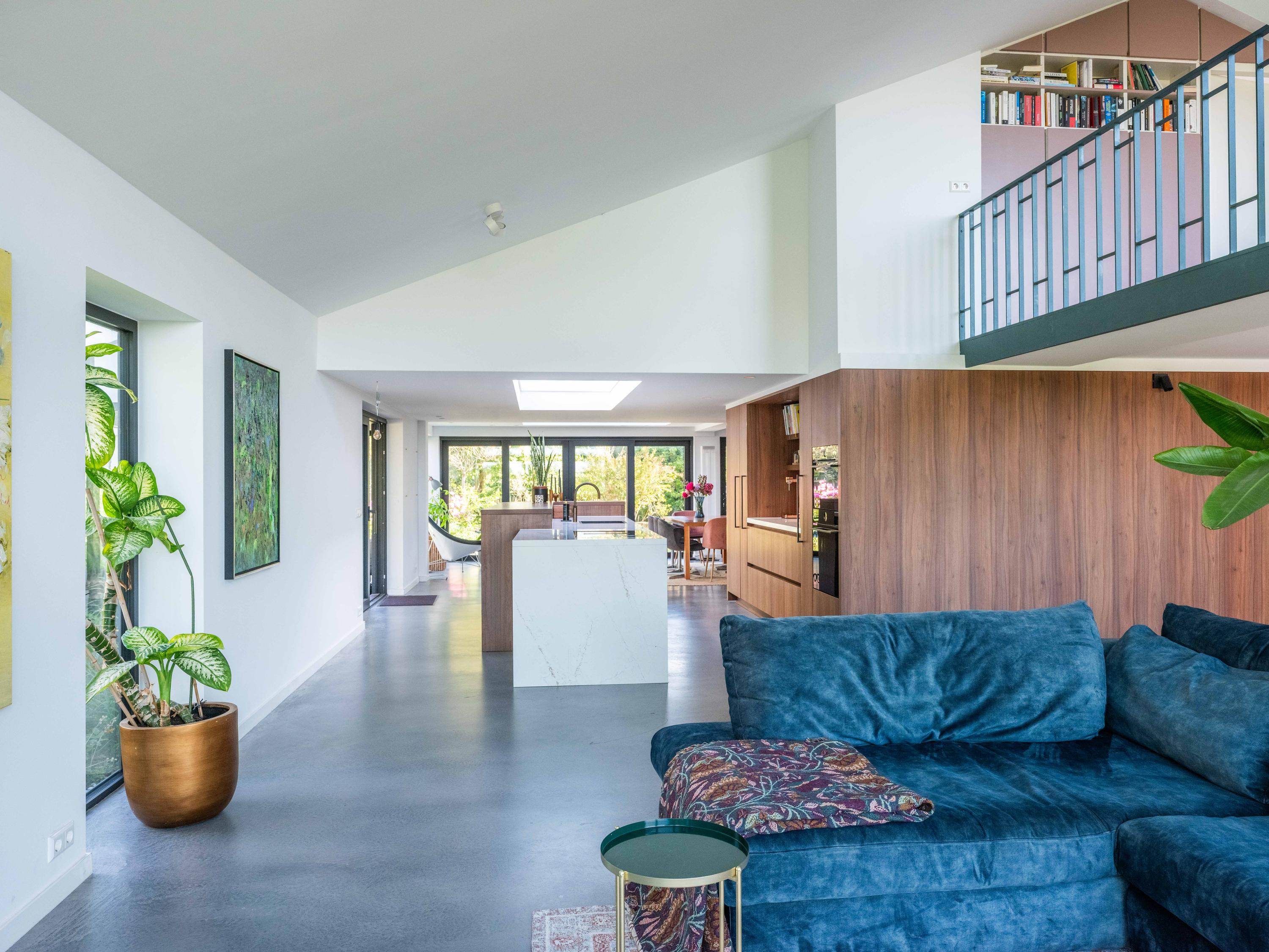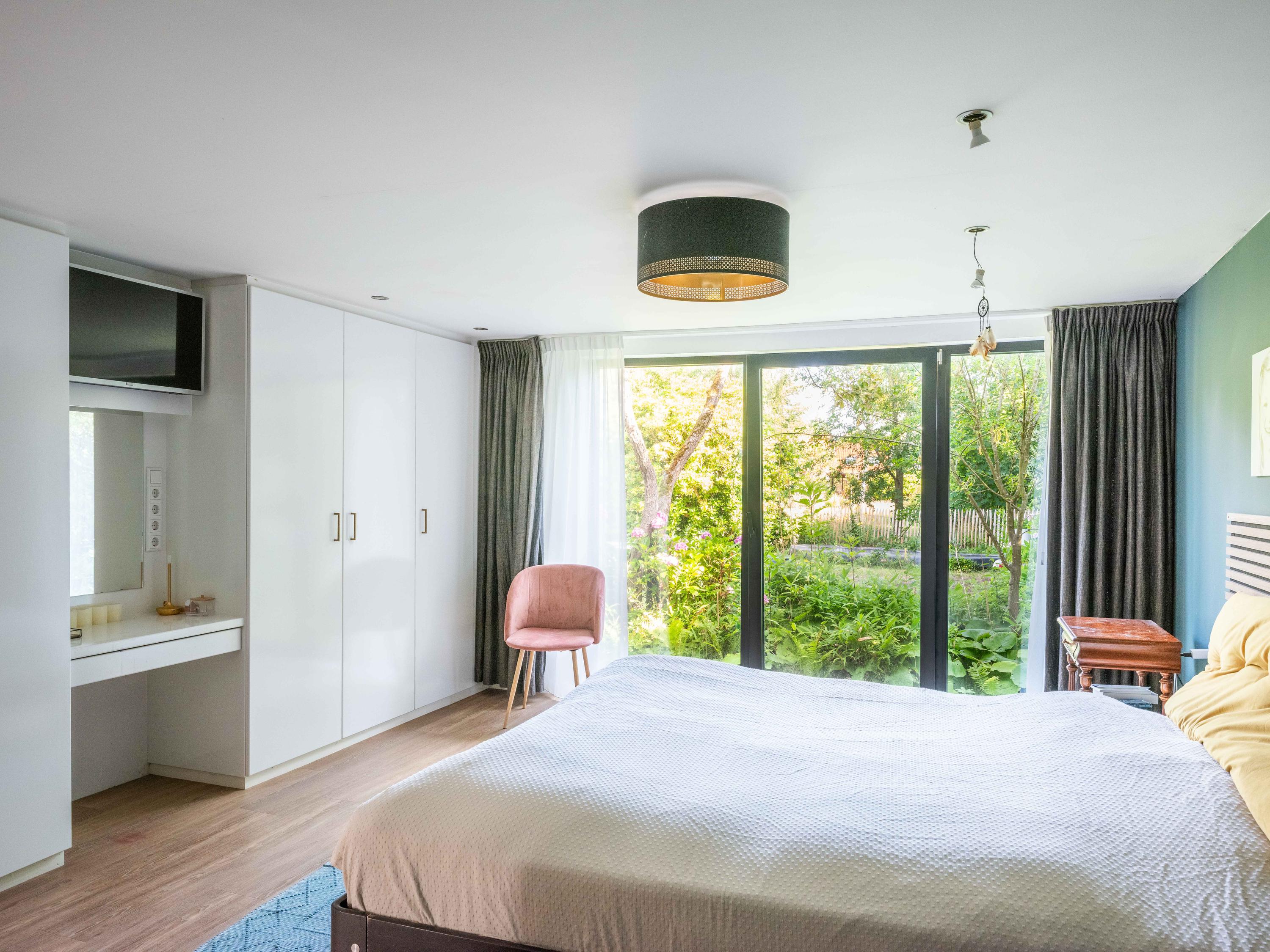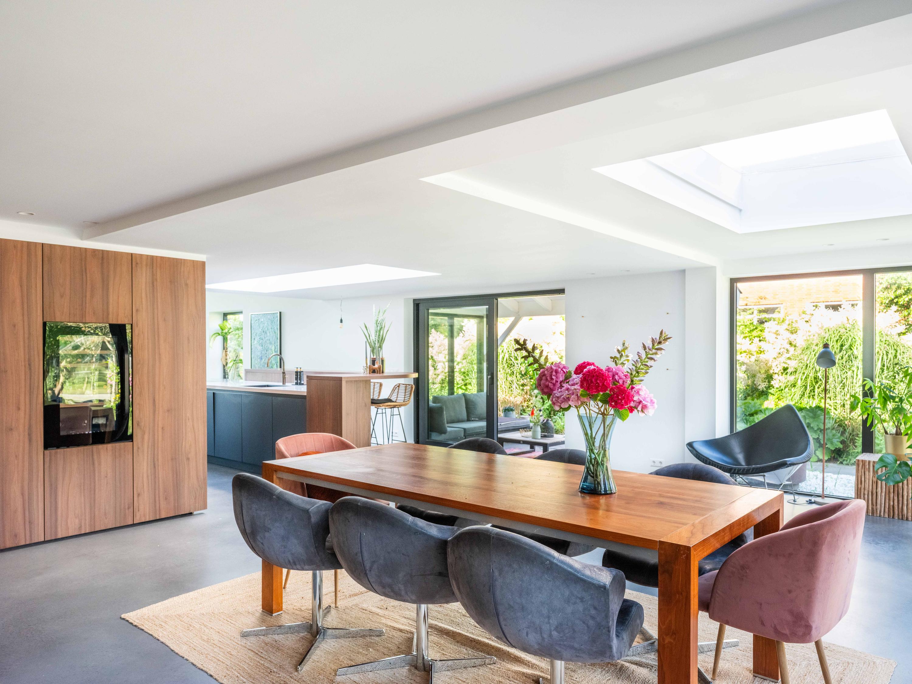 The custom-made kitchen in rich walnut is a dream for any cooking enthusiast. Fully equipped with high-end appliances, including a luxury wine climate cabinet, it also features an architectural highlight: a walnut wall with a hidden door, revealing a spacious utility room behind it. The front-facing living room offers a cozy reading or play corner with panoramic views of the polder, while the rear-facing dining area is bright and airy with large skylights, custom cabinets, and French doors opening onto the garden.