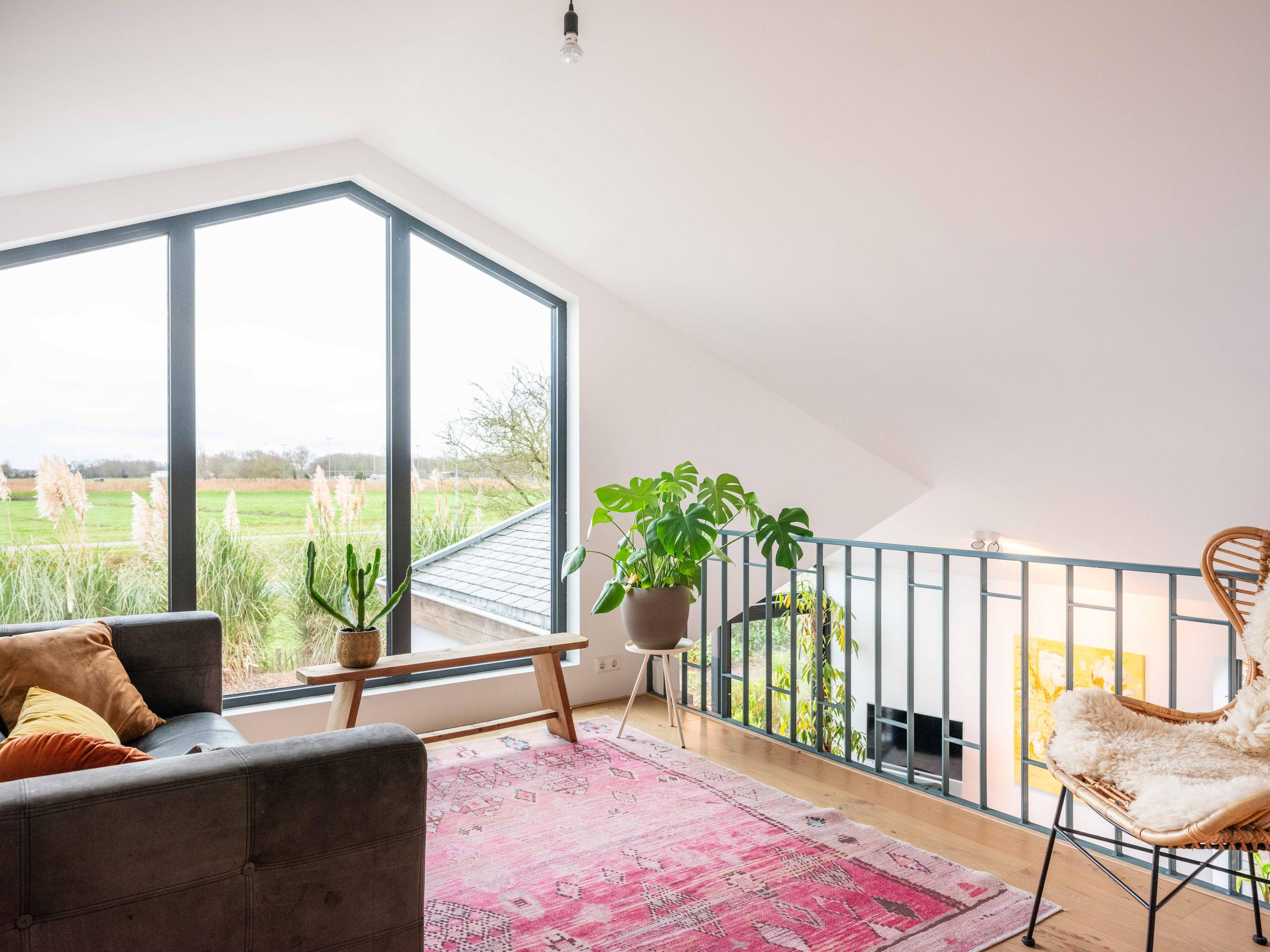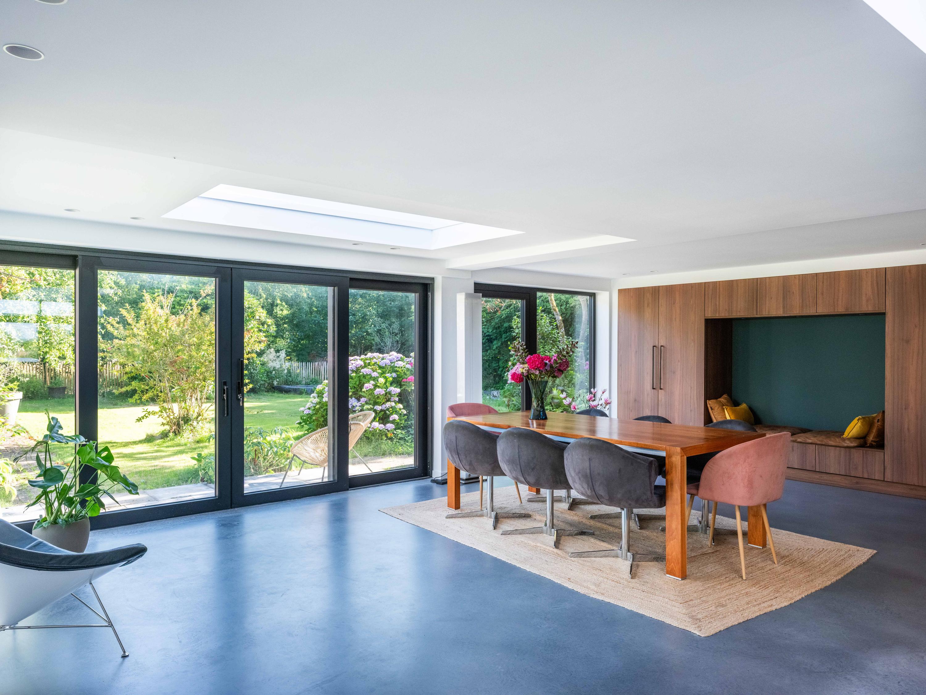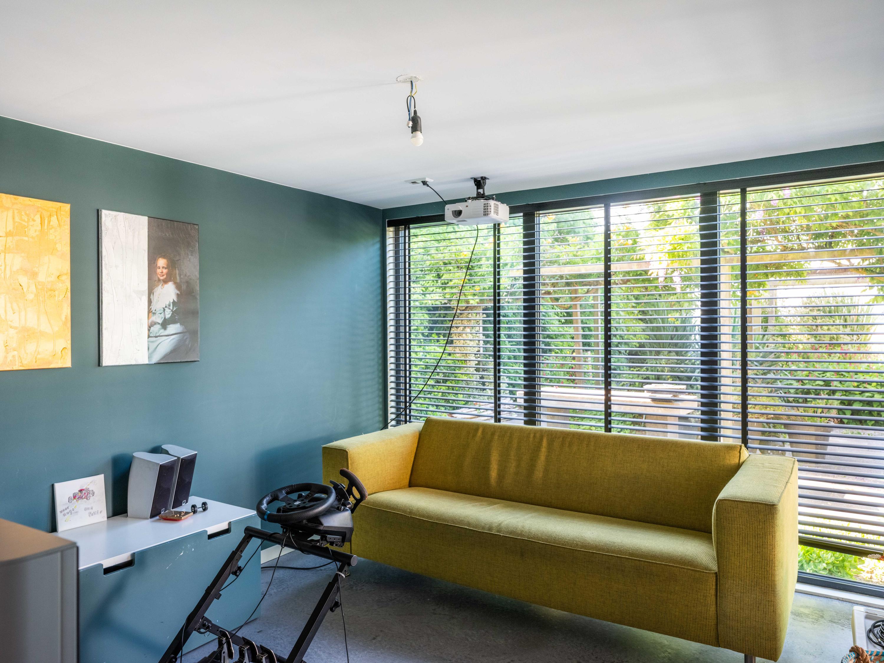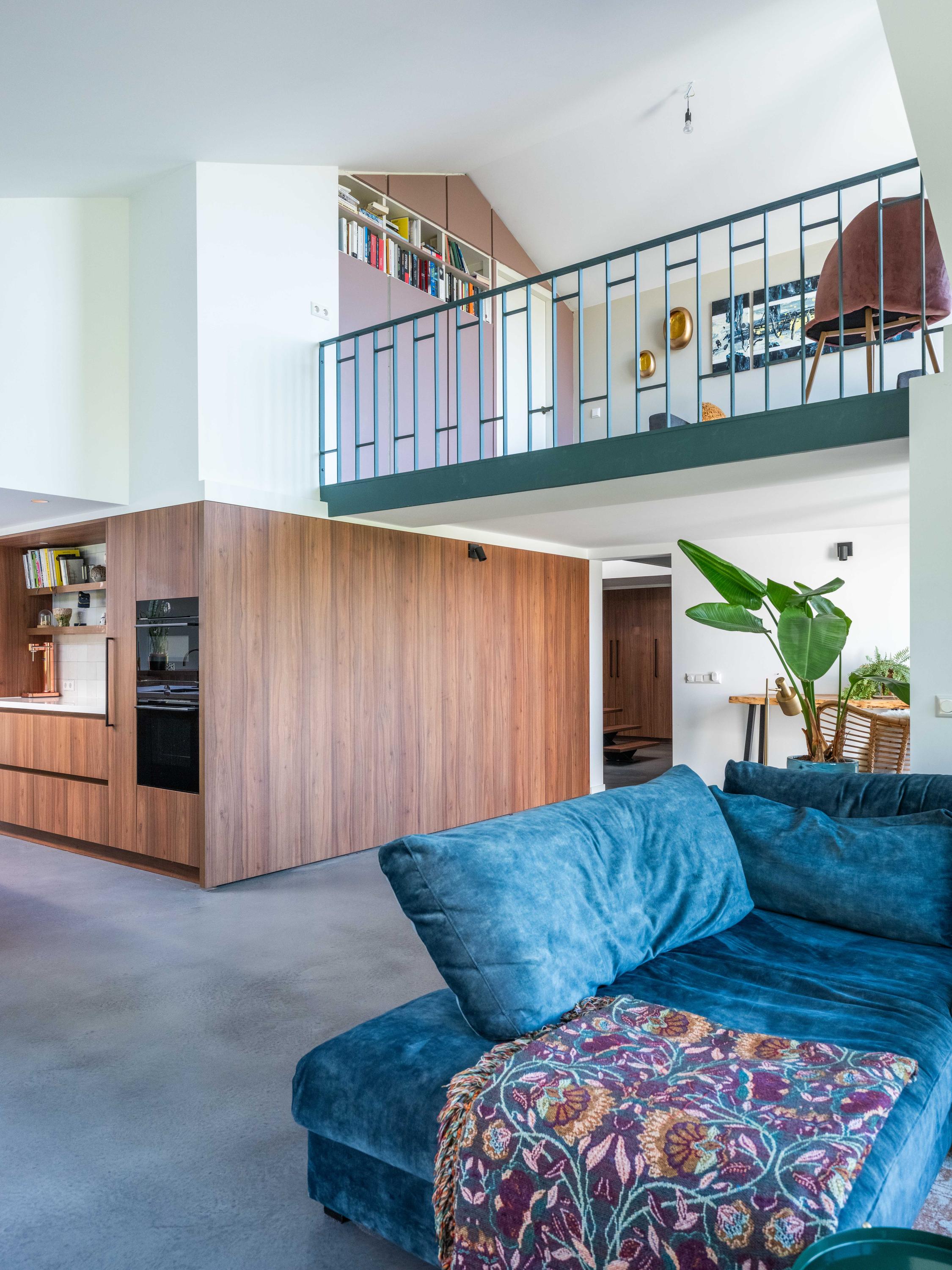 The custom-made kitchen in rich walnut is a dream for any cooking enthusiast. Fully equipped with high-end appliances, including a luxury wine climate cabinet, it also features an architectural highlight: a walnut wall with a hidden door, revealing a spacious utility room behind it. The front-facing living room offers a cozy reading or play corner with panoramic views of the polder, while the rear-facing dining area is bright and airy with large skylights, custom cabinets, and French doors opening onto the garden.