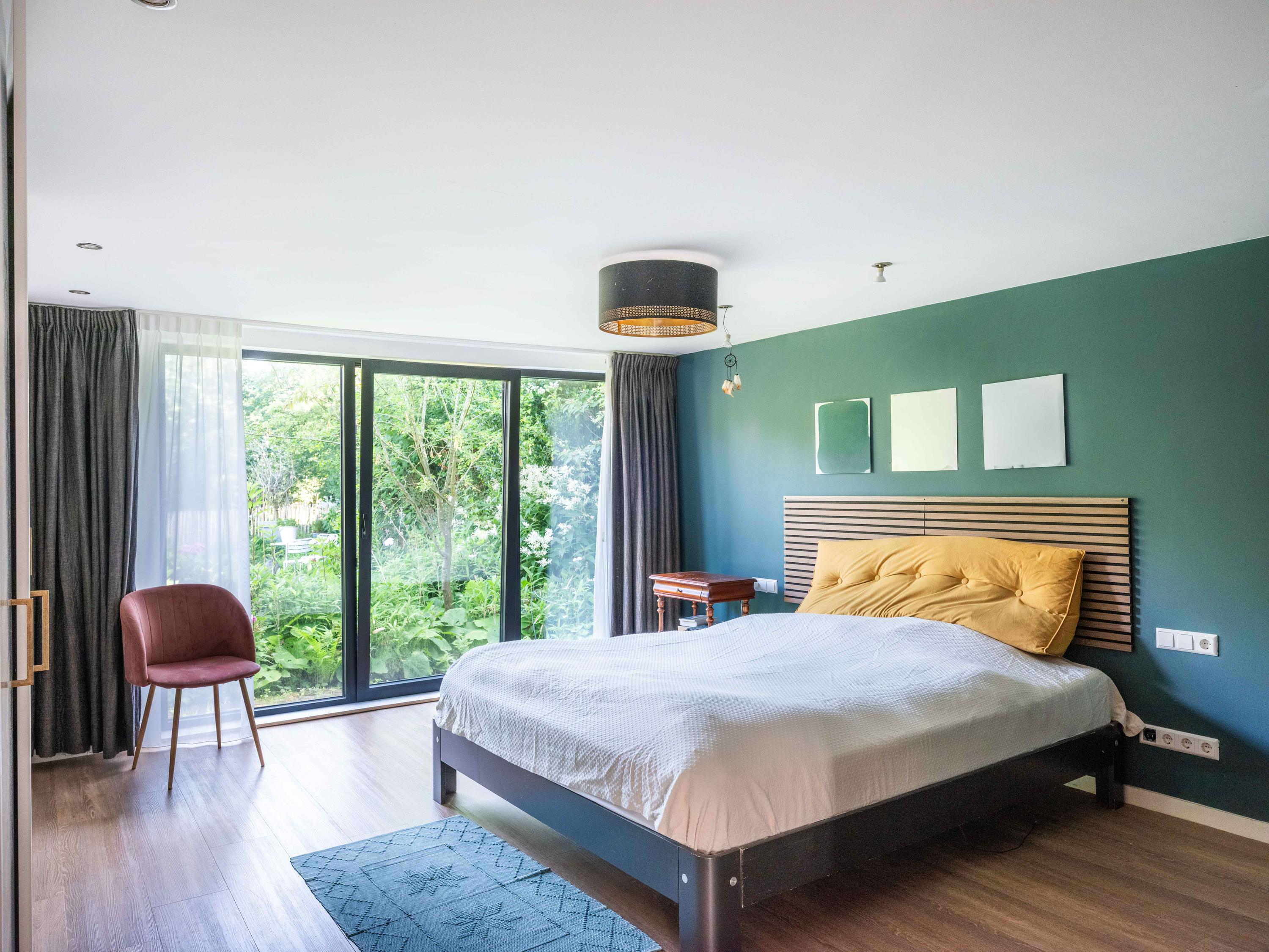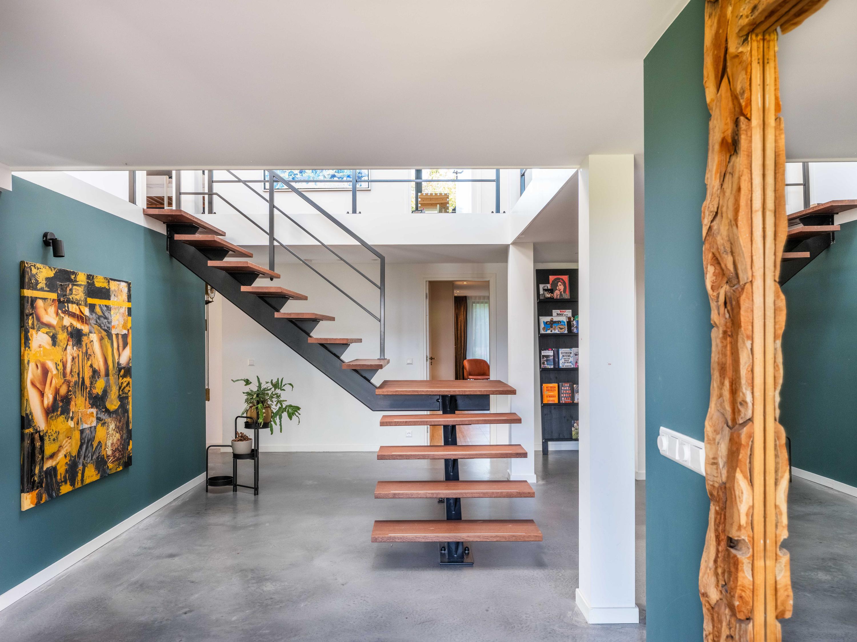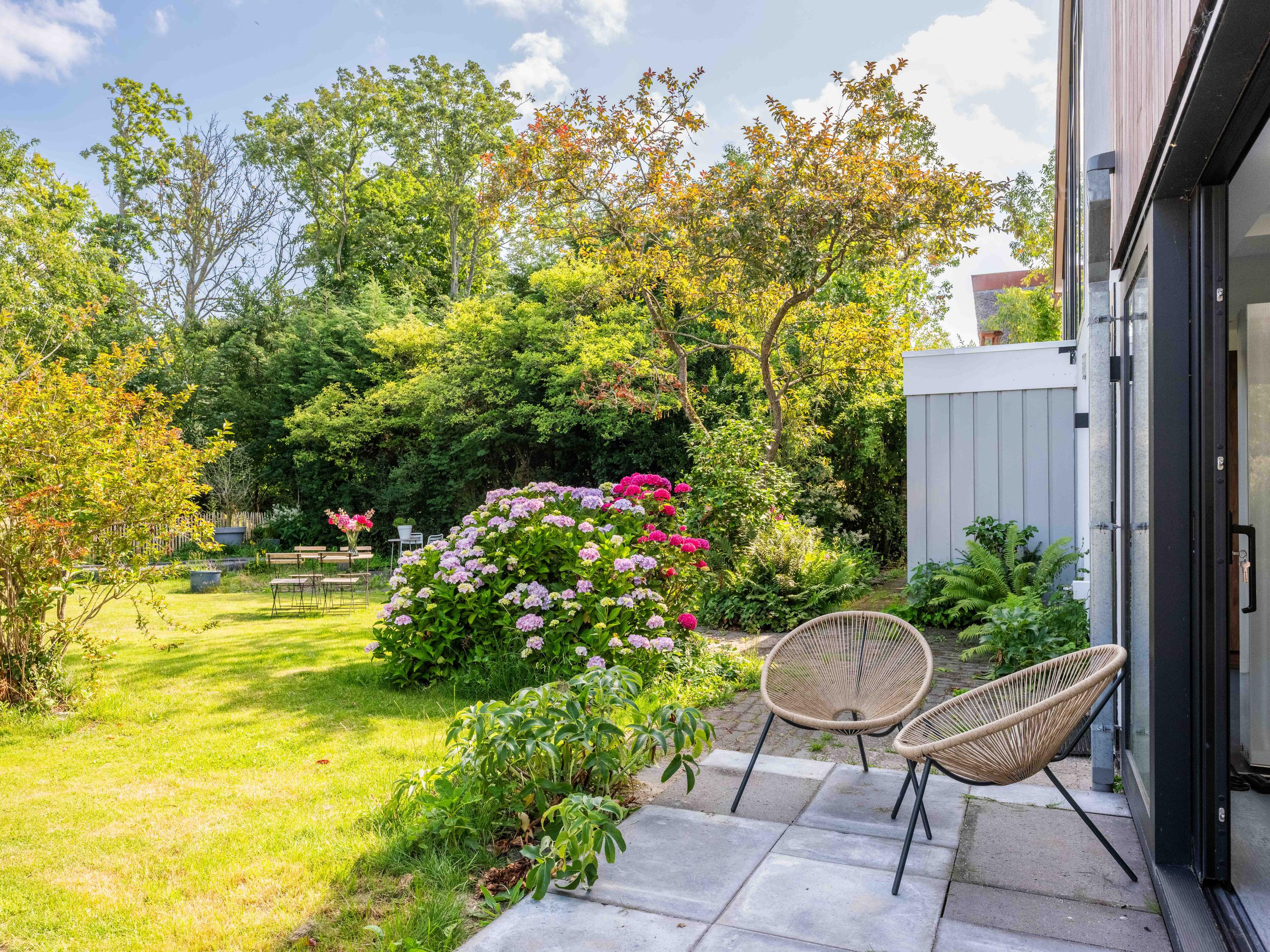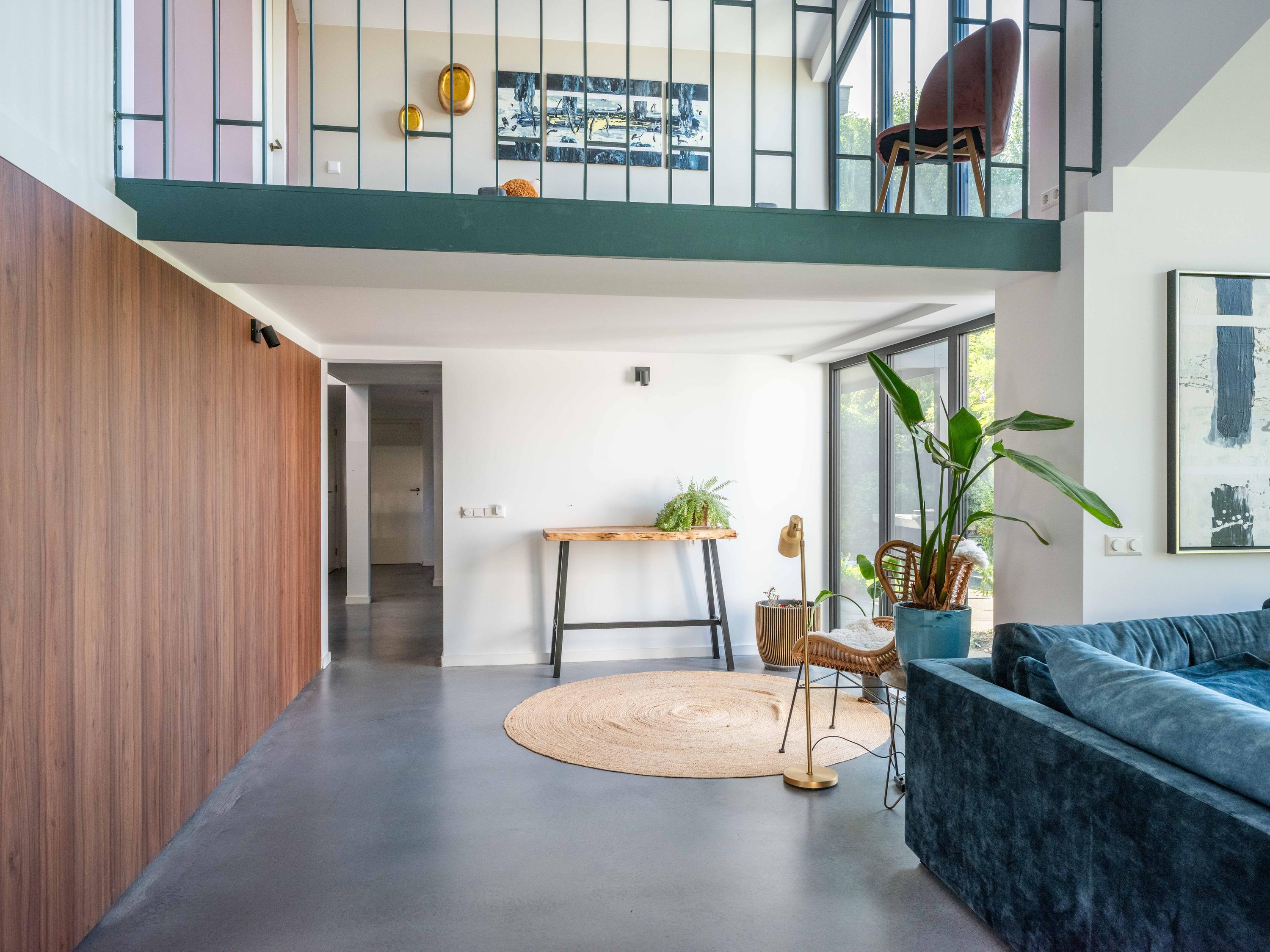 The custom-made kitchen in rich walnut is a dream for any cooking enthusiast. Fully equipped with high-end appliances, including a luxury wine climate cabinet, it also features an architectural highlight: a walnut wall with a hidden door, revealing a spacious utility room behind it. The front-facing living room offers a cozy reading or play corner with panoramic views of the polder, while the rear-facing dining area is bright and airy with large skylights, custom cabinets, and French doors opening onto the garden.
