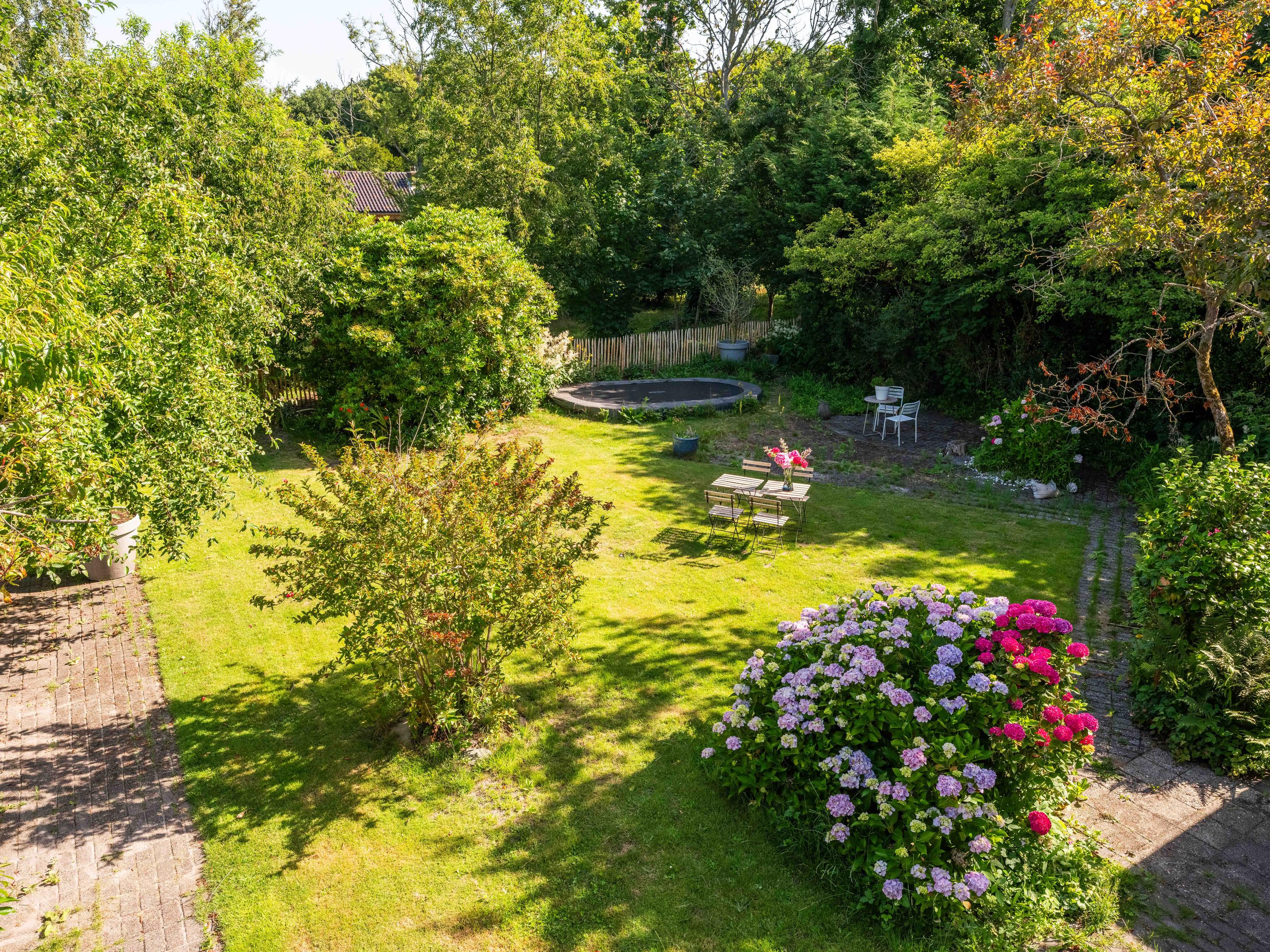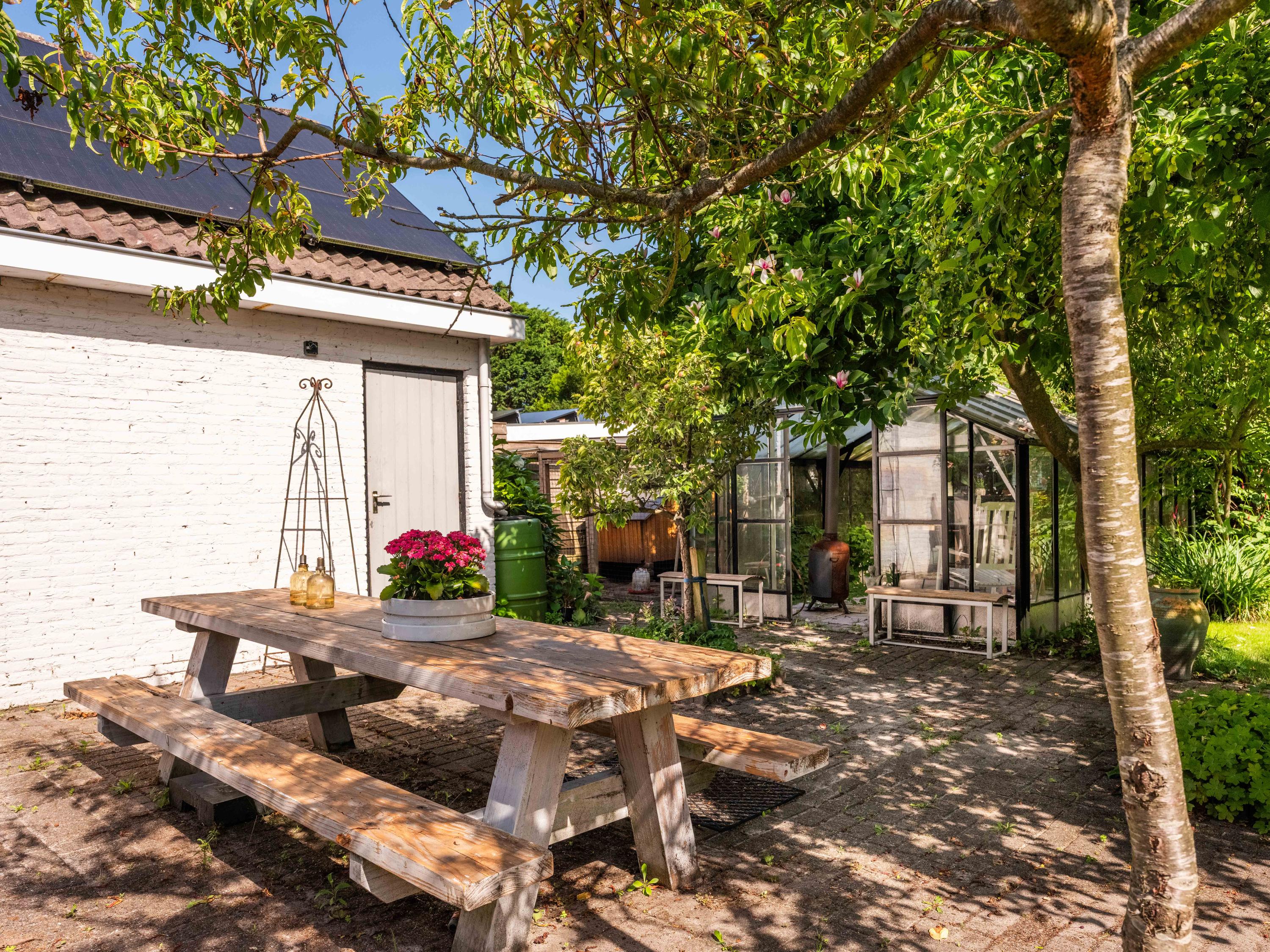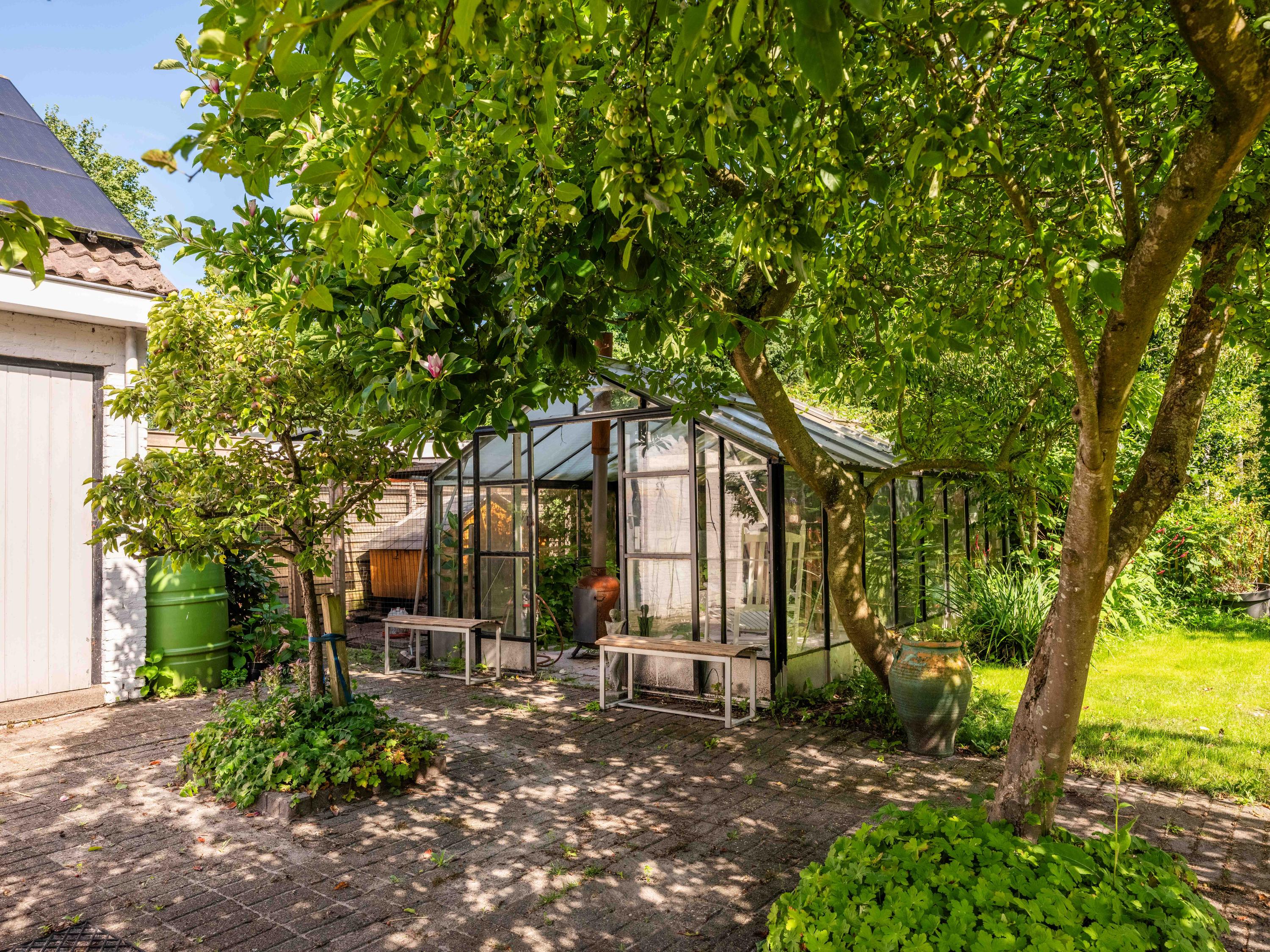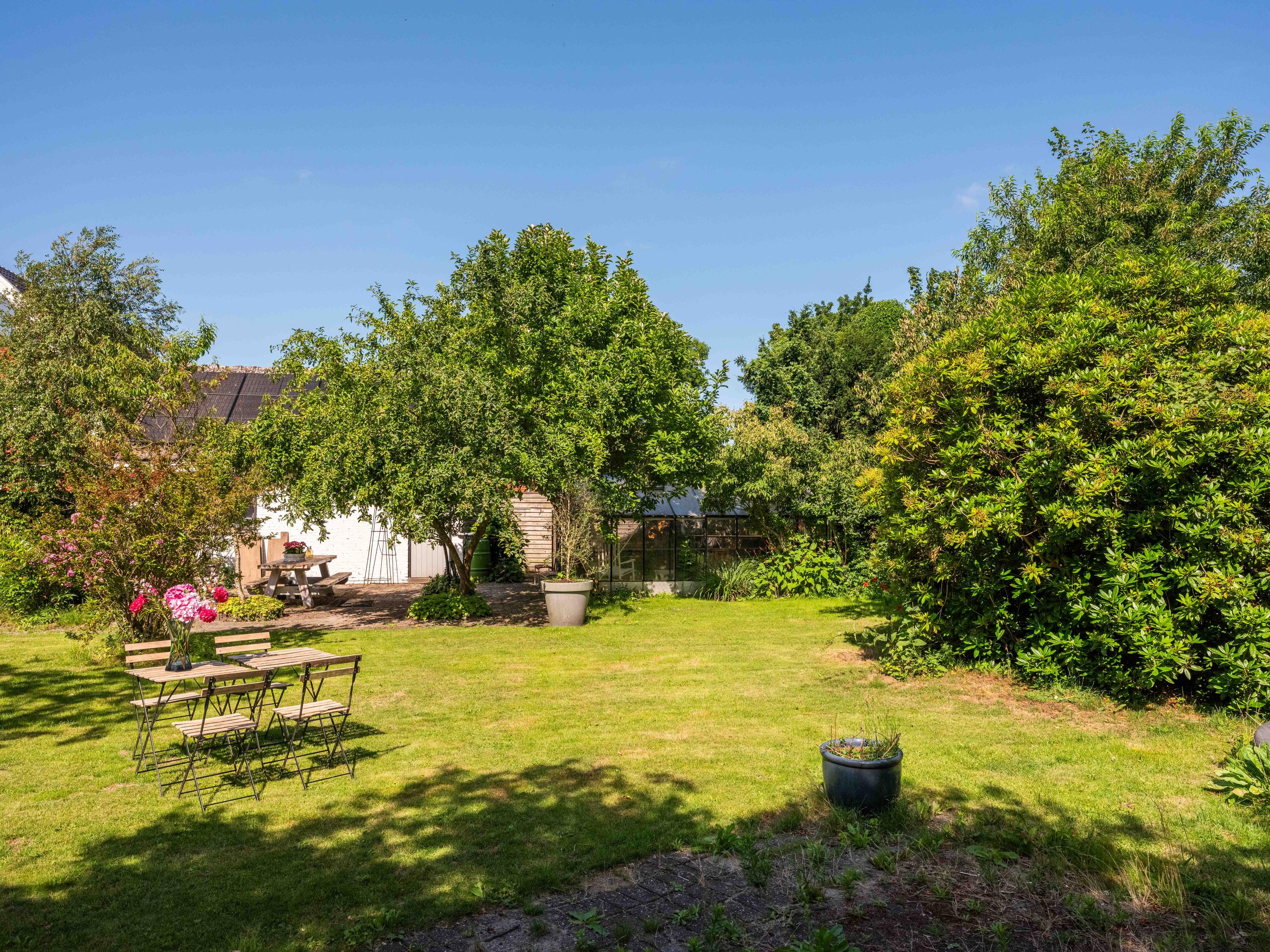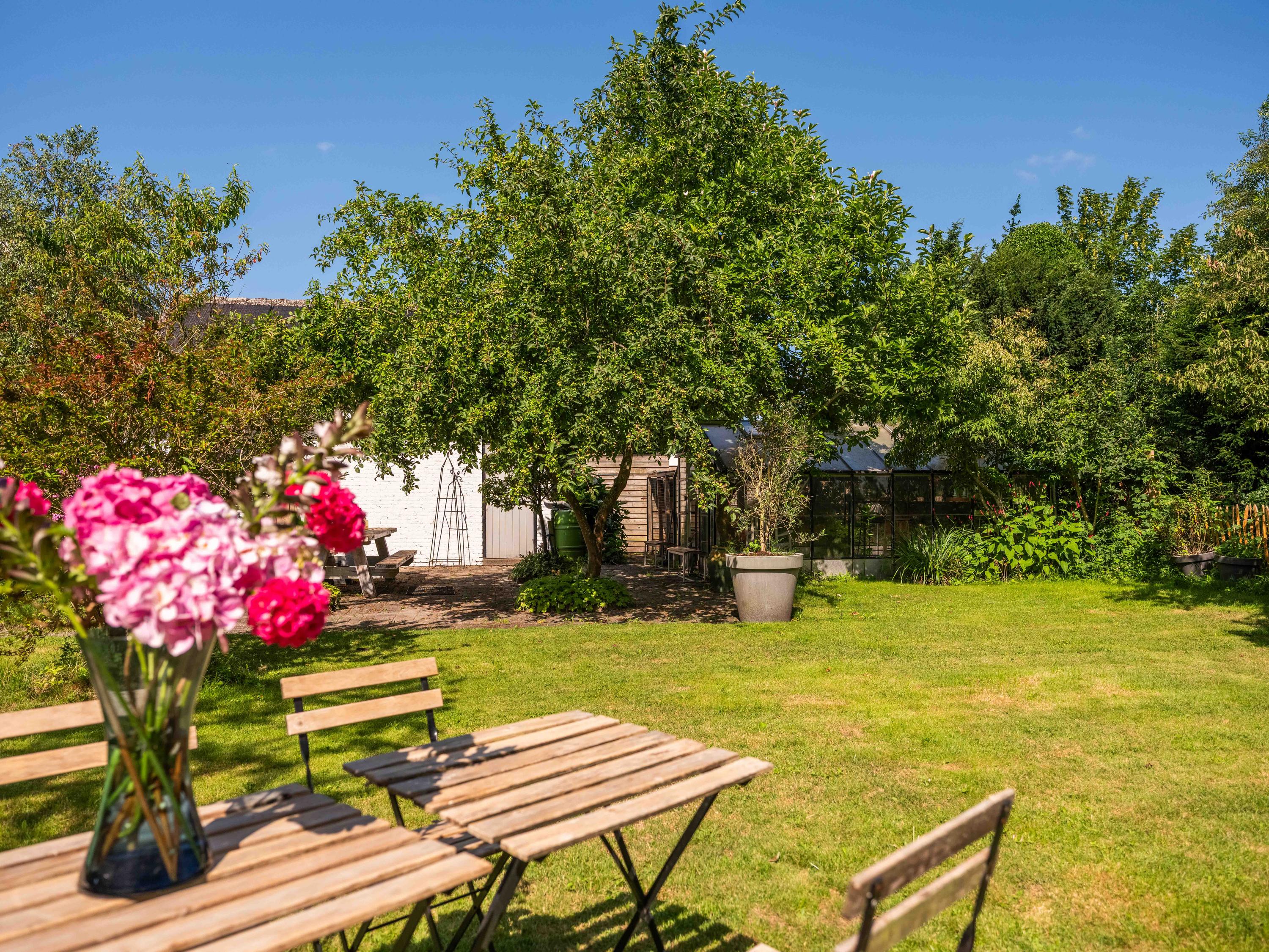 The surrounding garden offers complete privacy, with both sun and shade. A greenhouse, currently used as a cozy lounge with an outdoor fireplace, is perfect for long summer evenings with friends and family. There is also a large detached stone garage (approx. 50 m²) with storage loft, suitable for two cars.
