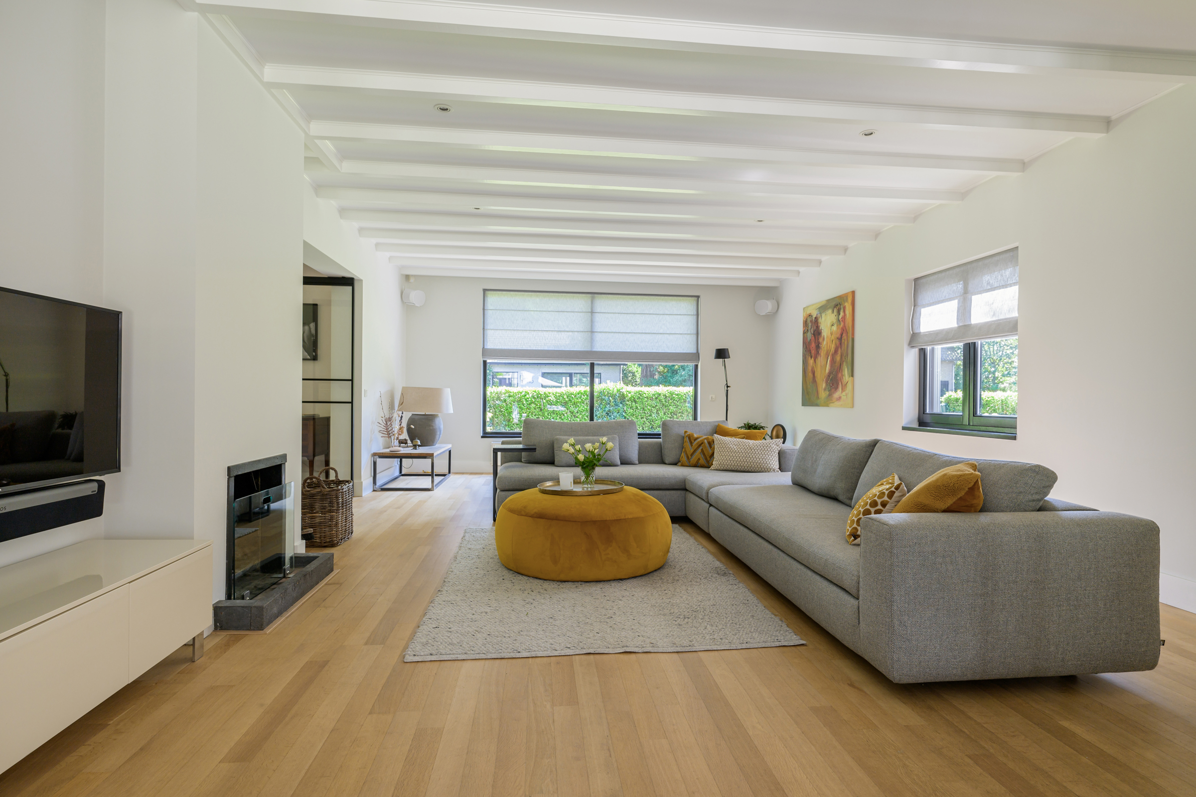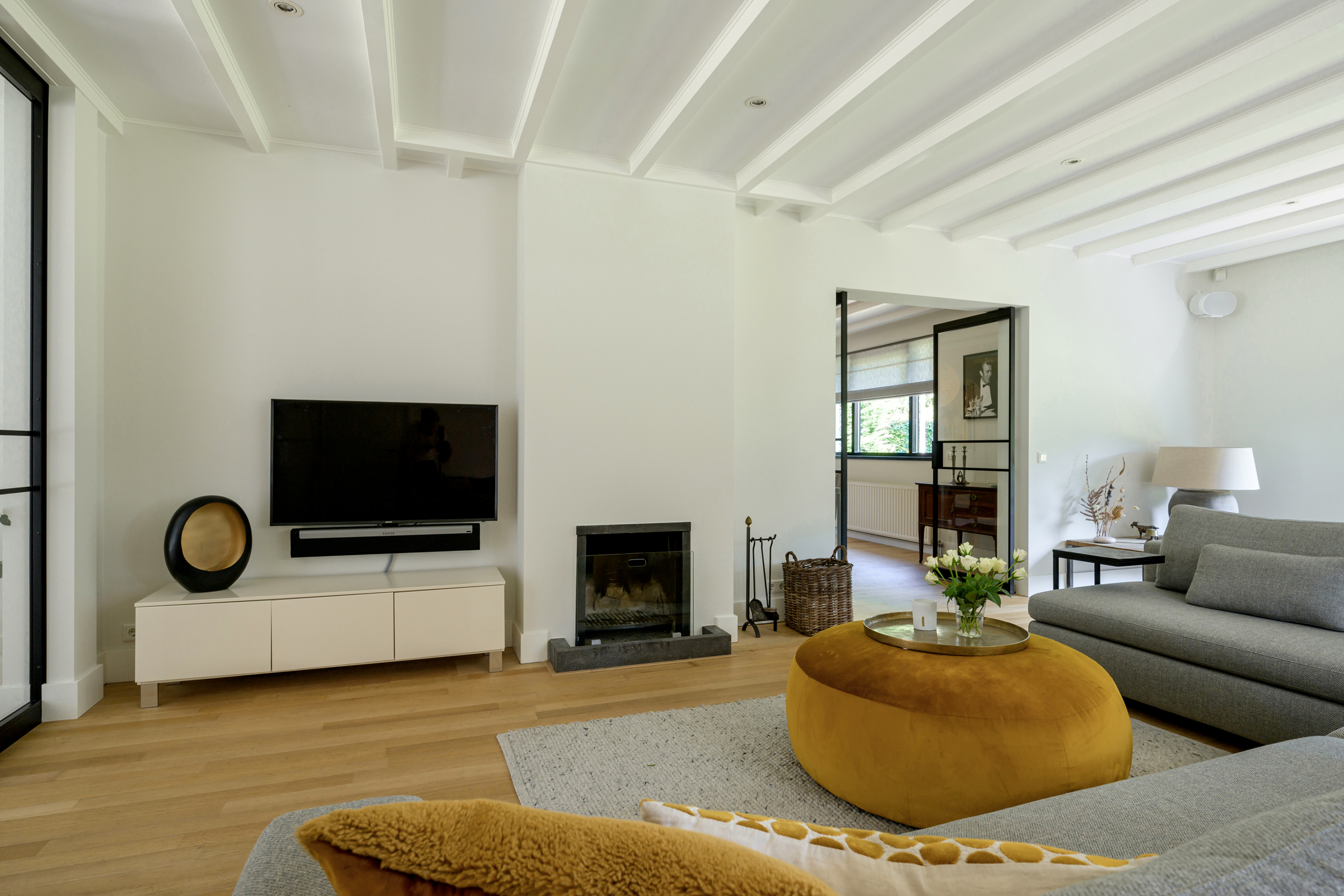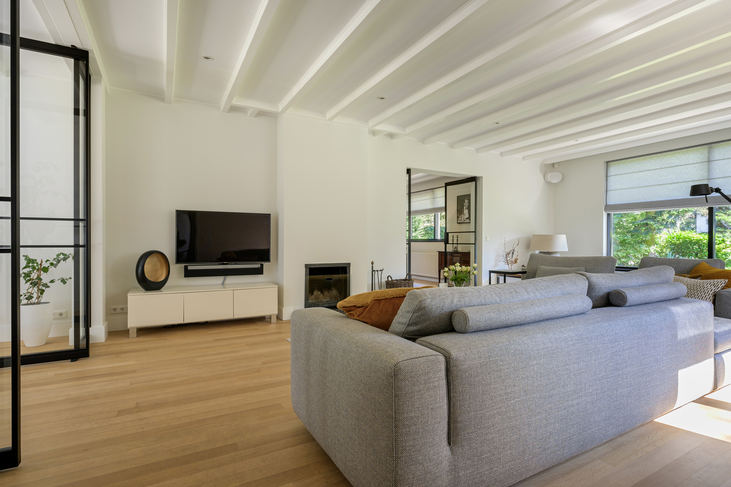 The house integrates practical sustainability with underfloor and ceiling insulation, HR++ glass, 18 solar panels, and modern heating—creating an efficient and serene environment. Large slate tiles, parquet, and solid wooden floors complement the understated character, while beamed ceilings and built-in lighting evoke a rhythmic sense of place. Living areas flow from a lounge with fireplace through glass doors to the garden, connecting seamlessly to a separate dining room and a fully equipped kitchen with utility space.