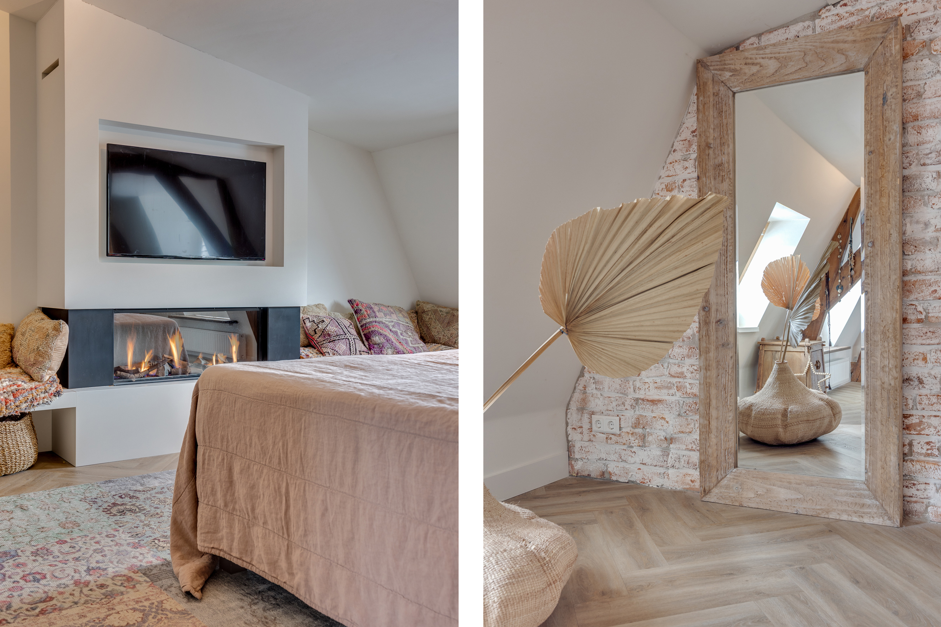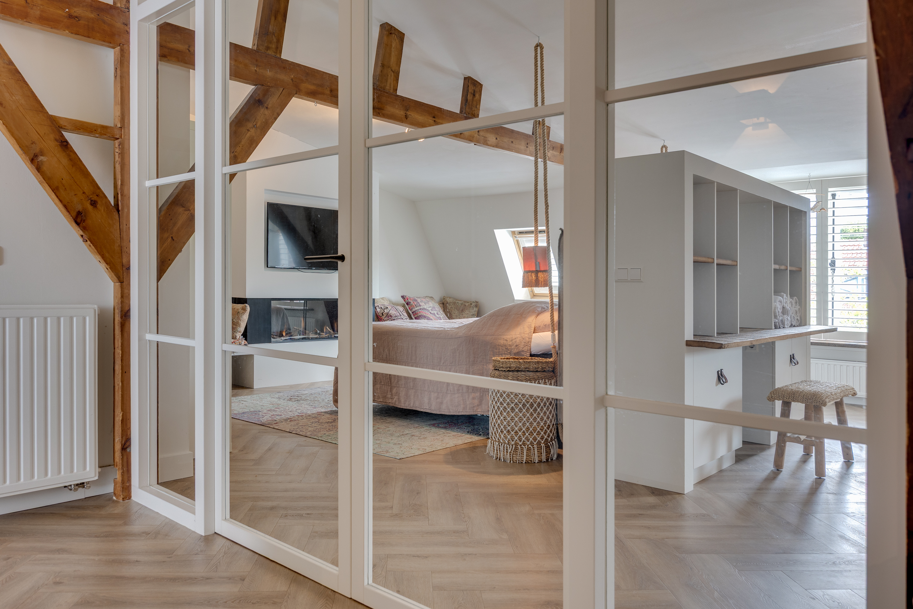 The spacious living room at the front is a real eye-catcher, with large windows that provide an abundance of natural light and offer a beautiful view of the lively Kerkbrink. The stylish PVC flooring that runs throughout the entire living area is immediately noticeable. This flooring combines a warm, soothing look with practical features such as durability and ease of maintenance. It forms the perfect basis for any interior. The modern gas fireplace creates a cozy ambiance, ideal for atmospheric evenings. In addition, the air conditioning ensures that the indoor climate remains pleasant throughout the year. Everything about this floor exudes comfort, style, and luxury.