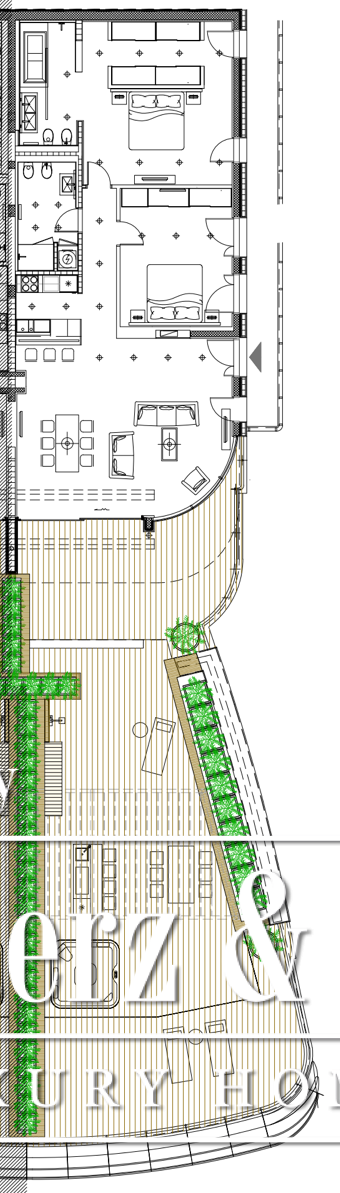 Apartment Budva offers 286m² of meticulously arranged living space within a renowned luxury resort, only 50 meters from the Adriatic Sea and its sandy stretch. This apartment Budva composition includes a welcoming hallway, a generous living room seamlessly connected to a kitchen and dining area, two bedrooms, and two bathrooms. A large rooftop terrace frames sweeping views of Budva Bay, the sea, and encircling mountains, inviting both quiet contemplation and open gatherings.