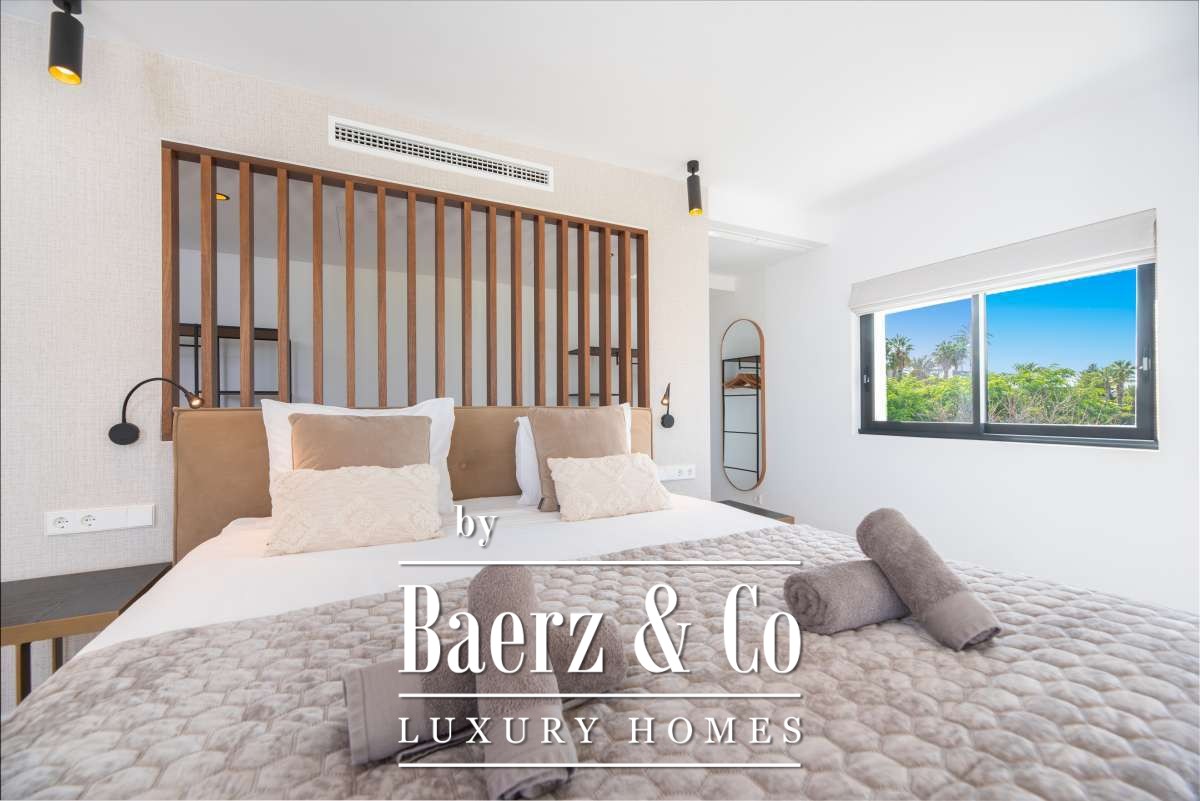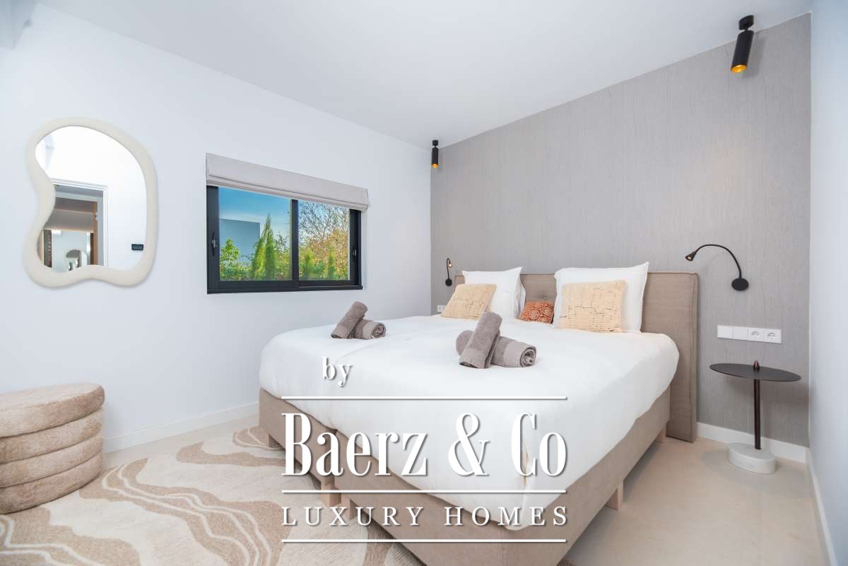 Outdoor living is celebrated with a private swimming pool, a covered patio for al fresco dining, a built-in barbecue, and multiple terraces. Landscaped gardens, a rooftop terrace, sun beds, and secure, fully fenced grounds ensure privacy and tranquility. Additional features include garage and outdoor parking, alarm system, and amenities such as internet, double glazing, and smart security. This villa in Can Ramón encapsulates refined Mediterranean living with convenient access to Ibiza’s beaches, marinas, and city life.