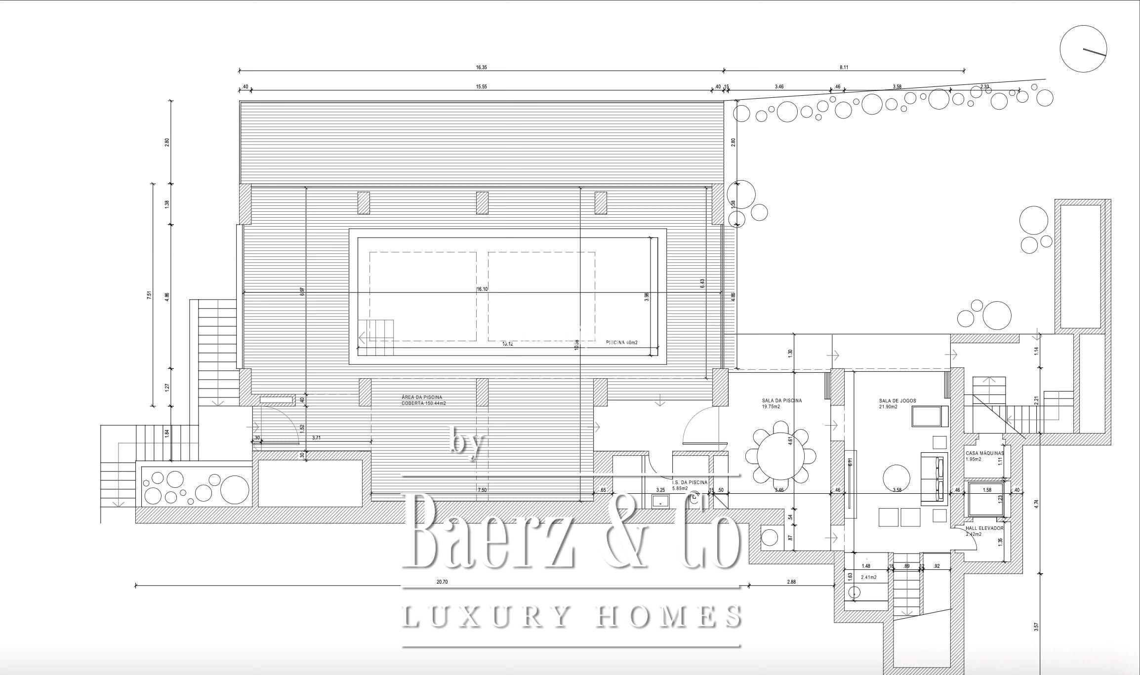 The central living and dining area measures 100 m², arranged into three subtle zones, each offering access to a panoramic wraparound terrace. These spaces flow into a generous kitchen and breakfast area, supporting both relaxed family routines and entertaining. Garden level introduces a luminous pool lounge opening directly onto landscaped grounds and a private swimming pool, enhancing the villa’s immersive indoor outdoor character.