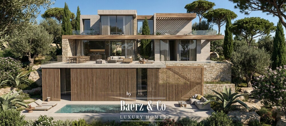Five bedrooms and six bathrooms establish both spaciousness and privacy. On the main floor, social spaces are articulated to maximize light and outlook. An interior patio divides the living zones from two tranquil bedrooms. Upstairs, the master suite commands two private terraces with sea horizons, en-suite bath, and dressing room. The basement delivers flexibility with an additional bedroom, multipurpose space, and direct access to the garden and a private 32 m² pool, all situated on a generous 1,585 m² plot.