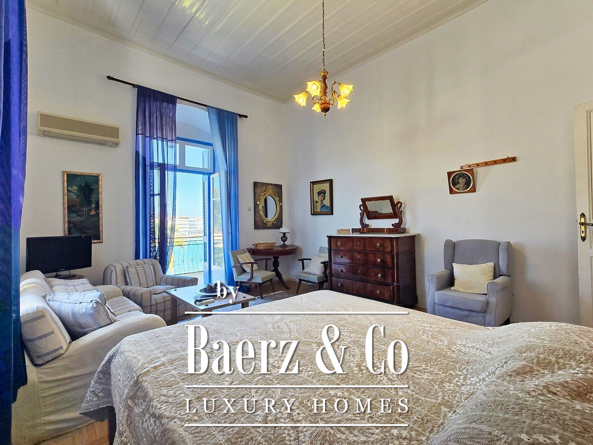 apartment we will encounter a comfortable and high-ceilinged living room. From there we are led to the five well-designed rooms, the kitchen room and the 2 bathrooms. From the 3 rooms we have access to a terrace with a magnificent view of the sea and the port. Its unique location, spacious spaces and the historicity of the building make it a rare opportunity to live in history itself, without depriving oneself of the comfort of today.