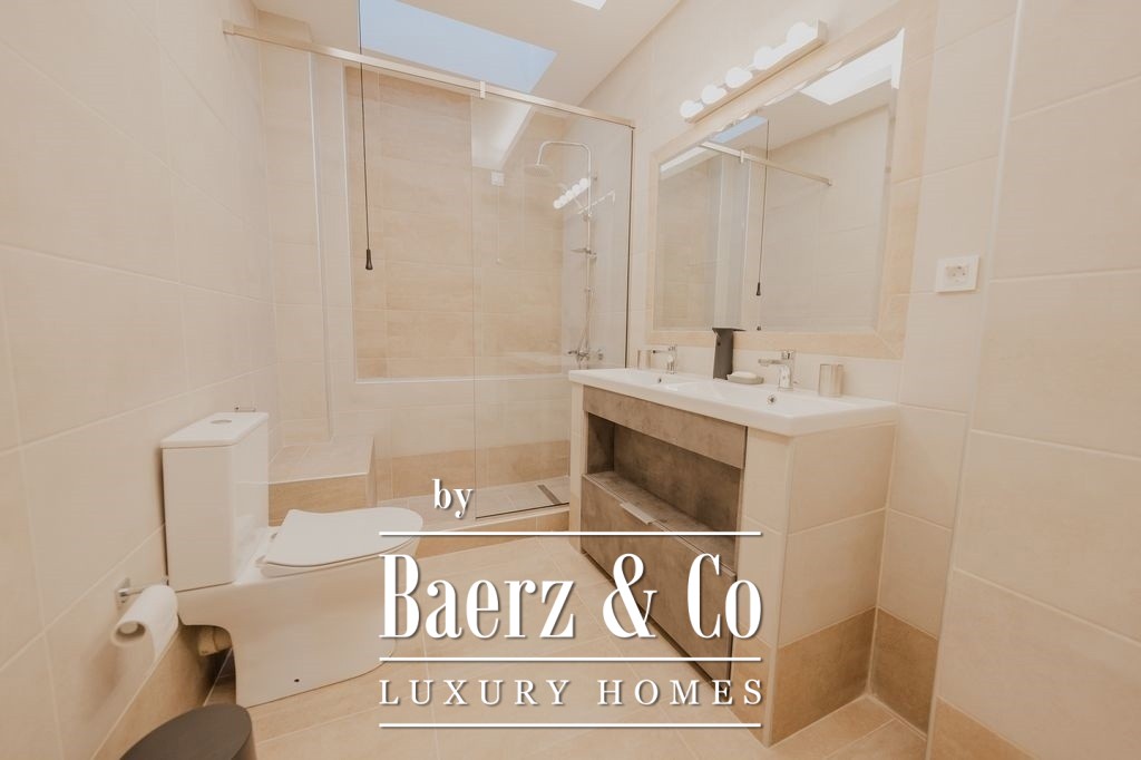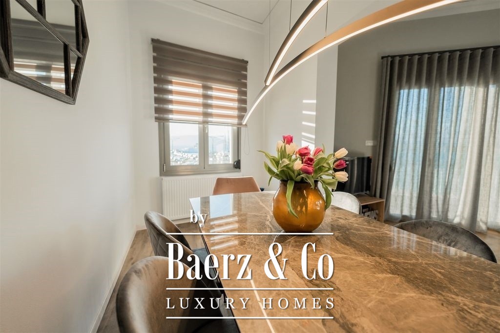 Thoughtfully renovated throughout, the apartment blends contemporary design with premium materials. The living and dining areas widen toward the waterfront balcony, inviting natural light and framing scenes of the Aegean and sunset each day. A separate, fully equipped kitchen serves both privacy and function, while each of the three bedrooms is fitted with generous wardrobes and a secure safe. Two bathrooms are designed for comfort and clarity, their modern finishes quietly reinforcing the sense of quality.