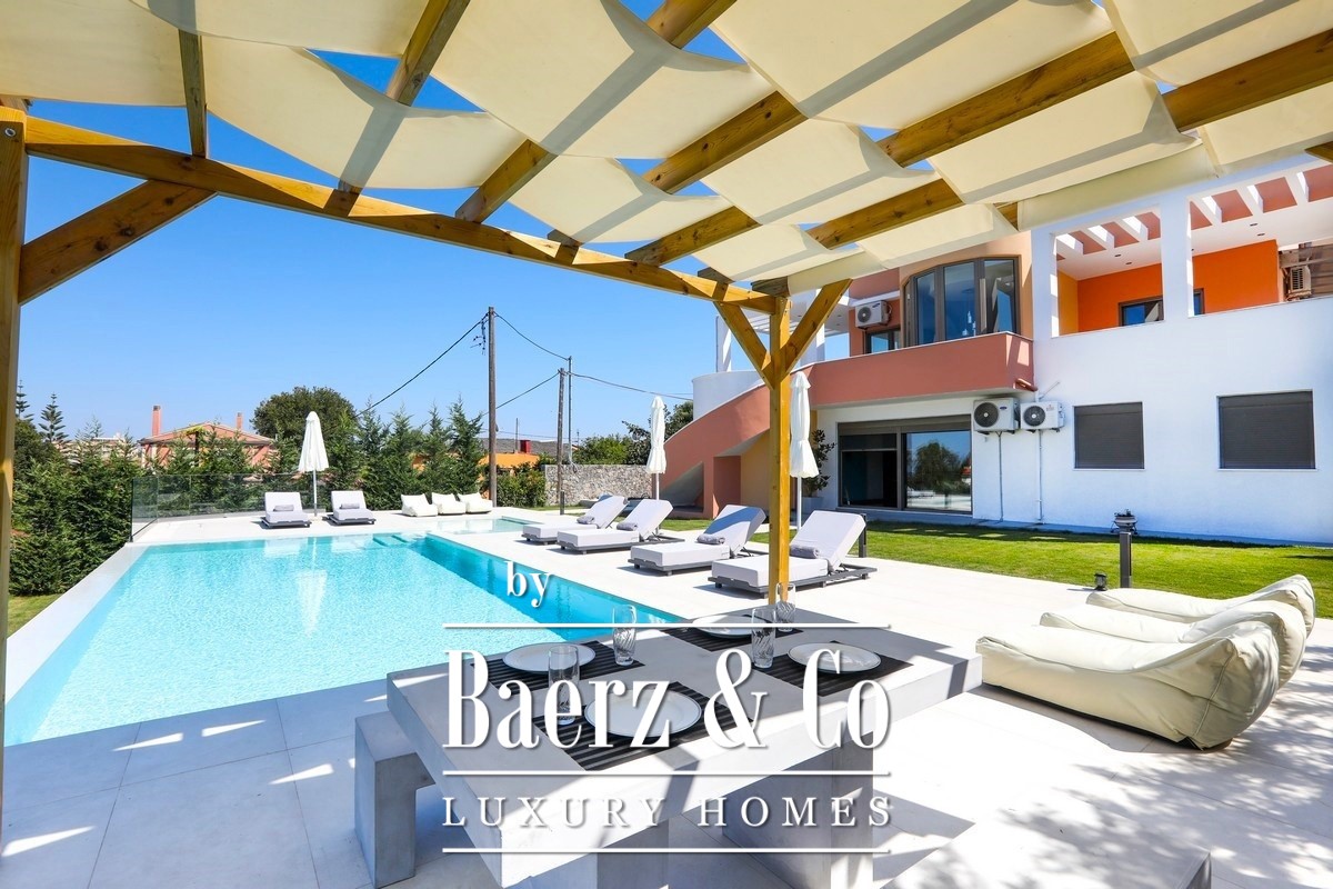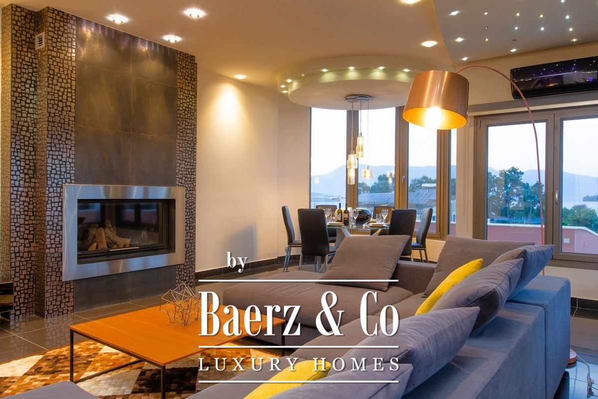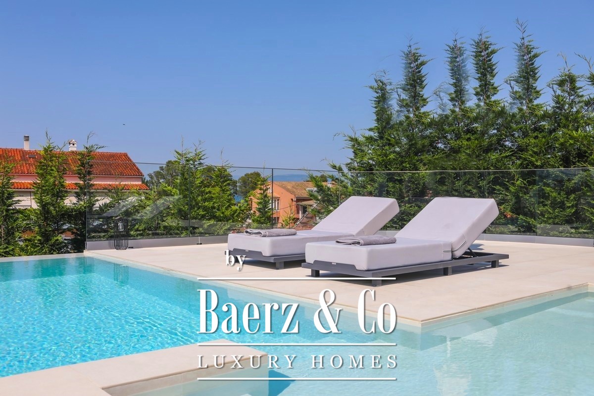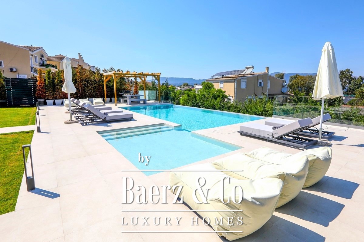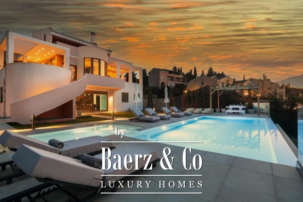 Villa Corfu offers a refined, contemporary statement in the northeast of the island, combining 497 m² of sophisticated living space with panoramic Ionian Sea views. This villa occupies a privileged plot of 1,073.59 m² in Alykes Potamou, less than four kilometers from Corfu town, the port, and international airport. The villa’s setting on a gentle hill assures privacy, with seamless access to renowned beaches including Kommeno and Paleokastritsa.