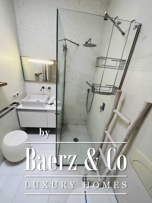 Above, a mezzanine office floats above the living space, while the top floor provides a tranquil library or creative room, a double bedroom with en-suite, and a terrace of 50 m² opening to uninterrupted sea views. The basement features a gym, music room, daylight living lounge, ample storage, and a guest suite with its own entrance and sunlit terrace.