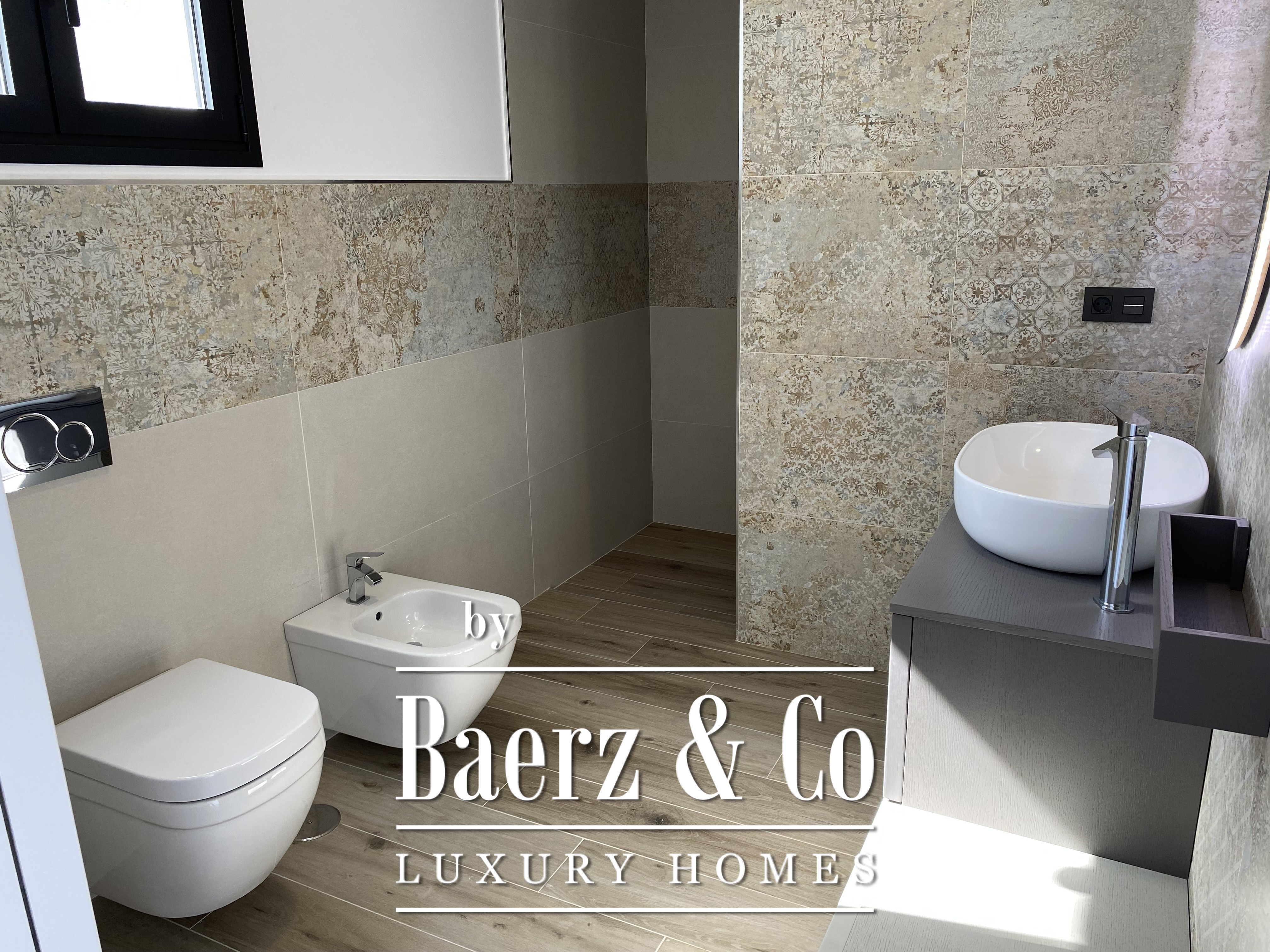 Bedrooms with en-suite bathrooms open onto private terraces, offering far-reaching views of the ocean and surrounding landscape. Features include a central air-conditioning system with a cool-air curtain on the ground floor, a solid wood floating staircase in the living area, and an office space with a guest toilet. The villa's private elevator with elegant glass doors links the garage—large enough for four to five cars and with its own bathroom—to every floor.