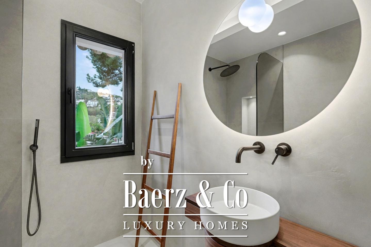The main level includes a bedroom with en-suite bathroom, while the mezzanine provides a peaceful children’s room overlooking verdant surroundings. Upstairs, the master suite features a private balcony with sea views, a spacious dressing area, and a beautifully appointed bathroom with both shower and bathtub. Two additional bedrooms and a contemporary bathroom complement family life or the hosting of guests.