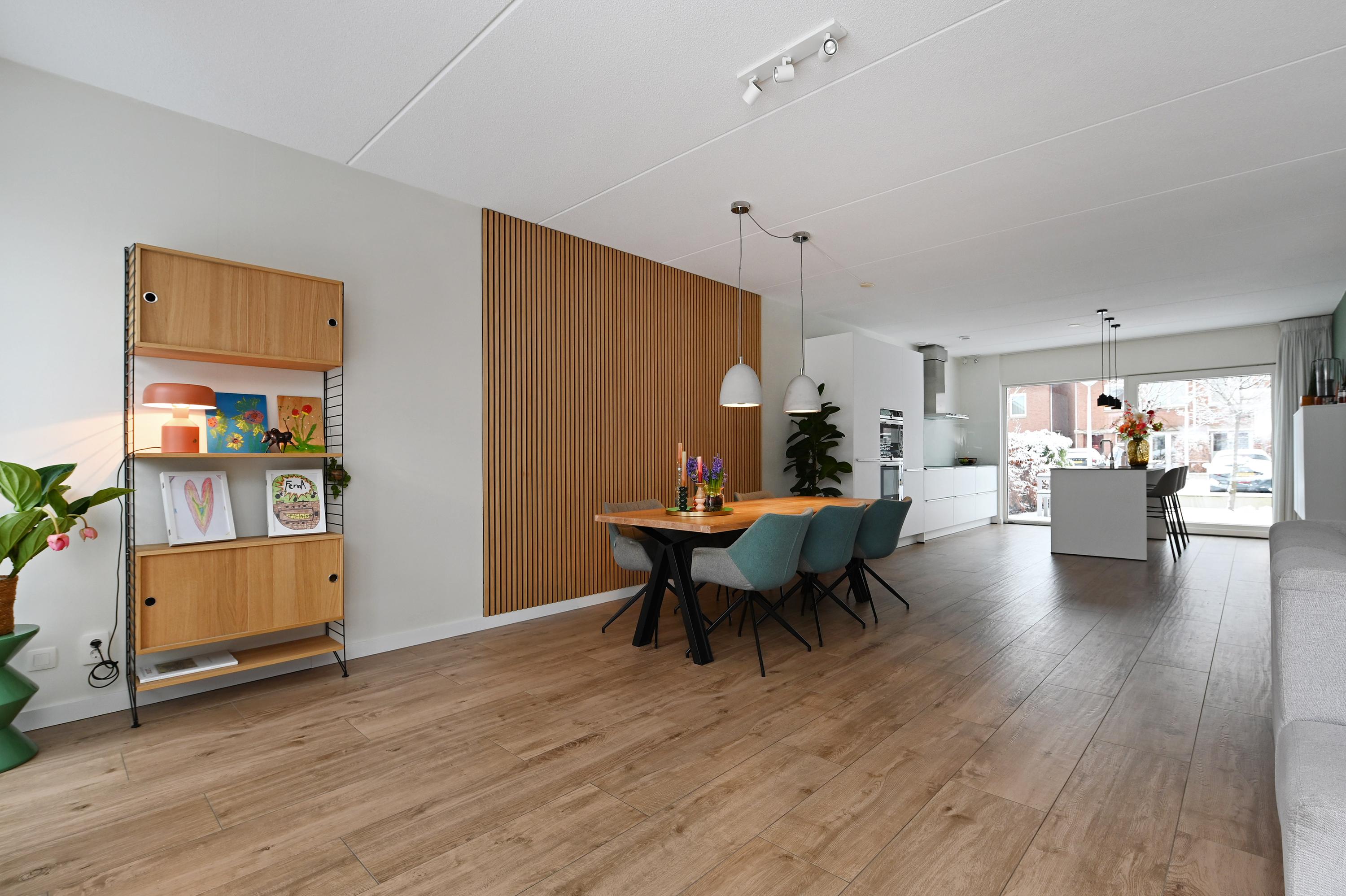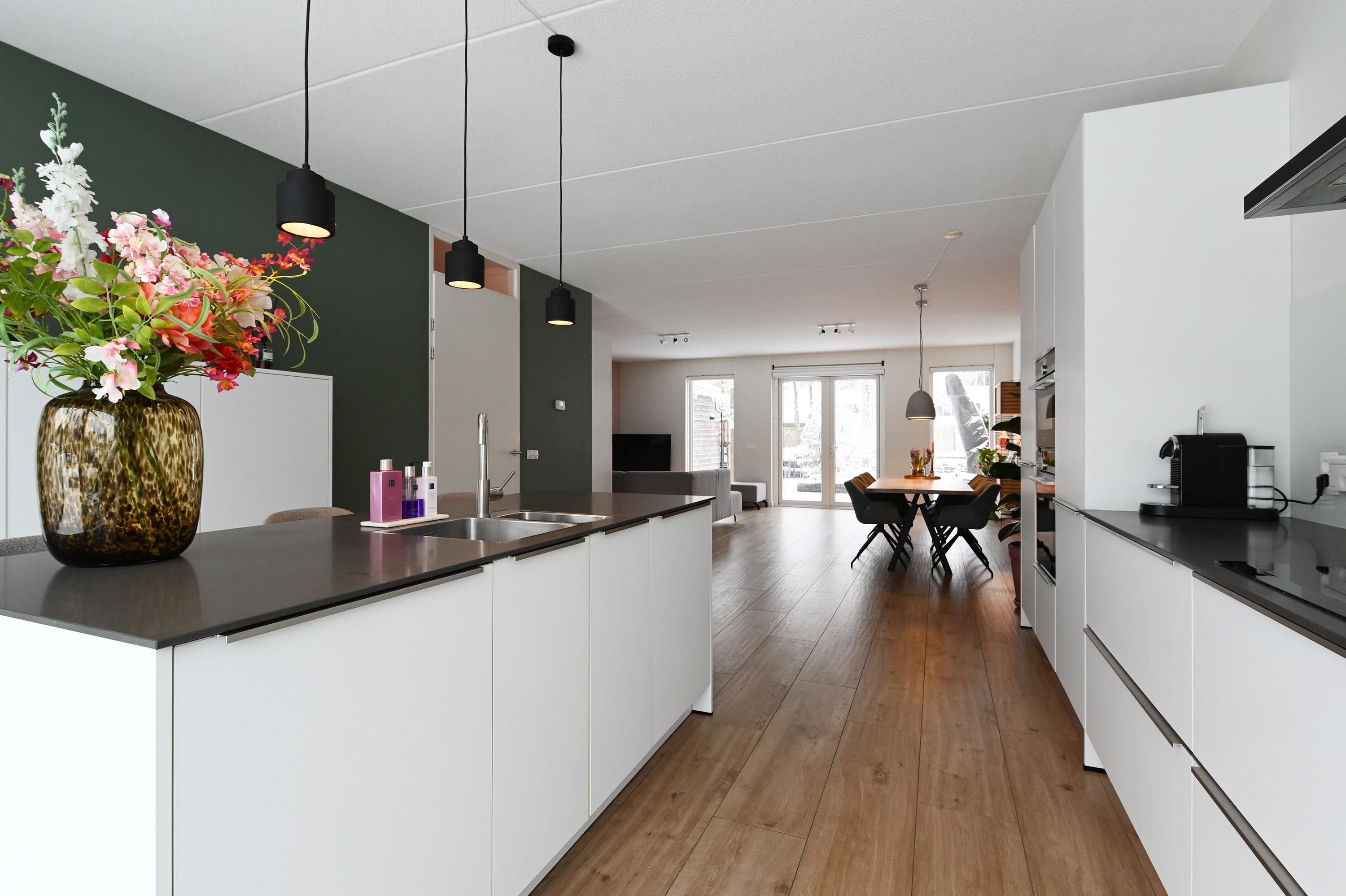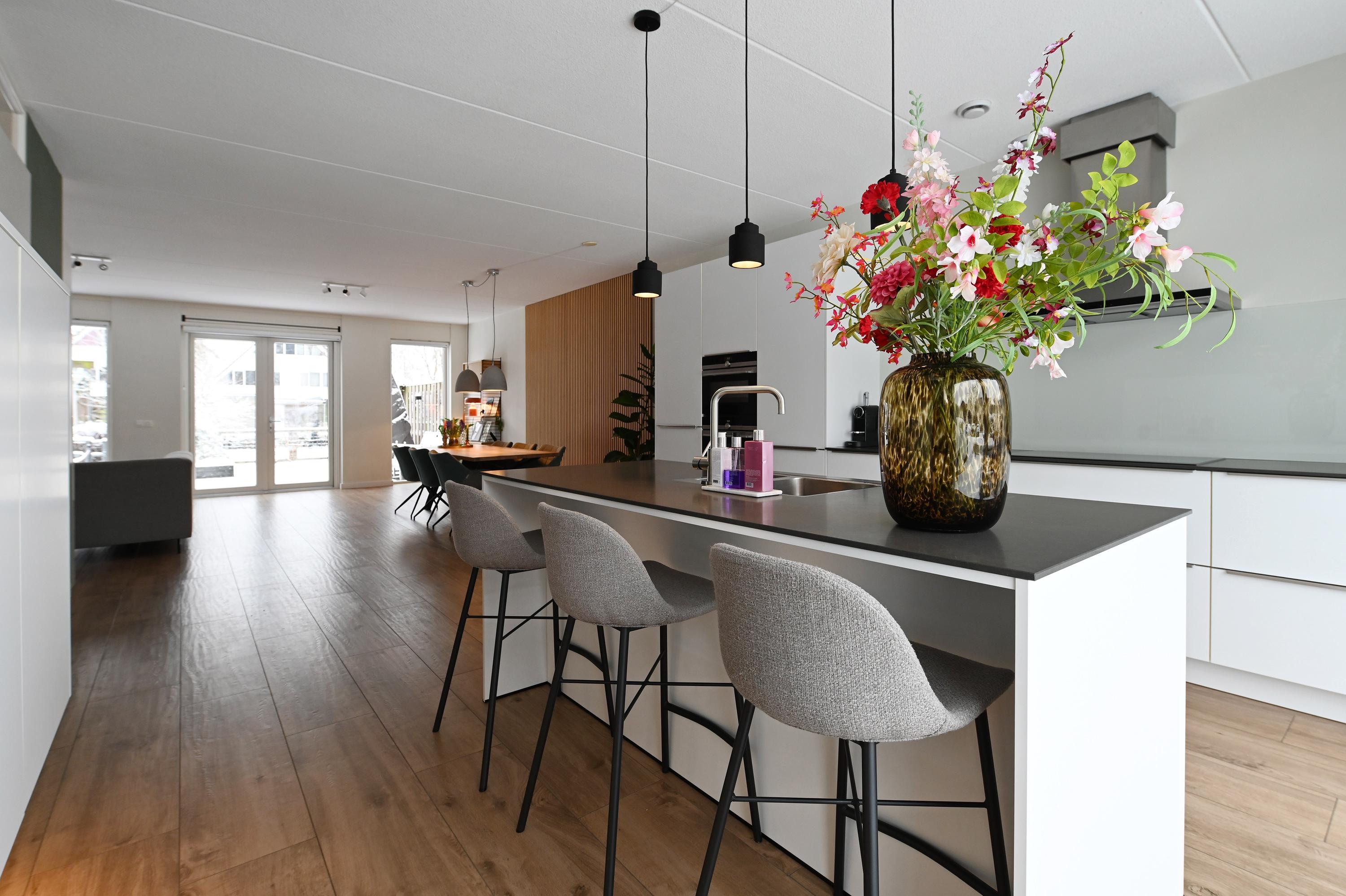 Bij binnenkomst in de woonkamer bevindt zich aan de voorzijde van het huis de ruime open keuken. De keuken is voorzien van een spoeleiland, veel kastruimte en diverse inbouwapparatuur. Via de schuifpui heb je direct toegang tot het terras in de voortuin – een heerlijke plek voor een kop koffie of een drankje in de zon.