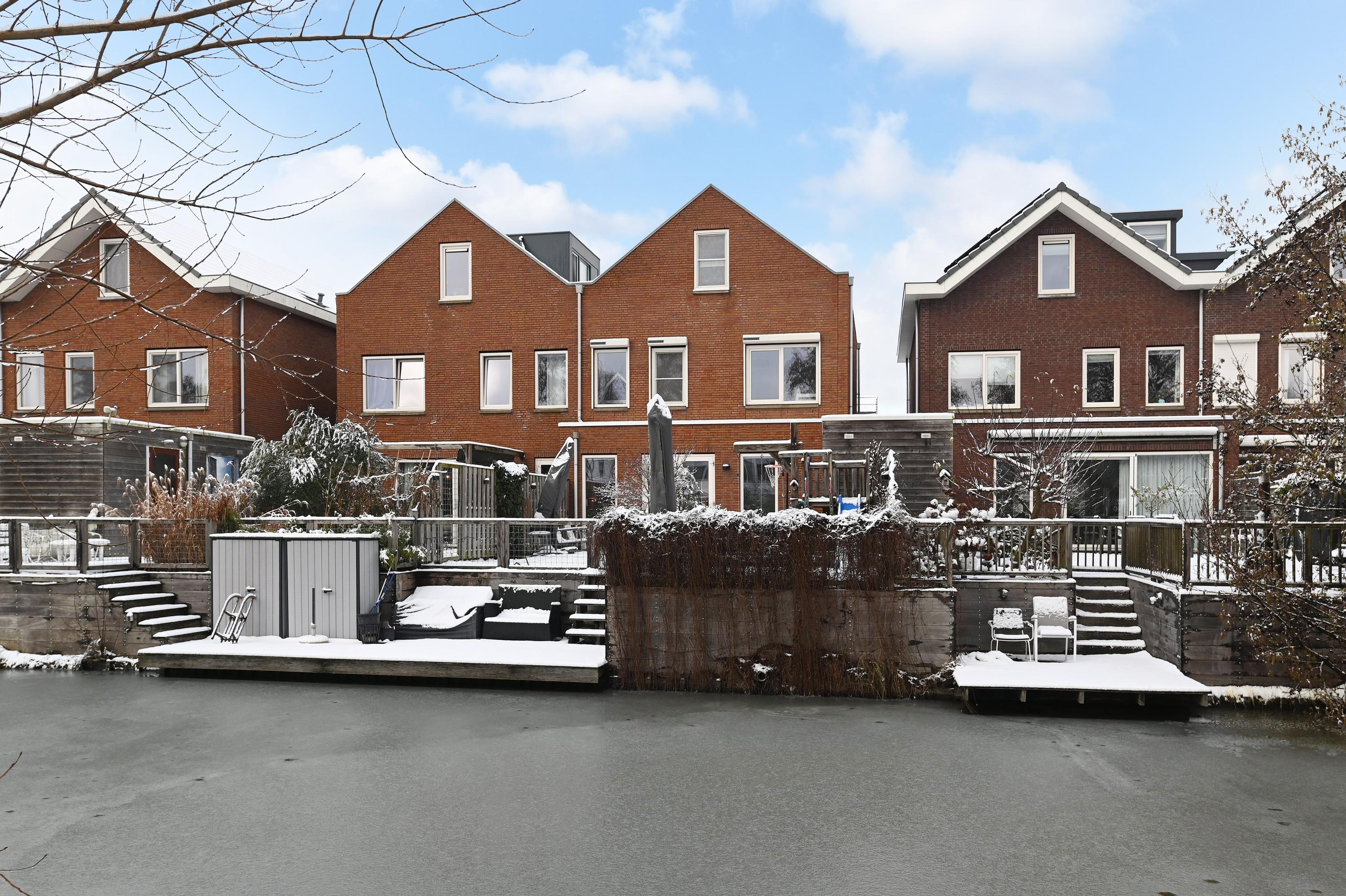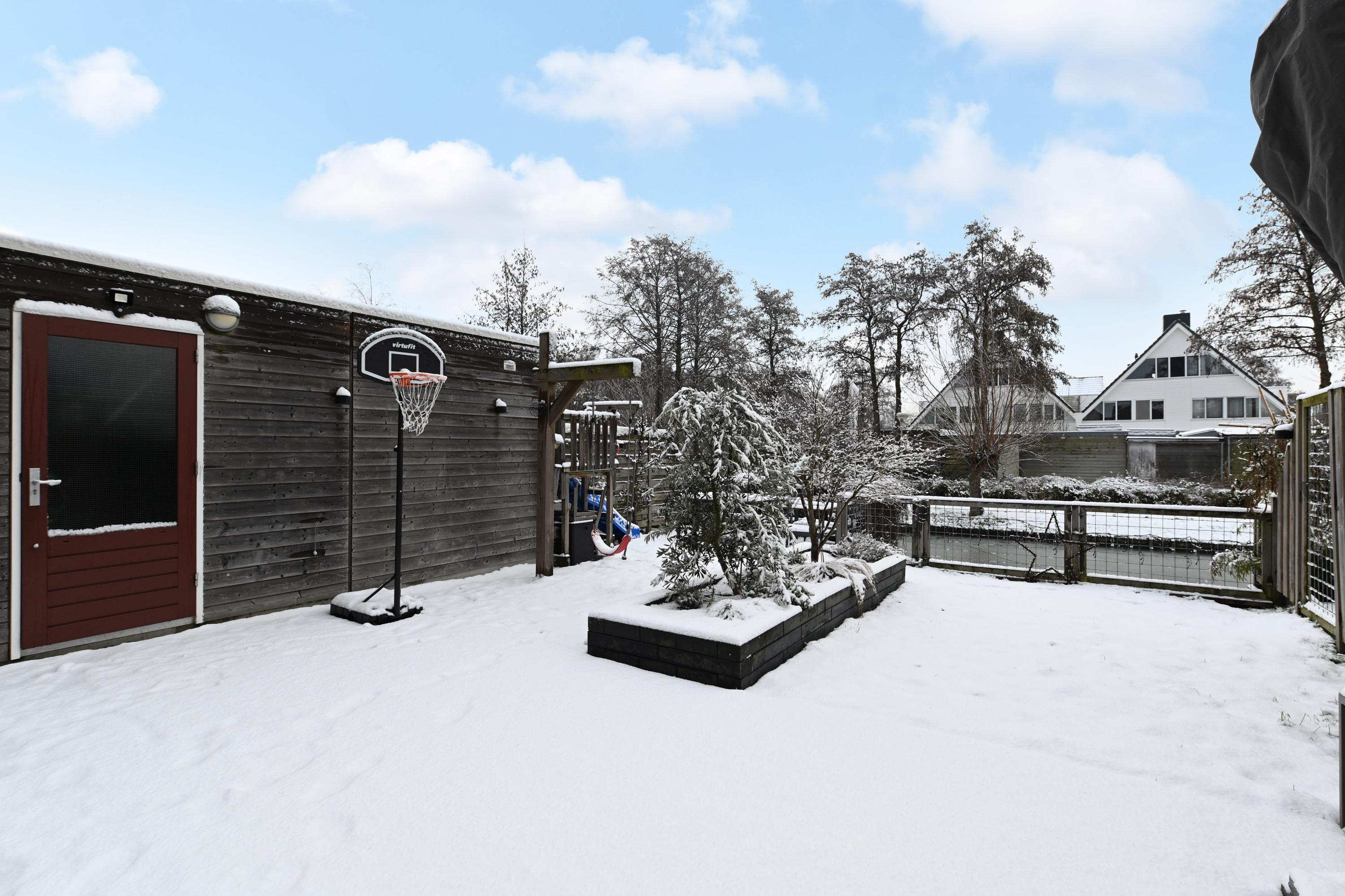 De achtertuin is gesitueerd op het zuiden en is daardoor heel zonnig. Deze tuin beschikt over een groot terras, een houten berging en een steiger aan het water. Kinderen kunnen hier met een bootje varen en in de zomer stap je hier zó vanuit je eigen tuin op je supboard! De tuin is tevens bereikbaar via de achterom langs de woning naar de straatzijde. Ideaal voor containers en om met de fiets de berging te kunnen bereiken.